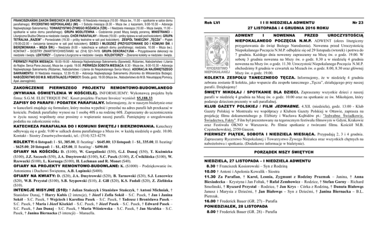 FRANCISZKAŃSKI ZAKON ŚWIECKICH (III ZAKON) - III Niedziela miesiąca (10.00 - Msza św., 11.00 – spotkanie w salce domu parafialnego). RYCERSTWO NIEPOKALANEJ (MI) – I Sobota miesiąca (8.30 – Msza św. z kazaniem, 9.00-10.30 – Adoracja Najświętszego Sakramentu). TOWARZYSTWO ŻYWEGO RÓŻAŃCA (TŻR) – I Niedziela miesiąca (10.00 – Msza święta, 11.00 – spotkanie w salce domu parafialnego). GRUPA MODLITEWNA – Codziennie przed Mszą świętą poranną. MINISTRANCI – Liturgiczna Służba Ołtarza w niedziele i święta. CHÓR PARAFIALNY – Wtorek (19.00 – próby śpiewu w sali pod kościołem). GRUPA TETRALNA „RAZEM” – Poniedziałek (19.30 – próby teatralne w sali pod kościołem). ZESPÓŁ TANECZNY „TĘCZA” – Piątek (19.00-22.00 – ćwiczenia taneczne w sali pod kościołem). DZIECI I MŁODZIEŻ (PRZYGOTOWANIE DO I KOMUNII ŚW. i BIERZMOWANIA – MSZA ŚW.) – Niedziela (9.00 – katecheza w salkach domu parafialnego; niedziela, 10.00 – Msza św.). KONTAKT – SIOSTRY ZMARTWYCHWSTANKI: tel. (514) 521-7419. GRUPA DEKORACYJNA – Przygotowanie dekoracji na niedziele i święta. LEKTORZY – Czytania Liturgiczne w niedziele i święta. KOLEKTORZY – Zbieranie kolekty w niedziele i święta. PIERWSZY PIĄTEK MIESIĄCA: 18.00-19.00 - Adoracja Najświętszego Sakramentu (Spowiedź, Różaniec, Nabożeństwo i Litania do Najśw. Serca Pana Jezusa), Msza św. o godz. 19.00. PIERWSZA SOBOTA MIESIĄCA: 8.30 - Msza św., 9.00-10.30 – Adoracja Najświętszego Sakramentu (Różaniec, Nabożeństwo i Litania do Niepokalanego Serca Maryi). ADORACJA NAJŚWIĘTSZEGO SAKRAMENTU: III Niedziela miesiąca, 12.30-15.30 – Adoracja Najświętszego Sakramentu (Koronka do Miłosierdzia Bożego). NABOŻEŃSTWO DO M.B. NIEUSTAJĄCEJ POMOCY: Środa, godz. 19.00 (Msza św., Nabożeństwo do M.B. Nieustającej Pomocy, Apel Jasnogórski). ZAKOŃCZENIE PIERWSZEGO PROJEKTU REMONTOWO-BUDOWLANEGO (WYMIANA OŚWIETLENIA W KOŚCIELE). INFORMUJEMY: Wykonawcą projektu była firma: S.G.M. ELECTRIQUE INC. Koszt projektu /Facture Invoice/ wyniósł: $5,188.33 ZAPISY DO PARAFII / PODATEK PARAFIALNY. Informujemy, że w naszym biuletynie oraz w kancelarii znajduje się formularz, który można wypełnić i przesłać na adres parafii lub przekazać w kościele. Podatek parafialny wynosi na 1 osobę 40$ a na rodzinę 60$. Zapraszamy do uczestniczenia w życiu naszej wspólnoty oraz prosimy o wspieranie naszej parafii. Pamiętajmy o uregulowaniu podatku na zakończenie roku. KATECHEZA PARAFIALNA DO I KOMUNII ŚWIĘTEJ I BIERZMOWANIA. Katechezy odbywają się o godz. 9.00 w salkach domu parafialnego a Msza św. w każdą niedzielę o godz. 10.00. Kontakt - Siostry Zmartwychwstanki, tel.: (514) 523-4279. KOLEKTY: 6 listopad: I - $1, 385.00, II /heating/ - $645.00; 13 listopad: I - $1, 335.00, II /heating/ - $625.00; 20 listopad: I - $1, 425.00, II /heating/ - $490.00. OFIARY NA KOŚCIÓŁ: D. ($100), W. Gargulinski ($50), G.J. Dunaj ($50), T. Kuźmicka ($100), J.Z. Szczech ($50), J.A. Dmytrowski ($100), S.C. Pasek ($100), Z. Ćwiklińska ($100), W. Rzewucki ($100), L. Kornaga ($100), H. Lechman and R. Monet ($40). OFIARY NA PROJEKTY REMONTOWO-BUDOWLANE: K. ($1000) – Podziękowanie św. Antoniemu i Duchowi Świętemu, A.B. Lupinski ($400). OFIARY NA KWIATY: D. ($20), J.A. Dmytrowski ($20), B. Tarnowski ($20), S.J. Lencewicz ($20), W.B. Przystał ($100), S.B. Szypowski ($10), J. Gill ($20), K.S. Fudali ($20), Z. Zielińska ($10). INTENCJE MISYJNE ($10): † Julian Stańczyk i Stanisław Stańczyk, † Antoni Michniak, † Stanisław Dunaj, † Harry Kubis (2 intencje), † Józef i Zofia Sokół – S.C. Pasek, † Jan i Janina Sokół – S.C. Pasek, † Wojciech i Karolina Pasek – S.C. Pasek, † Tadeusz i Bronisława Pasek – S.C. Pasek, † Maria i Józef Kiszkiel – S.C. Pasek, † Józef Pasek – S.C. Pasek, † Edward Pasek – S.C. Pasek, † Jan Dunaj – S.C. Pasek, † Maria Wiśniewska – S.C. Pasek, † Jan Skrabka – S.C. Pasek, † Janina Biernacka (5 intencji) – Manuella. Rok LVI I I II NIEDZIELA ADWENTU 27 LISTOPADA i 4 GRUDNIA 2016 ROKU Nr 23 ADWENT I NOWENNA PRZED UROCZYSTOŚCIĄ NIEPOKALANEGO POCZĘCIA N.M.P. ADWENT (okres liturgiczny przygotowania do świąt Bożego Narodzenia). Nowenna przed Uroczystością Niepokalanego Poczęcia N.M.P. odbędzie się od 29 listopada (wtorek) i potrwa do 7 grudnia. Każdego dnia nowenny zapraszamy na Mszę św. o godz. 19.00. W sobotę 3 grudnia nowenna na Mszy św. o godz. 8.30 a w niedzielę 4 grudnia nowenna na Mszy św. o godz. 11.30. Uroczystość Niepokalanego Poczęcia N.M.P. obchodzimy 8 grudnia w czwartek na Mszach św. o godz. 8.00, 8.30 oraz głównej Mszy św. o godz. 19.00. KOLEKTA ZESPOŁU TANECZNEGO TĘCZA. Informujemy, że w niedzielę 4 grudnia zebrana zostanie II kolekta, jako wsparcie dla zespołu tanecznego „Tęcza”, działającego przy naszej parafii. Dziękujemy! ŚWIĘTY MIKOŁAJ / SPOTKANIE DLA DZIECI. Zapraszamy wszystkie dzieci z naszej parafii w niedzielę 4 grudnia na Mszę św. o godz. 10.00 oraz na spotkanie ze św. Mikołajem, który podaruje dzieciom prezenty w sali parafialnej. KLUB GAZETY POLSKIEJ / FILM JEDWABNE. 4.XII. (niedziela), godz. 13:00 - Klub Gazety Polskiej w Montrealu we współpracy z Klubem Gazety Polskiej w Ottawie, zaprasza na projekcję filmu dokumentalnego p. Elżbiety i Wacława Kujbidów pt.: "Jedwabne. Świadkowie, Świadectwa, Fakty". Film był prezentowany na tegorocznym festiwalu filmowym w Gdyni, Krakowie oraz Festiwalu OKNO w Warszawie. Po filmie spotkanie z twórcami filmu. Kościół M.B. Częstochowskiej, 2550 Gascon. PIERWSZY PIĄTEK, SOBOTA I NIEDZIELA MIESIĄCA. Przypadają 2, 3 i 4 grudnia. Zapraszamy Rycerstwo Niepokalanej i Towarzystwo Żywego Różańca oraz wszystkich chętnych na nabożeństwa i spotkania. (Dodatkowe informacje w biuletynie). PORZĄDEK MSZY ŚWIĘTYCH NIEDZIELA, 27 LISTOPADA – I NIEDZIELA ADWENTU 8.30 † Franciszek Kosiorowski 