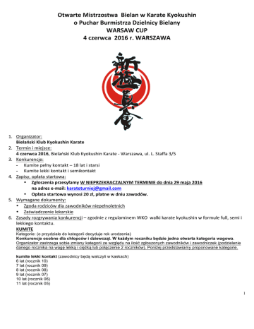 OtwarteMistrzostwaBielanwKarateKyokushin oPucharBurmistrzaDzielnicyBielany WARSAWCUP 4czerwca2016r.WARSZAWA 1. Organizator: BielańskiKlubKyokushinKarate 2. Terminimiejsce: 4czerwca2016,BielańskiKlubKyokushinKarate-Warszawa,ul.L.Staffa3/5 3. Konkurencje: - Kumitepełnykontakt–18latistarsi - Kumitelekkikontaktisemikontakt 4. Zapisy,opłatastartowa: • ZgłoszeniaprzesyłamyWNIEPRZEKRACZALNYMTERMINIEdodnia29maja2016 naadrese-mail:[email protected] • Opłatastartowawynosi20zł,płatnewdniuzawodów. 5. Wymaganedokumenty: • Zgodarodzicówdlazawodnikówniepełnoletnich • Zaświadczenielekarskie 6. Zasadyrozgrywaniakonkurencji–zgodniezregulaminemWKOwalkikaratekyokushinwformulefull,semii lekkiegokontaktu. KUMITE Kategorie: (o przydziale do kategorii decyduje rok urodzenia) Konkurencje osobne dla chłopców i dziewcząt. W każdym roczniku będzie jedna otwarta kategoria wagowa. Organizator zastrzega sobie zmiany kategorii ze względu na ilość zgłoszonych zawodników i zawodniczek (podzielenie danego rocznika na wagę lekką i ciężką lub połączenie 2 roczników). Poniżej przedstawiamy proponowane kategorie. kumite lekki kontakt (zawodnicy będą walczyli w kaskach) 6 lat (rocznik 10) 7 lat (rocznik 09) 8 lat (rocznik 08) 9 lat (rocznik 07) 10 lat (rocznik 06) 11 lat (rocznik 05) 1 kumite semi-kontakt (zawodnicy będą̨ walczyli w kaskach, rękawicach i ochraniaczach) 12 lat (rocznik 04) 13 lat (rocznik 03) 14 lat (rocznik 02) 15 lat (rocznik 01) 16 lat (rocznik 00) 17 lat (rocznik 99) kumite pełny kontakt kategoria +18 lat (od rocznika 98) kategorie do 70 kg, do 80 kg, + 80 kg Wmistrzostwachmogąwziąćudziałzawodnicyzzaproszonychklubów,posiadający: - białeczystekarate-gi - ochraniaczegoleń-stopaorazsuspensoriumiochraniaczpiersidladziewcząt - ochraniaczenapięścizdzianiny - aktualnezaświadczenielekarskie! 7. Wprzypadkuniedostatecznejilościzawodnikówwposzczególnychkategoriachmogąonezostaćpołączone. 8.30–10.00 Weryfikacjazgłoszonychzawodników 10.30 Oficjalneotwarciezawodów 10.45 Rozpoczęcierywalizacjiwkategoriach 15.00 Przewidywanezakończenie Programszczegółowyzostaniepodanypozamknięciuliststartowych–tj.po29maja2016r. 2