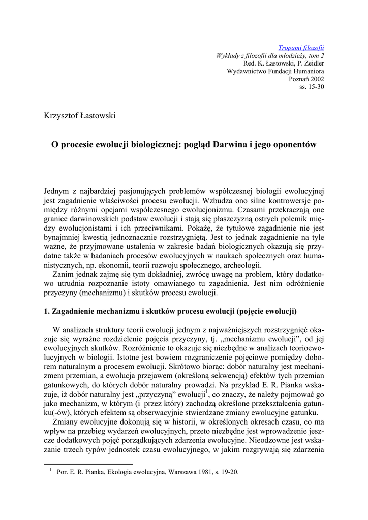 Tropami filozofii Wykłady z filozofii dla młodzieży, tom 2 Red. K. Łastowski, P. Zeidler Wydawnictwo Fundacji Humaniora Poznań 2002 ss. 15-30 Krzysztof Łastowski O procesie ewolucji biologicznej: pogląd Darwina i jego oponentów Jednym z najbardziej pasjonujących problemów współczesnej biologii ewolucyjnej jest zagadnienie właściwości procesu ewolucji. Wzbudza ono silne kontrowersje pomiędzy różnymi opcjami współczesnego ewolucjonizmu. Czasami przekraczają one granice darwinowskich podstaw ewolucji i stają się płaszczyzną ostrych polemik między ewolucjonistami i ich przeciwnikami. Pokażę, że tytułowe zagadnienie nie jest bynajmniej kwestią jednoznacznie rozstrzygniętą. Jest to jednak zagadnienie na tyle ważne, że przyjmowane ustalenia w zakresie badań biologicznych okazują się przydatne także w badaniach procesów ewolucyjnych w naukach społecznych oraz humanistycznych, np. ekonomii, teorii rozwoju społecznego, archeologii. Zanim jednak zajmę się tym dokładniej, zwrócę uwagę na problem, który dodatkowo utrudnia rozpoznanie istoty omawianego tu zagadnienia. Jest nim odróżnienie przyczyny (mechanizmu) i skutków procesu ewolucji. 1. Zagadnienie mechanizmu i skutków procesu ewolucji (pojęcie ewolucji) W analizach struktury teorii ewolucji jednym z najważniejszych rozstrzygnięć okazuje się wyraźne rozdzielenie pojęcia przyczyny, tj. „mechanizmu ewolucji”, od jej ewolucyjnych skutków. Rozróżnienie to okazuje się niezbędne w analizach teorioewolucyjnych w biologii. Istotne jest bowiem rozgraniczenie pojęciowe pomiędzy doborem naturalnym a procesem ewolucji. Skrótowo biorąc: dobór naturalny jest mechanizmem przemian, a ewolucja przejawem (określoną sekwencją) efektów tych przemian gatunkowych, do których dobór naturalny prowadzi. Na przykład E. R. Pianka wskazuje, iż dobór naturalny jest „przyczyną” ewolucji1, co znaczy, że należy pojmować go jako mechanizm, w którym (i przez który) zachodzą określone przekształcenia gatunku(-ów), których efektem są obserwacyjnie stwierdzane zmiany ewolucyjne gatunku. Zmiany ewolucyjne dokonują się w historii, w określonych okresach czasu, co ma wpływ na przebieg wydarzeń ewolucyjnych, przeto niezbędne jest wprowadzenie jeszcze dodatkowych pojęć porządkujących zdarzenia ewolucyjne. Nieodzowne jest wskazanie trzech typów jednostek czasu ewolucyjnego, w jakim rozgrywają się zdarzenia 1 Por. E. R. Pianka, Ekologia ewolucyjna, Warszawa 1981, s. 19-20. ewolucyjne. Są nimi: epoka gatunkowa, faza ewolucyjna i pokolenie gatunku. Epoka gatunkowa obejmuje przedział czasu od momentu ewolucyjnego powstania gatunku do momentu jego ewolucyjnej śmierci (wymarcia); innymi słowy jest to historia gatunku. Faza ewolucyjna to przedział obejmujący czas od momentu powstania danego gatunku do momentu wydania przezeń nowego gatunku. Przedział – wyznaczony z jednej strony momentem wydania potomstwa w danym gatunku a momentem wydania potomstwa przez to potomstwo – nosi miano pokolenia (generacji). Związek pomiędzy tymi kategoriami polega na tym, że pokolenia składają się na fazę ewolucyjną, a ta zawiera się w epoce gatunkowej. Poczynione wyżej ustalenia umożliwiają zrozumienie głównego przesłania pracy K. Darwina „O powstawaniu gatunków”2. 2. Obraz gradualistyczny i punktualistyczny ewolucji Zagadnienie właściwości procesu ewolucyjnego pojmowane było przez długi czas w dość uproszczony sposób. Gatunek biologiczny, poddawany presji ewolucyjnej ze strony różnorakich czynników stymulujących lub hamujących jego przemiany rozwojowe, traktowany był jako szczególnie odporny na zakłócenia ewolucyjne. Nie łatwo było go „wytrącić” z zadanego toru ewolucji, a główną przeszkodę na tej drodze stanowiła „inercja ewolucyjna”. Pogląd ten zyskał przez dziesięciolecia wielu zwolenników: od E. Mayra i T. Dobzhansky’ego poczynając, po dzisiejsze liczne grona badaczy3. Uzasadnienia dla głoszonych przez siebie racji badacze ci poszukiwali w dziele Darwina, powołując się najczęściej na jego słowa, w których opisuje on przebieg procesu ewolucyjnego. Przez długie lata doktryna ta upowszechniła się tak szeroko, że zdominowała pojmowanie ewolucji, zyskując miano gradualizmu. Ujęcie to wyrażają następujące tezy: (a) w toku ewolucji „nowy gatunek powstaje przez przekształcenie populacji rodzicielskiej w zmienioną populację potomną, (b) przekształcenie odbywa się powoli i regularnie, (c) przekształceniu podlega duża liczba osobników – zazwyczaj cały gatunek (cała populacja), (d) przekształcenie dokonuje się na całym lub na większej części obszaru geograficznego gatunku rodzicielskiego”4. W zwięzłej postaci powiemy zatem, że gradualistyczny obraz ewolucji to powolne i regularne przekształcanie całego gatunku. Zakłada się ponadto, iż zmiany gradualistyczne mają charakter stopniowy, wręcz niedostrzegalny, a powstające różnice morfologiczne – a więc w budowie organizmów – układają się w toku ewolucji odpowiednio do niedoskonałości zarejestrowanych w materiale kopalnym. W 1972 roku dwaj ewolucjoniści amerykańscy: S. J. Gould i N. Eldredge, starając się podważyć ten pogląd, zakwestionowali panujący dotąd obraz ewolucji. Dokonali tego powołując się także na dzieło Darwina „O powstawaniu gatunków”. W opinii Rhodesa pogląd ten oddają dokładnie tezy następujące: (a’) „nowe gatunki powstają drogą rozszczepienia linii filetycznej, (b’) nowe gatunki rozwijają się szybko, (c’) ma2 K. Darwin, O powstawaniu gatunków drogą doboru naturalnego, czyli o utrzymywaniu się doskonalszych ras w walce o byt, w: Dzieła wybrane, PWN, Warszawa 1960, t. II. 3 Por. np. E. Mayr, Populacje, gatunki, ewolucja, PWN, Warszawa 1974 oraz T. Dobzhansky, Genetics and the Origin of Species, New York 1937; także K. Łastowski, Rozwój teorii ewolucji. Studium metodologiczne