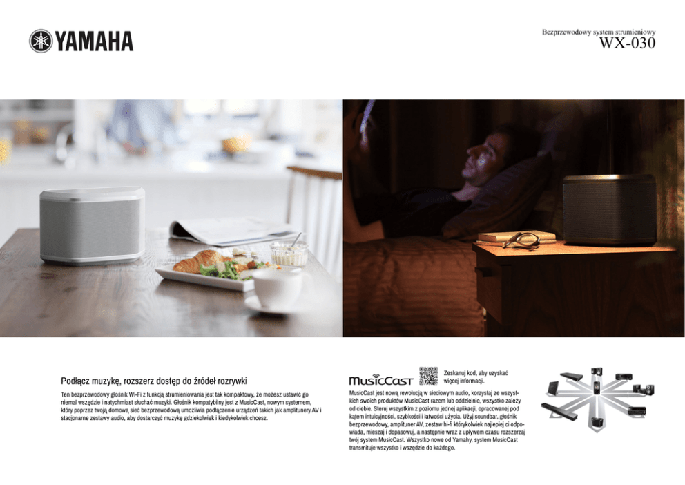 Bezprzewodowy system strumieniowy WX-030 Podłącz muzykę, rozszerz dostęp do źródeł rozrywki Ten bezprzewodowy głośnik Wi-Fi z funkcją strumieniowania jest tak kompaktowy, że możesz ustawić go niemal wszędzie i natychmiast słuchać muzyki. Głośnik kompatybilny jest z MusicCast, nowym systemem, który poprzez twoją domową sieć bezprzewodową umożliwia podłączenie urządzeń takich jak amplitunery AV i stacjonarne zestawy audio, aby dostarczyć muzykę gdziekolwiek i kiedykolwiek chcesz. Zeskanuj kod, aby uzyskać więcej informacji. MusicCast jest nową rewolucją w sieciowym audio, korzystaj ze wszystkich swoich produktów MusicCast razem lub oddzielnie, wszystko zależy od ciebie. Steruj wszystkim z poziomu jednej aplikacji, opracowanej pod kątem intuicyjności, szybkości i łatwości użycia. Użyj soundbar, głośnik bezprzewodowy, amplituner AV, zestaw hi-fi którykolwiek najlepiej ci odpowiada, mieszaj i dopasowuj, a następnie wraz z upływem czasu rozszerzaj twój system MusicCast. Wszystko nowe od Yamahy, system MusicCast transmituje wszystko i wszędzie do każdego. Wszystko połączone w jedną sieć Odtwarzaj zawartość z dowolnego urządzenia kompatybilnego z MusicCast - bądź podłączonego do niego dowolnego odtwarzacza Blu-ray lub CD - w dowolnym pokoju w twoim domu. Możesz również łączyć się wykorzystując DLNA, aby korzystać z muzyki zgromadzonej na twoim PC lub dysku NAS. Słuchaj muzyki dzięki Bluetooth i z muzycznych serwisów strumieniowych Przesyłaj muzykę bezpośrednio z twojego smartfonu lub tabletu poprzez Bluetooth i ciesz się nieograniczonymi zasobami z komercyjnych serwisów strumieniowych. Wykorzystaj aplikację MusicCast Controller aby rozpoczynać/ zatrzymywać odtwarzanie i regulować głośność z poziomu twojego urządzenia mobilnego. Łączność Bluetooth ułatwia przesyłanie muzyki WX-030 wyposażony jest w najnowszą technologię Bluetooth, gwarantując jeszcze łatwiejszą bezprzewodową obsługę niż dotychczas. Możesz przesyłać muzykę z WX-030 do słuchawek Bluetooth, w przypadku osobistego odsłuchu, lub do głośników Bluetooth, aby cieszyć się muzyką w innym pomieszczeniu. WX-030 Słuchawki Bluetooth Głośniki Bluetooth Łatwa konfiguracja z poziomu smartfonu lub tabletu Korzystaj z twojego smartfonu lub tabletu wraz z aplikacją MusicCast Controller, aby sterować głośnikiem oraz szybko i łatwo zmieniać ustawienia. Te same funkcje aplikacji Controller jak w pilocie także dla wszystkich twoich urządzeń kompatybilnych z MusicCast. Bogatszy dźwięk i głębszy bas w niewielkim urządzeniu Swój niesamowity dźwięk urządzenie zawdzięcza dwudrożnej konstrukcji głośnika połączonej z magicznym układem DSP Yamahy. Duży, pasywny radiator jest kluczowym elementem, który umożliwia tej kompaktowej konstrukcji odtworzenie głębokiego basu, podczas gdy wbudowany Music Enhancer wygładza zniekształcenia wysokich i średnich tonów charakterystycznych dla zbyt mocno skompresowanych plików MP3. WX-030 obsługuje w pełni także formaty wysokiej rozdzielczości, m.in. WAV, FLAC i ALAC. Od popu do rocka - wszystko brzmi tak, jak powinno. Czyste wzornictwo, łatwość użytkowania biały Czyste, proste wzornictwo głośnika oraz jego kompaktowe rozmiary czynią go idealnym do ustawienia np. w kuchni lub przy łóżku. Możesz nawet zawiesić go na ścianie. Jeden dotykowy przycisk włącza głośnik, otwierając nieskończone możliwości, aby czerpać przyjemność z twojego bezprzewodowego głośnika WX-030. czarny System głośnikowy 9-cm niskotonowy x 1, 3-cm wysokotonowy x 1, pasywny radiator x 1 Pasmo przenoszenia 60 Hz - 20 kHz Funkcje sieciowe [Połączenia sieciowe] przewodowe, bezprzewodowe: Wi-Fi [Bluetooth] Ver. 2.1+EDR, (profil) A2DP, AVRCP, (kodek audio) Sink: SBC, AAC, Źródło: SBC Zużycie energii w trybie czuwania 2 W (sieciowy tryb czuwania), 0,5 W (oszczędzanie energii) Wymiary (S x W x G) 243 x 157 x 113 mm Waga 2,2 kg • Logo Wi-Fi Certified jest znakiem certyfikacyjnym Wi-Fi Alliance. Znak identyfikacyjny Wi-Fi Protected Setup jest znakiem Wi-Fi Alliance. • DLNATM i DLNA CERTIFIEDTM są znakami towarowymi lub zarejestrowanymi znakami towarowymi Digital Living Network Alliance. Wszystkie prawa zastrzeżone. Nieupoważnione użycie jest ściśle zakazane. • Spotify i logo Spotify są znakami towarowymi Spotify Group. • Napster i logo Napster są znakami towarowymi lub zarejestrowanymi znakami towarowymi Rhapsody International. • JUKE i logo JUKE są zarejestrowanymi znakami towarowymi Media-Saturn-Holding GmbH. • Znak słowny Bluetooth i logo są zarejestrowanymi znakami towarowymi należącymi do Bluetooth SIG, Inc.
