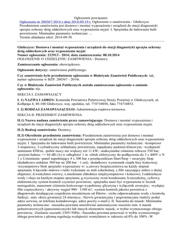 Ogłoszenie powiązane: Ogłoszenie nr 200367-2014 z dnia 2014-09-19 r. Ogłoszenie o zamówieniu - Głubczyce Przedmiotem zamówienia jest dostawa i montaż wyposażenia i urządzeń do stacji diagnostyki sprzętu ochrony dróg oddechowych oraz wyposażenia myjni: I. Sprężarka do ładowania butli powietrzem: Minimalne parametry techniczne: ... Termin składania ofert: 2014-09-30 Głubczyce: Dostawa i montaż wyposażenia i urządzeń do stacji diagnostyki sprzętu ochrony dróg oddechowych oraz wyposażenia myjni Numer ogłoszenia: 212913 - 2014; data zamieszczenia: 08.10.2014 OGŁOSZENIE O UDZIELENIU ZAMÓWIENIA - Dostawy Zamieszczanie ogłoszenia: obowiązkowe. Ogłoszenie dotyczy: zamówienia publicznego. Czy zamówienie było przedmiotem ogłoszenia w Biuletynie Zamówień Publicznych: tak, numer ogłoszenia w BZP: 200367 - 2014r. Czy w Biuletynie Zamówień Publicznych zostało zamieszczone ogłoszenie o zmianie ogłoszenia: nie. SEKCJA I: ZAMAWIAJĄCY I. 1) NAZWA I ADRES: Komenda Powiatowa Państwowej Straży Pożarnej w Głubczycach, ul. Kołłątaja 4, 48-100 Głubczyce, woj. opolskie, tel. 774710850, faks 774710852. I. 2) RODZAJ ZAMAWIAJĄCEGO: Administracja rządowa terenowa. SEKCJA II: PRZEDMIOT ZAMÓWIENIA II.1) Nazwa nadana zamówieniu przez zamawiającego: Dostawa i montaż wyposażenia i urządzeń do stacji diagnostyki sprzętu ochrony dróg oddechowych oraz wyposażenia myjni. II.2) Rodzaj zamówienia: Dostawy. II.3) Określenie przedmiotu zamówienia: Przedmiotem zamówienia jest dostawa i montaż wyposażenia i urządzeń do stacji diagnostyki sprzętu ochrony dróg oddechowych oraz wyposażenia myjni: I. Sprężarka do ładowania butli powietrzem: Minimalne parametry techniczne: -kompresor 3-stopniowy, 3-cylindryczny schładzany powietrzem, napędzany paskiem klinowym; -wydajność minimum 450l/m; -pobór mocy nie większy niż 11 kW; -maksymalne ciśnienie robocze 350 bar; -poziom hałasu: =< 64 dB (A) w odległości 1 m -silnik elektryczny do podłączenia do 3 x 400V x N 1 x Uziemienie -panel napełniający 4 x 300 bar z przełącznikiem Start/Stop + awaryjny Stop (dodatkowo reduktor 300 bar na 200 bar - 1 szt); -dodatkowy wymiennik ciepła fazy końcowej; -trzystopniowy blok sprężarki wyposażony w: a.zawory bezpieczeństwa na każdy stopień sprężania; b.łączniki stalowe i rurki wykonane ze stali szlachetnej; c.filtr zasysający mikro o dużej objętości; d.wentylator osiowy; e.miedziane chłodnice międzystopniowe i końcowe; f.oddzielacze wody i oleju na każdym stopniu sprężania; g.wyciszony zrzut kondensatu; h.niezależny, cyfrowy, elektroniczny system kontroli czystości powietrza; -sprężarka musi być wyposażona w licznik motogodzin, manometr ciśnienia końcowego wypełniony gliceryną i wyłącznik awaryjny; -wydajny filtr cząsteczkowy / aktywny węgiel 900 - 1100 m³; -system kontroli jakości powietrza z długotrwale działającym czujnikiem niezależnym od filtrów; -ciche odprowadzanie wody z kontrolą funkcji; -min. okres gwarancji 24 miesięcy; -Serwis gwarancyjny i pogwarancyjny (należy podać adres serwisu, nr telefonu kontaktowego, adres poczty e-mail:); II. Suszarka do masek: Minimalne parametry techniczne: -suszarka powinna umożliwiać automatyczne suszenie min. 6 masek pełnotwarzowych (panoramicznych) lub innych elementów masek, w trybie wymuszonego obiegu powietrza; -Zasilanie suszarki 230V/50Hz; -Suszarka powinna pracować w trybie wymuszonego obiegu powietrza z płynną regulacją wydajności wentylatora w zakresie od 0% do 100% -W komorze suszarki powinny się mieścić jednocześnie min. dwa kosze stanowiące wyposażenie myjki -Obudowa ze stali nierdzewnej, odporna na zarysowania, wytrzymała i trwała, z tyłu ze stali ocynkowanej. -Komora suszarki powinna być wykonana ze stali nierdzewnej. Nie dopuszcza się zastosowanie stali galwanizowanej, powlekanej farbą -Suszarka musi posiadać podwójną ochronę przed przegrzaniem: monitorowanie temperatury z dowolnie regulowaną temperaturą, mechaniczny ogranicznik temperatury -Minimalna objętość komory roboczej winna wynosić 100 l -Suszarka powinna być wyposażona w wyłącznik start/stop oraz możliwość samoczynnego wyłączania się po zakończeniu zaprogramowanego procesu suszenia -Suszarka powinna być wyposażona w płynny regulator nastawienia temperatury w zakresie min. od +20 do +80 0C -Suszarka musi posiadać tabliczkę znamionową, która powinna zawierać min. informację o: nr fabrycznym, mocy zasilania suszarki moc elementów grzejnych oraz oznaczenie znakiem CE i inne informacje mające wpływ na bezpieczeństwo i higienę pracy -Suszarka powinna posiadać znak CE -Minimalny okres gwarancji 36 miesięcy -Serwis gwarancyjny i pogwarancyjny (należy podać adres serwisu, nr telefonu kontaktowego, adres poczty e-mail:); III. Myjka ultradźwiękowa. Minimalne parametry techniczne: -Myjka do masek pełnotwarzowych; -Zasilanie myjki 230V/50Hz; -Myjka musi posiadać, zamkniętą komorę myjącą, wyposażoną w system mycia ultradźwiękowy na bazie płynnego detergentu posiadającego atest PZH -Myjka powinna umożliwiać bezpieczne, automatyczne mycie z dezynfekcją zabrudzonych masek oraz ich elementów -Minimalna objętość komory roboczej winna wynosić 90 litrów -Komora myjki wraz z pokrywą powinna być wykonana ze stali nierdzewnej. Nie dopuszcza się zastosowanie stali galwanizowanej, powlekanej farbą -Myjka powinna umożliwiać jednoczesne mycie minimum 6 masek pełnotwarzowych (panoramicznych) -Myjka powinna posiadać płynny regulator nastawienia temperatury w zakresie min. od +40 do +80°C -Minimalna moc elementów grzejnych 1800 W, przy płynnym sterowaniu termostatem w zakresie minimalnych temperatur od +40 do +80°C -Minimalna moc generatora ultradźwięków 2200 W -Minimalna częstotliwość drgań ultradźwiękowych 35 kHz -Myjka powinna być wyposażona w wyłącznik start/stop oraz możliwość samoczynnego wyłączania się po zakoń