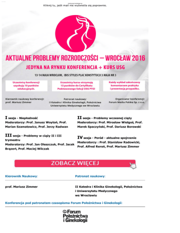 Konf er encj a Gi nekol ogi czna Konferencja Kardiologiczna Kliknij tu, jeśli mail nie wyświetla się poprawnie. I sesja - Niepłodność II sesja - Problemy wczesnej ciąży Moderatorzy: Prof. Janusz Woytoń, Prof. Moderatorzy: Prof. Mirosław Wielgoś, Prof. Marian Szamatowicz, Prof. Jerzy Radwan Marek Spaczyński, Prof. Dariusz Borowski III sesja - Problemy w ciąży II i III trymestru Moderatorzy: Prof. Jan Oleszczuk, Prof. Jacek Brązert, Prof. Maciej Wilczak IV sesja - Poród - aktualne spojrzenie Moderatorzy : Prof. Stanisław Radowicki, Prof. Alfred Reroń, Prof. Mariusz Zimmer Kierownik Naukowy: Patronat naukowy: prof. Mariusz Zimmer II Katedra i Klinika Ginekologii, Położnictwa i Uniwersytetu Medycznego we Wrocławiu Konferencja pod patronatem czasopisma Forum Położnictwa i Ginekologii: Termin i miejsce: Koszt konferencji: 13-14 maja 2016 r. Uczestnictwo w samej konferencji- 599 zł NETTO Hotel ibis Styles Uczestnictwo w konferencji + kursie USG - 999 zł NETTO Plac Konstytucji 3 Maja nr 3 Uczestnictwo w bankiecie - 99 zł NETTO 50-083 Wrocław Forum Media Polska Sp. z o.o. ul. Polska 13, 60-595 Poznań Kontakt: tel. 61 66 55 800 Infolinia 801 88 44 22 fax 61 66 55 888 e-mail: [email protected] Aby nie otrzymywać wiecej informacji od nas, użyj tego linka