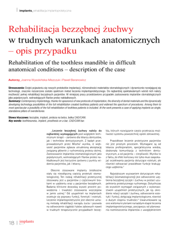 implants_rehabilitacja implantoprotetyczna Rehabilitacja bezzębnej żuchwy w trudnych warunkach anatomicznych – opis przypadku Rehabilitation of the toothless mandible in dificult anatomical conditions – description of the case Autorzy_Joanna Wysokińska-Miszczuk i Paweł Baranowicz Streszczenie: Dzięki pojawieniu się nowych protokołów implantacji, różnorodności materiałów stomatologicznych i dynamicznie rozwijającej się technologii, znacznie rozszerzone zostało spektrum metod leczenia implantoprotetycznego. Do najbardziej spektakularnych wśród nich należy możliwość pełnej rehabilitacji bezzębnych pacjentów. W niniejszej pracy przedstawiono przypadek zastosowania implantów stomatologicznych jako pojedynczych, wolnostojących ilarów protez nakładkowych. Summary: Contemporary implantology, thanks for apearance of new protocols of implantation, the diversity of dental materials and the dynamically developing technology possibilities of the full rehabilitation created toothless patients and widened the spectrum of procedures. Among them to most spectacular a possibility of the full rehabilitation of toothless patients is included. At the work presents a case of applying implants as single, standalone pillars of overdentures. Słowa kluczowe: bezzębie, implant, proteza na belce, belka CAD/CAM. Key words: toothlessness, implant, prosthesis on a bar, CAD/CAM bar. _Leczenie bezzębnej żuchwy należy do najbardziej wymagających pod względem technicznym terapii – zarówno dla lekarzy dentystów, jak i techników dentystycznych. Z badań przeprowadzonych przez Mischa1 wynika, iż większość pacjentów zgłasza utrudnioną akceptację związaną głównie z ruchomością protezy dolnej. Zastosowanie implantów stomatologicznych jako pojedynczych, wolnostojących ilarów protez nakładkowych jest korzystne zarówno z punktu widzenia pacjentów, jak i lekarzy. Obecnie stosowane implanty śródkostne stały się nieodłączną częścią protetyki stomatologicznej. Ten rodzaj rehabilitacji protetycznej stosowany jest u pacjentów z częściowymi brakami w uzębieniu oraz u pacjentów bezzębnych. Badania kliniczne dowodzą wysoki procent powodzenia i trwałości stosowania wszczepów w jamie ustnej.2 Od uzupełnień na implantach oczekuje się poprawy funkcji, fonetyki i estetyki. Leczenie implantoprotetyczne jest obecnie uznaną metodą rehabilitacji narządu żucia i pozwala na odtworzenie ciągłości łuków zębowych nawet w trudnych terapeutycznie przypadkach bezzę- 18 implants 1_2016 bia, których rozwiązanie często przekracza możliwości systemu powszechnej opieki zdrowotnej. Prawidłowe leczenie protetyczne pacjentów nie jest prostym procesem. Wymagane są od lekarza profesjonalizm, specjalistyczna wiedza, doskonała komunikacja z technikiem dentystycznym, a od pacjenta – cierpliwość. Wynika to z faktu, że efekt końcowy nie tylko musi zaspokajać oczekiwania pacjenta dotyczące estetyki, ale również odtwarzać prawidłowe funkcje brakującego uzębienia.3 Największym wyzwaniem dotyczącym rehabilitacji (stomatologicznej) jest odtworzenie uzębienia bezzębnej szczęki i żuchwy w postaci uzupełnienia protetycznego ruchomego. Dotychczas do wysokich wymagań związanych z wykonawstwem uzupełnień protetycznych, jak np. określenie relacji szczęki i żuchwy, odtworzenie estetyki i funkcji, dołączają implantologiczne, również o dużym stopniu trudności.4 Uwarunkowane są one wieloma kryteriami na każdym etapie leczenia implantoprotetycznego, począwszy od planowania rozmieszczenia implantów z uwzględnieniem implants_rehabilitacja implantoprotetyczna odpowiedniej ilości masy kostnej, a skończywszy na kształtowaniu linii dziąseł. Prawidłowe określenie miejsc implantacji to najważniejsze zadanie lekarza przed zabiegiem chirurgicznym. Tok indywidualnego postępowania w stosunku do każdego pacjenta wyznaczany jest przez różnorodność warunków anatomicznych jamy ustnej. Specjalnie dobrana technika zabiegowa powinna dawać jak najprostsze rozwiązanie w procesie klinicznym i laboratoryjnym oraz umożliwić jak najszybszą rehabilitację. Współczesna implantologia stomatologiczna oferuje coraz więcej systemów i technik, dających możliwości rehabilitacji implantoprotetycznej pacjentów bezzębnych. W tego typu przypadkach implantologia stwarza szansę na pełną rekonstrukcję uzębienia bliską naturze poprzez uzyskanie estetycznego wyglądu, odtworzenie funkcji oraz komfortowe mocowanie. Na szczególną uwagę zasługuje fakt, że postrzeganie estetyki jest cechą bardzo subiektywną.5 Często wyobrażenia lekarza, technika i pacjenta znacznie różnią się od siebie. Wspólne wysiłki lekarza i technika dentystycznego są okazją do przywrócenia pięknego uśmiechu pacjenta i podniesienia jego samooceny. Tak ambitne podejście do problemu zobowiązuje do rzetelnej współpracy implantologa i protetyka w zakresie zastosowania jak najlepszych materiałów, procedur i technik implantoprotetycznych.6,7 Celem niniejszej pracy jest zaprezentowanie możliwości pełnej rehabilitacji bezzębnej żuchwy w trudnych warunkach anatomicznych. Problemem było wykonanie implantacji przy niekorzystnych czynnikach w postaci dużych zani- Ryc. 1 ków kości oraz specyicznym położeniem nerwu zębodołowego dolnego. Ryc. 1_Zdjęcie tomograiczne przed wszczepieniem implantów. _Opis przypadku Zaprezentowany przypadek opisuje procedurę pozwalającą na rehabilitację pacjenta bezzębnego. Do gabinetu zgłosiła się 65-letnia pacjentka użytkująca od lat protezy ruchome w obu łukach. Oczekiwania pacjentki jasno wskazywały na wykonanie stałego uzupełnienia dolnego. W wywiadzie nie stwierdzono obciążeń internistycznych. Badanie izykalne wykazało dobrą retencję protezy górnej. Pacjentka była zadowolona z powierzchni zębów widocznych przy uśmiechu, a także z układu ust w pozycji spoczynkowej. Proteza dolna była stabilna, le