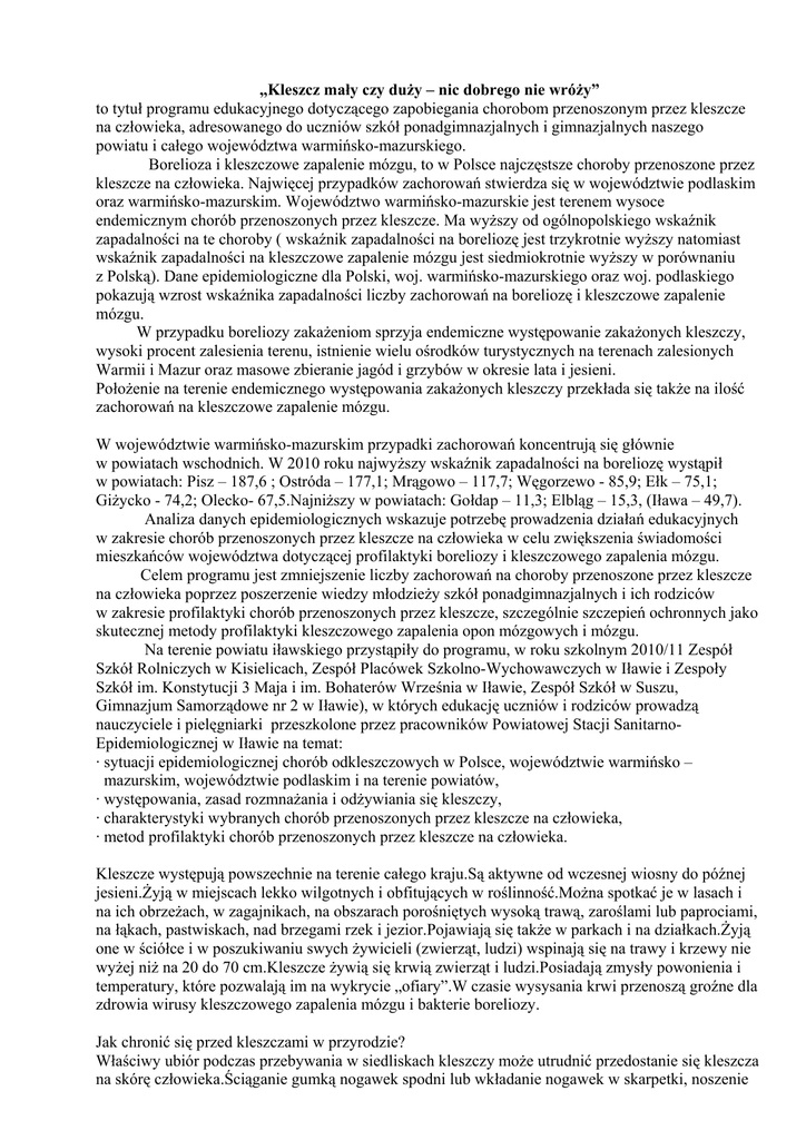 „Kleszcz mały czy duży – nic dobrego nie wróży” to tytuł programu edukacyjnego dotyczącego zapobiegania chorobom przenoszonym przez kleszcze na człowieka, adresowanego do uczniów szkół ponadgimnazjalnych i gimnazjalnych naszego powiatu i całego województwa warmińsko-mazurskiego. Borelioza i kleszczowe zapalenie mózgu, to w Polsce najczęstsze choroby przenoszone przez kleszcze na człowieka. Najwięcej przypadków zachorowań stwierdza się w województwie podlaskim oraz warmińsko-mazurskim. Województwo warmińsko-mazurskie jest terenem wysoce endemicznym chorób przenoszonych przez kleszcze. Ma wyższy od ogólnopolskiego wskaźnik zapadalności na te choroby ( wskaźnik zapadalności na boreliozę jest trzykrotnie wyższy natomiast wskaźnik zapadalności na kleszczowe zapalenie mózgu jest siedmiokrotnie wyższy w porównaniu z Polską). Dane epidemiologiczne dla Polski, woj. warmińsko-mazurskiego oraz woj. podlaskiego pokazują wzrost wskaźnika zapadalności liczby zachorowań na boreliozę i kleszczowe zapalenie mózgu. W przypadku boreliozy zakażeniom sprzyja endemiczne występowanie zakażonych kleszczy, wysoki procent zalesienia terenu, istnienie wielu ośrodków turystycznych na terenach zalesionych Warmii i Mazur oraz masowe zbieranie jagód i grzybów w okresie lata i jesieni. Położenie na terenie endemicznego występowania zakażonych kleszczy przekłada się także na ilość zachorowań na kleszczowe zapalenie mózgu. W województwie warmińsko-mazurskim przypadki zachorowań koncentrują się głównie w powiatach wschodnich. W 2010 roku najwyższy wskaźnik zapadalności na boreliozę wystąpił w powiatach: Pisz – 187,6 ; Ostróda – 177,1; Mrągowo – 117,7; Węgorzewo - 85,9; Ełk – 75,1; Giżycko - 74,2; Olecko- 67,5.Najniższy w powiatach: Gołdap – 11,3; Elbląg – 15,3, (Iława – 49,7). Analiza danych epidemiologicznych wskazuje potrzebę prowadzenia działań edukacyjnych w zakresie chorób przenoszonych przez kleszcze na człowieka w celu zwiększenia świadomości mieszkańców województwa dotyczącej profilaktyki boreliozy i kleszczowego zapalenia mózgu. Celem programu jest zmniejszenie liczby zachorowań na choroby przenoszone przez kleszcze na człowieka poprzez poszerzenie wiedzy młodzieży szkół ponadgimnazjalnych i ich rodziców w zakresie profilaktyki chorób przenoszonych przez kleszcze, szczególnie szczepień ochronnych jako skutecznej metody profilaktyki kleszczowego zapalenia opon mózgowych i mózgu. Na terenie powiatu iławskiego przystąpiły do programu, w roku szkolnym 2010/11 Zespół Szkół Rolniczych w Kisielicach, Zespół Placówek Szkolno-Wychowawczych w Iławie i Zespoły Szkół im. Konstytucji 3 Maja i im. Bohaterów Września w Iławie, Zespół Szkół w Suszu, Gimnazjum Samorządowe nr 2 w Iławie), w których edukację uczniów i rodziców prowadzą nauczyciele i pielęgniarki przeszkolone przez pracowników Powiatowej Stacji SanitarnoEpidemiologicznej w Iławie na temat: · sytuacji epidemiologicznej chorób odkleszczowych w Polsce, województwie warmińsko – mazurskim, województwie podlaskim i na terenie powiatów, · występowania, zasad rozmnażania i odżywiania się kleszczy, · charakterystyki wybranych chorób przenoszonych przez kleszcze na człowieka, · metod profilaktyki chorób przenoszonych przez kleszcze na człowieka. Kleszcze występują powszechnie na terenie całego kraju.Są aktywne od wczesnej wiosny do późnej jesieni.Żyją w miejscach lekko wilgotnych i obfitujących w roślinność.Można spotkać je w lasach i na ich obrzeżach, w zagajnikach, na obszarach porośniętych wysoką trawą, zaroślami lub paprociami, na łąkach, pastwiskach, nad brzegami rzek i jezior.Pojawiają się także w parkach i na działkach.Żyją one w ściółce i w poszukiwaniu swych żywicieli (zwierząt, ludzi) wspinają się na trawy i krzewy nie wyżej niż na 20 do 70 cm.Kleszcze żywią się krwią zwierząt i ludzi.Posiadają zmysły powonienia i temperatury, które pozwalają im na wykrycie „ofiary”.W czasie wysysania krwi przenoszą groźne dla zdrowia wirusy kleszczowego zapalenia mózgu i bakterie boreliozy. Jak chronić się przed kleszczami w przyrodzie? Właściwy ubiór podczas przebywania w siedliskach kleszczy może utrudnić przedostanie się kleszcza na skórę człowieka.Ściąganie gumką nogawek spodni lub wkładanie nogawek w skarpetki, noszenie obuwia krytego i bluzek z długim rękawem.Stosowanie środków odstraszających (repelentów kupionych w aptece).Staranne oglądanie ubrania i skóry po powrocie z lasu, parku i innych siedlisk, w których istnieje ryzyko atakowania ludzi przez kleszcza.Kleszcze zanim zakotwiczą się hypostomem w skórze poszukują odpowiedniego miejsca do żerowania, które następnie znieczulają dlatego nie czujemy bólu podczas ukłucia. U dzieci najczęściej (w około 70% przypadków) lokalizują się na głowie, zazwyczaj na granicy włosów i za uszami, zaś u dorosłych w miejscach gdzie skóra jest delikatna (najczęściej w naturalnych zgięciach ciała np. pod kolanami, w pachwinach, na brzuchu, pod piersiami). Jak usunąć przyczepione do skóry kleszcze? Kleszcza należy uchwycić delikatnie pensetą przy samej skórze i wyciągnąć zdecydowanym ruchem obrotowym.Przy takim ruchu zęby hypostomu stawiają mniejszy opór, przez co kleszcz nie zostaje uszkodzony i nie ma niebezpieczeństwa wylania na skórę zawartości jego ciała, w której mogą znajdować się drobnoustroje. Podczas usuwania kleszcza nie naciskać na jego ciało, nie przypalać, nie smarować masłem, lakierem, nie maltretować albowiem może to doprowadzić do wyrzucenia treści pokarmowej kleszcza do rany i tym samym zwiększyć ryzyko zakażenia. Po wyjęciu kleszcza miejsce ukłucia starannie zdezynfekować. W aptekach dostępne są także różnego rodzaju pompki, które należy stosować zgodnie z zaleceniami producentów. Więcej informacji n