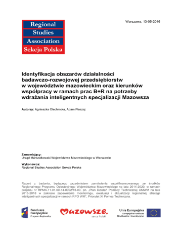 Warszawa, 13-05-2016 Identyfikacja obszarów działalności badawczo-rozwojowej przedsiębiorstw w województwie mazowieckim oraz kierunków współpracy w ramach prac B+R na potrzeby wdrażania inteligentnych specjalizacji Mazowsza Autorzy: Agnieszka Olechnicka, Adam Płoszaj Zamawiający: Urząd Marszałkowski Województwa Mazowieckiego w Warszawie Wykonawca: Regional Studies Association Sekcja Polska Raport z badania, będącego przedmiotem zamówienia współfinansowanego ze środków Regionalnego Programu Operacyjnego Województwa Mazowieckiego na lata 2014-2020, w ramach projektu nr RPMA.11.01.00-14-0002/15-00, pn. „Plan Działań Pomocy Technicznej UMWM na lata 2015-2018 w zakresie zapewnienia monitoringu, ewaluacji i aktualizacji regionalnej strategii inteligentnych specjalizacji w ramach RPO WM”, Priorytet XI Pomoc Techniczna. Spis treści 1. Streszczenie ....................................................................................................................... 3 2. Summary ............................................................................................................................ 6 3. Cel badania ......................................................................................................................... 9 4. Metodyka badania ............................................................................................................... 9 4.1. Koncepcja badania ............................................................................................................. 9 4.2. Źródła danych ................................................................................................................... 9 Web of Science ......................................................................................................................... 10 Scopus ...................................................................................................................................... 11 7. Program Ramowy UE ............................................................................................................ 11 Zalety i ograniczenia bibliometrii jako metody pomiaru działalności B+R .................................. 12 Wskaźniki bibliometryczne w pomiarze współpracy sektora nauki i przedsiębiorstw ................ 13 4.3. 5. Powiązanie wyników badania z formułowaniem Regionalnych Agend Naukowo-Badawczych oraz z Priorytetowymi Kierunkami Badań ............................................................................... 15 Wyniki............................................................................................................................... 17 5.1. Aktywność badawczo-rozwojowa przedsiębiorstw w świetle danych naukometrycznych ................... 17 Web of Science ......................................................................................................................... 17 Scopus ...................................................................................................................................... 20 7. Program Ramowy UE ............................................................................................................ 23 Podsumowanie .......................................................................................................................... 25 5.2. Współpraca badawczo-rozwojowa przedsiębiorstw w świetle danych naukometrycznych .................. 27 Web of Science ......................................................................................................................... 27 Scopus ...................................................................................................................................... 32 7. Program Ramowy UE ............................................................................................................ 35 Podsumowanie .......................................................................................................................... 39 5.3. Specjalizacja badawczo-rozwojowa przedsiębiorstw w świetle danych naukometrycznych ................ 40 Web of Science ......................................................................................................................... 40 Scopus ...................................................................................................................................... 46 7. Program Ramowy UE ............................................................................................................ 47 Podsumowanie .......................................................................................................................... 50 6. Wnioski i rekomendacje ...................................................................................................... 52 7. Spis rysunków i tabel ......................................................................................................... 56 Rysunki...................................................................................................................................... 56 Tabele ....................................................................................................................................... 57 8. Bibliografia ........................................................................................................................ 58 Załącznik 1 ................................................................................................................................ 61 Załącznik 2 ................................................................................................................................ 69 Załącznik 3 ................................................................................................................................ 76 Załącznik 4 ................................................................................................................................ 79 2 1. Streszczenie Celem badania była id