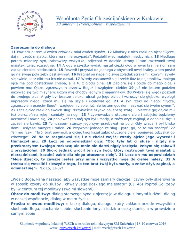 Wspólnota Życia Chrześcijańskiego w Krakowie Ad amorem | Prewspólnota | Współdzielnia Zaproszenie do dialogu 11 Powiedział też: «Pewien człowiek miał dwóch synów. 12 Młodszy z nich rzekł do ojca: "Ojcze, daj mi część majątku, która na mnie przypada". Podzielił więc majątek między nich. 13 Niedługo potem młodszy syn, zabrawszy wszystko, odjechał w dalekie strony i tam roztrwonił swój majątek, żyjąc rozrzutnie. 14 A gdy wszystko wydał, nastał ciężki głód w owej krainie i on sam zaczął cierpieć niedostatek. 15 Poszedł i przystał do jednego z obywateli owej krainy, a ten posłał go na swoje pola żeby pasł świnie 4. 16 Pragnął on napełnić swój żołądek strąkami, którymi żywiły się świnie, lecz nikt mu ich nie dawał. 17 Wtedy zastanowił się i rzekł: Iluż to najemników mojego ojca ma pod dostatkiem chleba, a ja tu z głodu ginę. 18 Zabiorę się i pójdę do mego ojca, i powiem mu: Ojcze, zgrzeszyłem przeciw Bogu 5 i względem ciebie; 19 już nie jestem godzien nazywać się twoim synem: uczyń mię choćby jednym z najemników. 20 Wybrał się więc i poszedł do swojego ojca. A gdy był jeszcze daleko, ujrzał go jego ojciec i wzruszył się głęboko; wybiegł naprzeciw niego, rzucił mu się na szyję i ucałował go. 21 A syn rzekł do niego: "Ojcze, zgrzeszyłem przeciw Bogu6 i względem ciebie, już nie jestem godzien nazywać się twoim synem". 22 Lecz ojciec rzekł do swoich sług: "Przynieście szybko najlepszą szatę i ubierzcie go; dajcie mu też pierścień na rękę i sandały na nogi! 23 Przyprowadźcie utuczone cielę i zabijcie: będziemy ucztować i bawić się, 24 ponieważ ten mój syn był umarły, a znów ożył; zaginął, a odnalazł się". I zaczęli się bawić. 25 Tymczasem starszy jego syn7 przebywał na polu. Gdy wracał i był blisko domu, usłyszał muzykę i tańce. 26 Przywołał jednego ze sług i pytał go, co to ma znaczyć. 27 Ten mu rzekł: "Twój brat powrócił, a ojciec twój kazał zabić utuczone cielę, ponieważ odzyskał go zdrowego". 28 Na to rozgniewał się i nie chciał wejść; wtedy ojciec jego wyszedł i tłumaczył mu. 29 Lecz on odpowiedział ojcu: "Oto tyle lat ci służę i nigdy nie przekroczyłem twojego rozkazu; ale mnie nie dałeś nigdy koźlęcia, żebym się zabawił z przyjaciółmi. 30 Skoro jednak wrócił ten syn twój, który roztrwonił twój majątek z nierządnicami, kazałeś zabić dla niego utuczone cielę". 31 Lecz on mu odpowiedział: "Moje dziecko, ty zawsze jesteś przy mnie i wszystko moje do ciebie należy. 32 A trzeba się weselić i cieszyć z tego, że ten brat twój był umarły, a znów ożył, zaginął, a odnalazł się"». /Łk 15, 11-32/ „Prosić Boga, Pana naszego, aby wszystkie moje zamiary decyzje i czyny były skierowane w sposób czysty do służby i chwały Jego Boskiego majestatu” (CD 46) Poproś Go, żeby był w centrum tej modlitwy (swoimi słowami). Obraz do modlitwy: dialog starszego syna z ojcem; ja w dialogu z innymi ludźmi, dialog w naszej wspólnocie, dialog w moim życiu. Prośba o owoc modlitwy: o łaskę dialogu, dialogu, który zakłada przede wszystkim słuchanie Boga, słuchanie siebie, słuchanie innych ludzi; o łaskę stanięcia w prawdzie o samym sobie Skupienie wspólnoty lokalnej WŻCh w ośrodku rekolekcyjnym SM Śnieżnica | 18-19 czerwca 2016 www: http://wzch.krakow.pl | mail: [email protected] Wspólnota Życia Chrześcijańskiego w Krakowie Ad amorem | Prewspólnota | Współdzielnia VERTE Skupienie wspólnoty lokalnej WŻCh w ośrodku rekolekcyjnym SM Śnieżnica | 18-19 czerwca 2016 www: http://wzch.krakow.pl | mail: [email protected] Wspólnota Życia Chrześcijańskiego w Krakowie Ad amorem | Prewspólnota | Współdzielnia Przyglądnąć się komunikacji, która dzieje się w tej scenie Impulsy do modlitwy: Każdy dobry chrześcijanin winien być bardziej skory do ocalenia wypowiedzi bliźniego, niż do jej potępienia. // A jeśli nie może jej ocalić, niech spyta go, jak on ją rozumie; // a jeśli rozumie ją źle, niech go poprawi z miłością; // a jeśli to nie wystarcza, niech szuka środków stosownych do tego, aby on, dobrze ją rozumiejąc, mógł ją ocalić /Ćwiczenia Duchowe 22/ Dialog to taki typ, rodzaj lub jakość kontaktu między ludźmi, kiedy dwie lub więcej osób pragnie i jest w stanie się spotkać udostępniając drugiej osobie część swojej wyjątkowości, niemierzalności, refleksyjności, adresowalności oraz swoich wyborów. Jeżeli człowiek się komunikuje, prowadzi dialog (z Bogiem, z samym sobą, z innymi ludźmi, we wspólnocie, itd.) to się zmienia, staje się bardziej świadomy samego siebie tym samym dokonuje się w nim rozwój. Codzienność, możliwość codziennego spotkania w tekście ewangelii traci wartość wobec atrakcyjnej uczty Postawa starszego brata to postawa nieufności Bóg jest blisko właśnie w ludziach, których spotykamy w zwyczajności wspólnoty, może czasami tego nie dostrzegamy Czasami zapominamy o darze wspólnoty, o darze obecności drugiego człowieka we wspólnocie i mamy pretensje, że nie jest taki jakbyśmy tego chcieli – tak jak starszy syn Najtrudniej przyjmować miłość objawioną najprościej: przez bliskość, obecność i najłatwiej ją zlekceważyć, pominąć, odepchnąć we wspólnocie Czy słucham osób we wspólnocie, partnera rozmowy? Czy zajadę osobie, z którą rozmawiam pytania? Czy komunikując się z innymi, mówię im także coś o sobie, czy jednak przeszkadza mi w tym jakiś lęk? Jaki? Czy potrafię mówić o tym co przeżywam? Czy może cierpię na słowotok? Czy mam tendencję by dominować w każdej rozmowie? Co moim zdaniem jest warunkiem „dobrej rozmowy”, dobrej komunikacji? Skupienie wspólnoty lokalnej WŻCh w ośrodku rekolekcyjnym SM Śnieżnica | 18-19 czerwca 2016 www: http://wzch.krakow.pl | mail: [email protected]