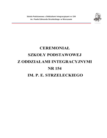 CEREMONIAŁ SZKOŁY PODSTAWOWEJ Z ODDZIAŁAMI INTEGRACYJNYMI NR 154 IM. P. E. STRZELECKIEGO CEREMONIAŁ SZKOLNY to opis sposobów przeprowadzania najważniejszych uroczystości szkolnych z udziałem sztandaru szkoły. To również zbiór zasad zachowania się uczniów w trakcie uroczystości szkolnych. Do najważniejszych uroczystości odbywających się zgodnie z ceremoniałem szkolnym należą: 1. Uroczyste rozpoczęcie roku szkolnego. 2. Pasowanie na ucznia - ślubowanie na sztandar szkoły. 3. Święto patrona szkoły. 4. Pożegnanie uczniów klas szóstych - ślubowanie na sztandar szkoły. 5. Uroczyste zakończenie roku szkolnego. 6. Uroczystości nawiązujące do ważnych wydarzeń historycznych. § 1. SYMBOLE SZKOLNE 1. Sztandar szkolny. Sztandar szkolny to symbol Małej Ojczyzny jaką jest szkoła i jej najbliższe środowisko. Sztandar składa się z płachty i drzewca. Płachtą jest tkanina prostokątna obszyta złotą frędzlą. Prawa strona jest biało - czerwona, na której wyhaftowane jest godło państwowe. Na lewej stronie umieszczony jest napis z nazwą i imieniem szkoły: „Szkoła Podstawowa nr 154 z Oddziałami Integracyjnymi w Warszawie im. Pawła Edmunda Strzeleckiego”. Sztandar jest eksponowany podczas ważnych uroczystości na terenie szkoły i poza szkołą, a przechowywany jest w gablocie na parterze. W czasie uroczystości sztandar nosi się rozwinięty. Sztandarem opiekuje się trzyosobowy poczet sztandarowy wybierany co roku spośród najlepszych uczniów klas piątych. Kandydatury składu są przedstawiane przez wychowawców klas na czerwcowej Radzie Pedagogicznej i przez nią zatwierdzone. O wyborze uczniów do pocztu sztandarowego są powiadomieni rodzice lub opiekunowie prawni uczniów. Kadencja pocztu trwa jeden rok, począwszy od ślubowania w dniu uroczystego zakończenia roku szkolnego. Obok zasadniczego składu powinien zostać wybrany skład „rezerwowy”. Skład osobowy pocztu sztandarowego stanowią: Chorąży - uczeń klasy szóstej i Asysta - dwie uczennice klasy szóstej. Opiekunem sztandaru szkolnego jest wybrany przez Radę Pedagogiczną nauczyciel, który dba o właściwą celebrację sztandaru i zgodny z ceremoniałem przebieg uroczystości na terenie szkoły i poza jej murami. Uroczystego przekazania sztandaru dokonuje się podczas uroczystości zakończenia roku szkolnego. Poczet sztandarowy występuje w pełnej gali (białe bluzki/koszule, granatowe spódnice/spodnie, białe rękawiczki, szarfy biało- czerwone przewiązane przez prawe ramię, zwrócone kolorem białym w stronę kołnierza, krawaty z logo szkoły). 2. Flaga szkoły. Na płachcie w niebieskie i zielone pasy widniej napis „Dąbrówka” i liść dębowy. Flaga szkoły jest na stałe umieszczona na maszcie przed szkołą od ul. Leśnej Polanki. 3. Logo szkoły. Logo szkoły stanowi pełna nazwa z wizerunkiem patrona szkoły. 4. Hymn szkoły. Szkoła posiada własny hymn. Jest grany i śpiewany na uroczystościach szkolnych. Słowa hymnu brzmią następująco: Słowa: Ewa Mańkowska Muzyka: Jacek Szymański I. Leśna Polanka, tu stoi szkoła Zawsze tu gwarno, zawsze wesoło. Każdy po przerwie na lekcje spieszy, Aby rodziców piątką ucieszyć. Refren: Nasza szkoła jest wesoła, Miło czas w niej płynie nam. Choć czasami się dąsamy, Jednak bardzo ją kochamy. II. Teraz już koniec, czas na zajęcia, nie bardzo chce się wejść w ich objęcia. Klasa coś wrzeszczy, coś opowiada, Może nie będzie powodu biadać. Refren Słowa: Aleksandra Czugajewska: Patron Strzelecki był dla nas wzorem, Uczył się rano, uczył wieczorem, Pomagał ludziom, znał Go świat cały, Bo On była wielki, świat był mu mały. Refren III. Słowa: Michał Makulski : IV. Edmund Strzelecki to dla nas wzorzec Każdy z nas badać, odkrywać może. Chcemy wyrosnąć na wielkich ludzi, Szkoła w nas pasję do wyzwań budzi. 2. Księga pamiątkowa Zapisywani są w niej uczniowie rozpoczynający naukę w klasie pierwszej w każdym roku szkolnym, a także uczniowie kończący klasę szóstą, którzy obok swoich nazwisk składają własnoręczny podpis. 3. Kronika szkoły Kronika prowadzona jest systematycznie. Zawiera ona ważne wydarzenia z życia szkoły, wzbogacona jest zdjęciami okolicznościowymi. § 2. UROCZYSTOŚCI SZKOLNE ODBYWAJĄCE SIĘ ZGODNIE Z CEREMONIAŁEM SZKOLNYM W trakcie przebiegu uroczystości z udziałem sztandaru ustala się następujące chwyty sztandaru: Postawy postawa „zasadnicza” Opis chwytu sztandaru Sztandar położony na trzewiku drzewca przy prawej nodze na wysokości czubka buta. Drzewce przytrzymywane prawa ręką powyżej pasa, łokieć prawej ręki lekko przyciśnięty do ciała. Lewa ręka jak w postawie „zasadniczej”. postawa „spocznij” Sztandar trzymany przy prawej nodze jak w postawie „zasadniczej”. Chorąży i asysta w postawie „spocznij”. postawa „na ramię” Chorąży kładzie drzewce prawą ręką (pomaga lewą) na prawe ramię i trzyma je pod kątem 450. Płat sztandaru musi być oddalony od barku przynajmniej na szerokość dłoni. postawa „prezentuj” Z postawy „zasadniczej” chorąży podnosi prawą ręką sztandar do położenia przy prawym ramieniu (dłoń prawej ręki na wysokość barku), następnie lewą ręką chwyta drzewce sztandaru tuż pod prawą, po czym opuszcza prawą ręką drzewce sztandaru do położenia pionowego przy prawym ramieniu. Lewa dłoń chwyta drzewce poniżej prawego barku. salutowanie sztandarem w miejscu Wykonuje się z postawy „prezentuj”; chorąży robi zwrot w prawo skos z równoczesnym wysunięciem lewej nogi w przód na odległość jednej stopy i pochyla sztandar w przód do 450. Po czasie „salutowania” przenosi sztandar do postawy „prezentuj”. salutowanie sztandarem w marszu Z położenia „na ramię” w taki sam sposób jak przy salutowaniu w miejscu. Komendy: „na prawo patrz” pochyla sztandar; „baczność” - bierze sztandar na ramię. W trakcie przebiegu 