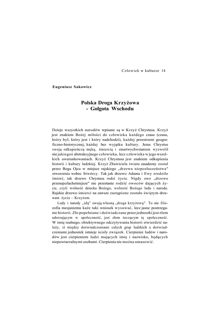Człowiek w kulturze 14 Eugeniusz Sakowicz Polska Droga Krzyżowa - Golgota Wschodu Dzieje wszystkich narodów wpisane są w Krzyż Chrystusa. Krzyż jest znakiem Bożej miłości do człowieka każdego czasu (czasu, który był, który jest i który nadchodzi), każdej przestrzeni geograficzno-historycznej, każdej bez wyjątku kultury. Jezus Chrystus swoją odkupieńczą męką, śmiercią i zmartwychwstaniem wyzwolił nie jakiegoś abstrakcyjnego człowieka, lecz człowieka w jego wszel kich uwarunkowaniach. Krzyż Chrystusa jest znakiem odkupienia historii i kultury ludzkiej. Krzyż Zbawiciela świata zasadzony został przez Boga Ojca w miejsce rajskiego „drzewa nieposłuszeństwa" stworzenia wobec Stwórcy. Tak jak drzewo Adama i Ewy zrodziło śmierć, tak drzewo Chrystusa rodzi życie. Nigdy owo „drzewo przenajszlachetniejsze" nie przestanie rodzić owoców dających ży cie, czyli wolność dziecka Bożego, wolność Bożego ludu i narodu. Rajskie drzewo śmierci na zawsze zastąpione zostało świętym drze wem życia - Krzyżem. Ludy i narody „idą" swoją własną „droga krzyżową". To nie filo zofia mesjanizmu każe taki wniosek wysuwać, lecz jasne postrzega nie historii. Zło popełniane i doświadczane przez jednostki jest złem uderzającym w społeczność, jest złem toczącym tę społeczność. W imię realnego, obiektywnego odczytywania historii stwierdzić na leży, iż między doświadczeniami całych grup ludzkich a doświad czeniami jednostek istnieje ścisły związek. Cierpienie ludów i naro dów jest cierpieniem ludzi mających imię i nazwisko, będących niepowtarzalnymi osobami. Cierpienia nie można umasowić. 258 Eugeniusz Sakowicz W historii każdego narodu dostrzec można wyraźnie poszcze gólne przystanki, stacje drogi krzyżowej. Istnieje pewna analogia między drogą Chrystusa - via dolorosa a drogą danego narodu. Droga krzyżowa narodu sama w sobie nie ma wartości soterycznej, zbawczej. Żaden naród, dźwigający nawet największy i najstrasz niejszy krzyż dziejowego doświadczenia, nie zbawi sam siebie. Chrześcijaństwo nie przyjmuje ani indywidualnej, ani zbiorowej autosoteriologii. Droga krzyżowa narodu połączona z drogą krzy żową Chrystusa zrodzi na pewno zbawcze owoce. Jezus Chrystus uczy swoich braci i siostry w człowieczeństwie, jak należy cierpieć, ażeby zwyciężyć. Droga krzyżowa, szlak poniewierki, upodlenia, sytuacji krytycznych, wręcz granicznych - terminalnych, kończy się na Górze Golgocie, która - to paradoksalne! - jako góra śmierci jest górą życia. Na górze tej, niczym w nowym ogrodzie rajskim, wyro sło drzewo nieprzemijające - Krzyż. „A ja gdy wywyższony będę przyciągnę wszystkich do siebie" (J 12, 32) - powiedział Chrystus. Droga krzyżowa narodu nabiera sensu, gdy postrzegana jest z per spektywy Chrystusowej Golgoty. W biegu wydarzeń danego narodu dostrzec można poszczególne stacje, przystanki krzyżowej drogi, którą przemierzał Syn Człowie czy - Syn Boży. Nie tylko poszczególne jednostki, osoby, ale i całe narody stają w obliczu krzyża, są niesprawiedliwie skazywane na śmierć, zdradzane i unicestwienie, na oczach przeróżnych gapiów, obojętnych, żądnych sensacji i spragnionych „igrzysk". Narodom na rzucany jest krzyż, pod którym upadają one trzy razy, siedem razy, siedemdziesiąt siedem razy. Historia i współczesność pokazuje na rody bite, poniewierane, deptane, zdradzane, uśmiercane. Nie sposób zrozumieć dziejów ludów i narodów świata, również tych nie och rzczonych, bez Krzyża Chrystusa. Nie sposób odrzucić Krzyż Chry stusowy, który „interpretuje" historię. Nie można zrozumieć czło wieka bez Chrystusa Ukrzyżowanego. Krzyż Odkupiciela świata jest kluczem do zrozumienia dziejów. Nie zrozumie się dziejów Polski bez krzyża Syna Bożego, zawsze wiernego Bogu. Polska i Polacy wpisani zostali w Krzyż Chrystusa ponad tysiąc lat temu. Chrzest Polski w 966 roku był wprowadzeniem synów i córek Lecha w świat cywilizacji chrześcijańskiej, był „wejściem" Polska Droga Krzyżowa - Golgota Wschodu 259 w misterium Krzyża. Chrzest oznaczał gotowość wzięcia swoich dziejowych doświadczeń jako swojego Krzyża. Na historię Polski patrzeć należy przez Krzyż. Krzyż nie przesłania jej, lecz ją naświe tla. Rozwój kultury polskiej, czyli kształtowanie tej przestrzeni ludzkich wartości, w której człowiek spełnia się jako człowiek, ale też doświadczenia cierpień spowodowanych niezliczonymi wojnami, walkami, wzloty i moralne upadki polskiego narodu - to udział w tajemnicy Krzyża, to dźwiganie Krzyża przez tych, którzy uko chali Polskę jak Matkę i Ojca. Krzyż polskiego narodu był i będzie zrozumiany poprzez odniesienie go do jedynego Krzyża, Krzyża Chrystusa, który stanowi fundament polskiego domu. „Tylko pod Krzyżem, tylko pod tym znakiem Polska jest Polską, a Polak Pola kiem". Nie możemy zignorować natchnionych słów polskiego wie szcza narodowego Można by prześledzić dzieje Krzyża w Polsce, w każdym kolej nym wieku następującym po 966 roku. Można by odnosić ów polski Krzyż do jedynego Krzyża - Chrystusowego, by szukać odpowiedzi na najtrudniejsze pytanie, które zadaje bezradny i zrozpaczony, zmiażdżony ogromem cierpienia człowiek i jako jednostka, i jako społeczność: Dlaczego? Dzieje Krzyża na polskiej ziemi, obecność Krzyża w polskiej historii, kulturze i polityce - temat „otwarty" na refleksję, temat wołający o zastanowienie się i wyciągnięcie wnio sków. Brak jest w polskiej teologii narodu takiego całościowego spojrzenia na dzieje Krzyża i na Polską Drogę Krzyżową, której stacje mierzone są ponad tysiącletnia historią. * Zatrzymajmy się i spójrzmy na Polską Drogę Krzyżową XX wieku, której apogeum wyznacza doświadczenie II wojny światowej. Ucisk i strapienie, dramat i koszmar wojny nosili i noszą w swojej pamięci i w swoich sercach nasi 