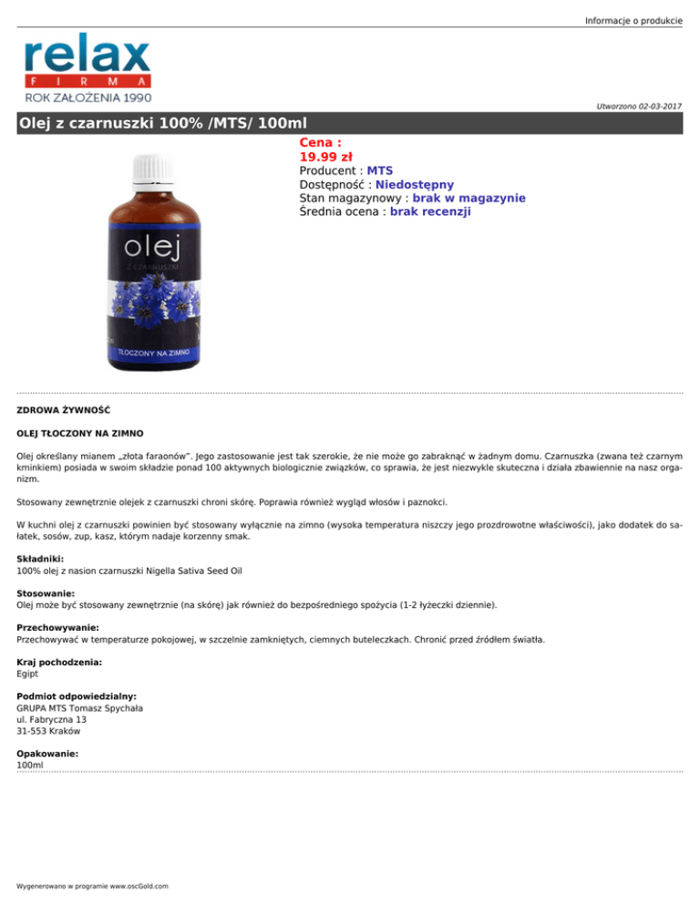 Informacje o produkcie Utworzono 02-03-2017 Olej z czarnuszki 100% /MTS/ 100ml Cena : 19.99 zł Producent : MTS Dostępność : Niedostępny Stan magazynowy : brak w magazynie Średnia ocena : brak recenzji ZDROWA ŻYWNOŚĆ OLEJ TŁOCZONY NA ZIMNO Olej określany mianem „złota faraonów”. Jego zastosowanie jest tak szerokie, że nie może go zabraknąć w żadnym domu. Czarnuszka (zwana też czarnym kminkiem) posiada w swoim składzie ponad 100 aktywnych biologicznie związków, co sprawia, że jest niezwykle skuteczna i działa zbawiennie na nasz organizm. Stosowany zewnętrznie olejek z czarnuszki chroni skórę. Poprawia również wygląd włosów i paznokci. W kuchni olej z czarnuszki powinien być stosowany wyłącznie na zimno (wysoka temperatura niszczy jego prozdrowotne właściwości), jako dodatek do sałatek, sosów, zup, kasz, którym nadaje korzenny smak. Składniki: 100% olej z nasion czarnuszki Nigella Sativa Seed Oil Stosowanie: Olej może być stosowany zewnętrznie (na skórę) jak również do bezpośredniego spożycia (1-2 łyżeczki dziennie). Przechowywanie: Przechowywać w temperaturze pokojowej, w szczelnie zamkniętych, ciemnych buteleczkach. Chronić przed źródłem światła. Kraj pochodzenia: Egipt Podmiot odpowiedzialny: GRUPA MTS Tomasz Spychała ul. Fabryczna 13 31-553 Kraków Opakowanie: 100ml Wygenerowano w programie www.oscGold.com