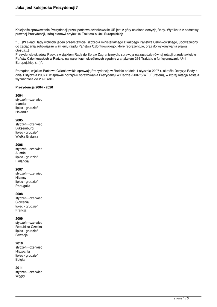 Jaka jest kolejność Prezydencji? Kolejność sprawowania Prezydencji przez państwa członkowskie UE jest z góry ustalona decyzją Rady. Wynika to z podstawy prawnej Prezydencji, którą stanowi artykuł 16 Traktatu o Unii Europejskiej: " (…)W skład Rady wchodzi jeden przedstawiciel szczebla ministerialnego z każdego Państwa Członkowskiego, upoważniony do zaciągania zobowiązań w imieniu rządu Państwa Członkowskiego, które reprezentuje, oraz do wykonywania prawa głosu.(...) Prezydencję składów Rady, z wyjątkiem Rady do Spraw Zagranicznych, sprawują na zasadzie równej rotacji przedstawiciele Państw Członkowskich w Radzie, na warunkach określonych zgodnie z artykułem 236 Traktatu o funkcjonowaniu Unii Europejskiej. (…)". Porządek, w jakim Państwa Członkowskie sprawują Prezydencję w Radzie od dnia 1 stycznia 2007 r. określa Decyzja Rady z dnia 1 stycznia 2007 r. w sprawie porządku sprawowania Prezydencji w Radzie (2007/5/WE, Euratom), w której rotacja została wyznaczona do 2020 roku. Prezydencja 2004 - 2020 2004 styczeń - czerwiec Irlandia lipiec - grudzień Holandia 2005 styczeń - czerwiec Luksemburg lipiec - grudzień Wielka Brytania 2006 styczeń - czerwiec Austria lipiec - grudzień Finlandia 2007 styczeń - czerwiec Niemcy lipiec - grudzień Portugalia 2008 styczeń - czerwiec Słowenia lipiec - grudzień Francja 2009 styczeń - czerwiec Republika Czeska lipiec - grudzień Szwecja 2010 styczeń - czerwiec Hiszpania lipiec - grudzień Belgia 2011 styczeń - czerwiec Węgry strona 1 / 3 Jaka jest kolejność Prezydencji? lipiec - grudzień Polska 2012 styczeń - czerwiec Dania lipiec - grudzień Cypr 2013 styczeń - czerwiec Irlandia lipiec - grudzień Litwa 2014 styczeń - czerwiec Grecja lipiec - grudzień Włochy 2015 styczeń - czerwiec Łotwa lipiec - grudzień Luksemburg 2016 styczeń - czerwiec Niderlandy lipiec - grudzień Słowacja 2017 styczeń - czerwiec Malta lipiec - grudzień Wielka Brytania 2018 styczeń - czerwiec Estonia lipiec - grudzień Bułgaria 2019 styczeń - czerwiec Austria lipiec - grudzień Rumunia 2020 styczeń - czerwiec Finlandia Kolejność Prezydencji (Trio) Zgodnie ze zmianami w sposobie sprawowania Przewodnictwa w Radzie Unii Europejskiej zaproponowanymi w Traktacie z Lizbony oraz obecnie przyjętą praktyką przewiduje się bliższą niż dotychczas współpracę pomiędzy trzema państwami członkowskimi kolejno pełniącymi funkcję Prezydencji. Wbrew powszechnym skojarzeniom nie chodzi tu jednak o współpracę strona 2 / 3 Jaka jest kolejność Prezydencji? państwa sprawującego Prezydencję ze swoim poprzednikiem i następcą, lecz o ściśle określone następujące po sobie trójki państw. Współpraca państw w ramach trio spełnia szereg kluczowych zadań. Przede wszystkim zapewnia ona pewną stabilizację polityczno-programową, a wraz z nią ciągłość prac instytucji unijnych. Ponadto, zabezpiecza ona przed forsowaniem swoich własnych interesów przez państwo aktualnie sprawujące Prezydencję, często niezgodnych z ogólnym interesem wspólnotowym. Nie można także zapomnieć o fakcie, że w wyniku rozszerzenia Prezydencję muszą sprawować także nowe, niedoświadczone w tym zakresie państwa. Współpraca w ramach trio pozwala im uzyskać wsparcie w tym poważnym przedsięwzięciu politycznym ze strony starych członków UE i minimalizuje ryzyko ewentualnego niepodołania obowiązkom. www.prezydencjaue.gov.pl strona 3 / 3
