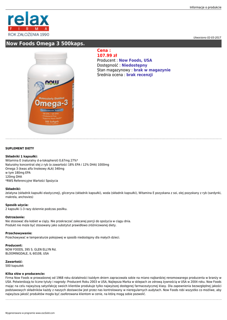 Informacje o produkcie Utworzono 02-03-2017 Now Foods Omega 3 500kaps. Cena : 107.99 zł Producent : Now Foods, USA Dostępność : Niedostępny Stan magazynowy : brak w magazynie Średnia ocena : brak recenzji SUPLEMENT DIETY Składniki 1 kapsułki: Witamina E (naturalny d-a-tokopherol) 0,67mg 27%* Naturalny koncentrat olej z ryb (o zawartości 18% EPA i 12% DHA) 1000mg Omega 3 (kwas alfa linoleowy ALA) 340mg w tym 180mg EPA 120mg DHA *RWS Referencyjne Wartości Spożycia Składniki: żelatyna (składnik kapsułki elastycznej), gliceryna (składnik kapsułki), woda (składnik kapsułki), Witamina E pozyskana z soi, olej pozyskany z ryb (sardynki, makrela, anchovies) Sposób użycia: 2 kapsułki 1-3 razy dziennie podczas posiłku. Ostrzeżenie: Nie stosować dla kobiet w ciąży. Nie przekraczać zalecanej porcji do spożycia w ciągu dnia. Produkt nie może być stosowany jako substytut prawidłowo zróżnicowanej diety. Przechowywanie: Przechowywać w temperaturze pokojowej w sposób niedostępny dla małych dzieci. Producent: NOW FOODS, 395 S. GLEN ELLYN Rd. BLOOMINGDALE, IL 60108, USA Zawartość: 500 kapsułek Kilka słów o producencie: Firma Now Foods w prowadzonej od 1968 roku działalności każdym dniem zapracowała sobie na miano najbardziej renomowanego producenta w branży w USA. Potwierdzają to liczne tytuły i nagrody: Producent Roku 2003 w USA, Najlepsza Marka w sklepach ze zdrową żywnością w USA w 2004 roku. Now Foods mając na celu najwyższą satysfakcję swoich klientów produkuje tylko najwyższej dostępnej farmaceutycznej klasy. Dla zapewnienia bezwzględnej jakości podstawowych składników każdy z naszych dostawców jest przez nas kontrolowany w nieregularnych audytach. Now Foods robi wszystko co możliwe, aby najwyższa jakość produktów mogła być zaoferowana klientom w cenie, na którą mogą sobie pozwolić. Wygenerowano w programie www.oscGold.com