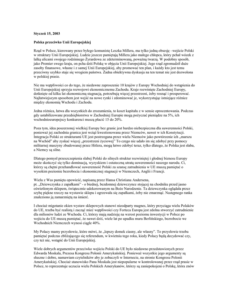 Styczeń 15, 2003 Polska przeciwko Unii Europejskiej Rząd w Polsce, kierowany przez byłego komunistę Leszka Millera, ma tylko jedną obsesję –wejście Polski w struktury Unii Europejskiej. Ludzie jeszcze pamiętają Millera jako małego chłopca, który pchał wózek z lalką ulicami swojego rodzinnego Żyrardowa ze zdeterminowaną, poważną twarzą. W podobny sposób, jako Premier swego kraju, on pcha dziś Polskę w objęcia Unii Europejskiej. Jego rząd zgromadził duże zasoby finansowe, własne i z samej Unii Europejskiej, aby promować ten plan, i każdy kto jest temu przeciwny szybko staje się wrogiem państwa. Żadna obiektywna dyskusja na ten temat nie jest dozwolona w polskiej prasie. Nie ma wątpliwości co do tego, że niedawne zaproszenie 10 krajów z Europy Wschodniej do wstąpienia do Unii Europejskiej sprzyja rozwojowi ekonomicznemu Zachodu. Kraje rozwinięte Zachodniej Europy, dotknięte od kilku lat ekonomiczną stagnacją, potrzebują więcej przestrzeni, żeby rosnąć i prosperować. Najłatwiejszym sposobem jest wejść na nowe rynki i zdominować je, wykorzystując istniejące różnice między ekonomią Wschodu i Zachodu. Jedna różnica, łatwa dla wszystkich do zrozumienia, to koszt kapitału z w sensie oprocentowania. Podczas gdy ustabilizowane przedsiębiorstwa w Zachodniej Europie mogą pożyczać pieniądze na 5%, ich wschodnioeuropejscy konkurenci muszą płacić 15 do 20%. Poza tym, idea poszerzonej wielkiej Europy bez granic jest bardzo niebezpieczna dla suwerenności Polski, ponieważ jej zachodnia granica jest wciąż kwestionowana przez Niemców, nawet w ich Konstytucji. Integracja Polski ze strukturami UE jest postrzegana przez wielu Niemców jako powtórzenie ich „marszu na Wschód” aby zyskać więcej „przestrzeni życiowej” To czego nie udało im się zdobyć przy pomocy militarnej maszyny zbudowanej przez Hitlera, mogą łatwo zdobyć teraz, tylko dlatego, że Polska jest słaba, a Niemcy są silne. Dlatego pomysł przeszczepienia słabej Polski do silnych struktur rozwiniętej i głodnej biznesu Europy może skończyć się tylko dominacją, wyzyskiem i ostateczną utratą suwerenności naszego narodu. Ci, którzy są chętni przehandlować suwerenność Polski za szansę zatrudnienia w UE muszą pamiętać o wysokim poziomie bezrobocia i ekonomicznej stagnacji w Niemczech, Anglii i Francji. Wielu z Was pamięta opowieść, napisaną przez Hansa Christiana Andersena, pt. „Dziewczynka z zapałkami” - o biednej, bezdomnej dziewczynce stojącej na chodniku przed jasno oświetlonym sklepem, świątecznie udekorowanym na Boże Narodzenie. Ta dziewczynka oglądała przez szybę piękne rzeczy na wystawie sklepu i ogrzewała się zapałkami, żeby nie zmarznąć. Następnego ranka znaleziono ją zamarzniętą na śmierć. I chociaż migotanie okien wystaw sklepowych stanowi nieodparty magnes, który przyciąga wielu Polaków do UE, trzeba być realistą i zacząć mieć wątpliwości czy Forteca Europa jest zdolna stworzyć zatrudnienie dla milionów ludzi ze Wschodu. Ci, którzy mają nadzieję na wzrost poziomu inwestycji w Polsce po wejściu do UE muszą pamiętać, że nawet dziś, wiele lat po upadku muru Berlińskiego, bezrobocie we Wschodnich Niemczech wynosi ciągle 40%. My Polacy mamy przysłowie, które mówi, że „lepszy domek ciasny, ale własny”. To przysłowie trzeba pamiętać podczas zbliżającego się referendum, w kwietniu tego roku, kiedy Polacy będą decydować czy, czy też nie, wstąpić do Unii Europejskiej. Wiele dobrych argumentów przeciwko wejściu Polski do UE było niedawno przedstawionych przez Edwarda Moskala, Prezesa Kongresu Polonii Amerykańskiej. Ponieważ wszystkie jego argumenty są słuszne i dobre, namawiam czytelników aby je zobaczyli w Internecie, na stronie Kongresu Polonii Amerykańskiej. Chociaż stanowisko Pana Moskala jest niepopularne w kontrolowanej przez rząd prasie w Polsce, to reprezentuje uczucia wielu Polskich Amerykanów, którzy są zaniepokojeni o Polskę, która znów przegrywa. Oczywiście Pan Moskal, w odróżnieniu od wielu innych, nie otrzyma medalu „Polonia Prostytuta” za swoją antyrządową postawę, ale to musi być dla niego najmniejszy problem. Ja mógłbym tylko dodać, że aby Polska weszła do UE, nasz kraj musi być przebudowany, aby zapewnione były podstawy wzrostu. To oznacza, jak przedstawiłem to w moich poprzednich artykułach, definitywne odejście od postkomunistycznej, służalczej i ograniczonej mentalności obecnych rządców Polski. To może być zrobione tylko przez naprawdę demokratyczny, patriotyczny i myślący o wzroście rząd, wybrany w bezpośrednich, a nie proporcjonalnych, wyborach do Sejmu i Senatu. Tylko taki rząd będzie w stanie czuwać nad dwoma podstawowymi warunkami wzrostu: ochroną praw jednostki i zakazem grabieżczych praktyk wszelkiego rodzaju. Te warunki nie są spełnione dziś w Polsce. Wybory bezpośrednie, takie jak funkcjonują w USA, Kanadzie, Anglii, Włoszech i Francji, stanowią klucz do siły i przyszłego sukcesu Polski. Z drugiej strony, wybory proporcjonalne były narzucone przez USA państwom, które przegrały II Wojnę Światową; Niemcom i Japonii, żeby manipulować ich demokracją poprzez wpływy i naciski z zagranicy. Tylko wrodzona prężność i nienawiść obu tych przegranych w wojnie narodów poprowadziła je na drogę ekonomicznego sukcesu, mimo kiepskiego prawa wyborczego. Najlepszym przykładem tego problemu jest niedawne głosowanie postkomunistycznej większości w polskim Parlamencie, że w przypadku negatywnego wyniku narodowego referendum o wstąpieniu do UE oni i tak będą do tego dążyć, lekceważąc wolę narodu. To typowa arogancja byłych komunistów, utrzymywanych u władzy tylko dzięki wyborom proporcjonalnym. Ja mocno wierzę w to, że Polska, jeśli będzie miała odpowiednie warunki wzrostu, może uzdrowić swoją ekonomię i dobrze prosperować. To nie stanie się prze