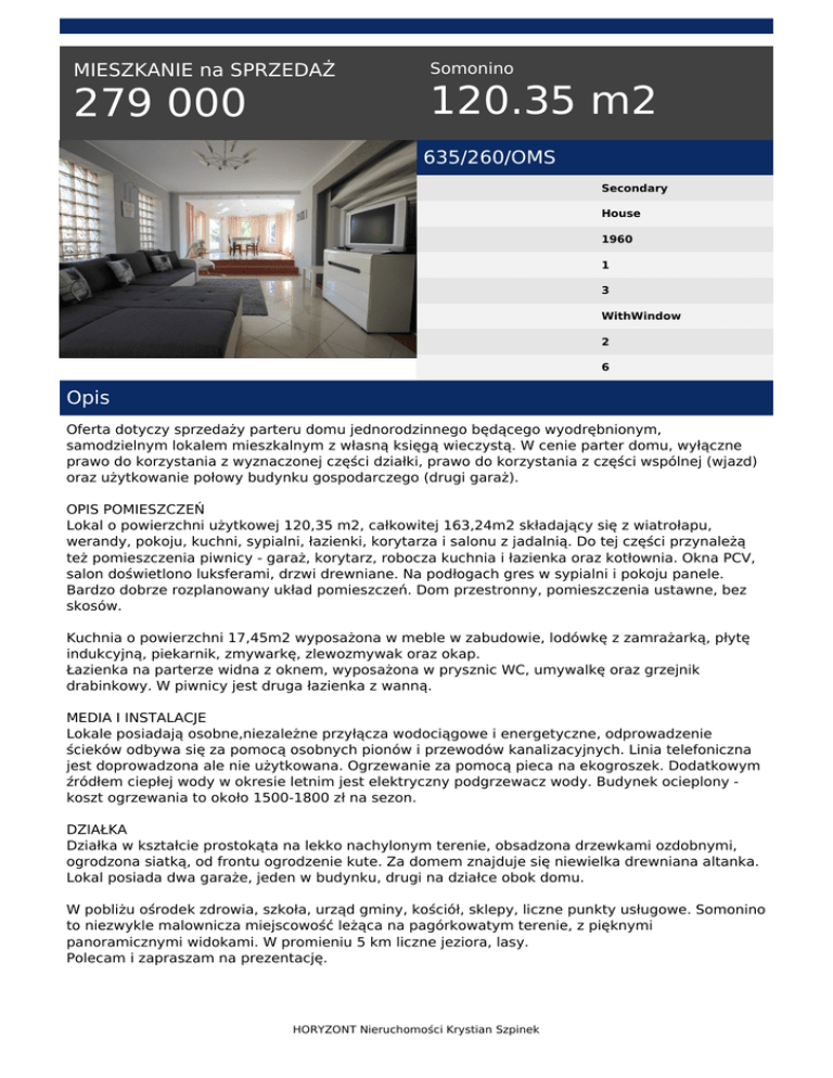 MIESZKANIE na SPRZEDAŻ 279 000 Somonino 120.35 m2 635/260/OMS Secondary House 1960 1 3 WithWindow 2 6 Opis Oferta dotyczy sprzedaży parteru domu jednorodzinnego będącego wyodrębnionym, samodzielnym lokalem mieszkalnym z własną księgą wieczystą. W cenie parter domu, wyłączne prawo do korzystania z wyznaczonej części działki, prawo do korzystania z części wspólnej (wjazd) oraz użytkowanie połowy budynku gospodarczego (drugi garaż). OPIS POMIESZCZEŃ Lokal o powierzchni użytkowej 120,35 m2, całkowitej 163,24m2 składający się z wiatrołapu, werandy, pokoju, kuchni, sypialni, łazienki, korytarza i salonu z jadalnią. Do tej części przynależą też pomieszczenia piwnicy - garaż, korytarz, robocza kuchnia i łazienka oraz kotłownia. Okna PCV, salon doświetlono luksferami, drzwi drewniane. Na podłogach gres w sypialni i pokoju panele. Bardzo dobrze rozplanowany układ pomieszczeń. Dom przestronny, pomieszczenia ustawne, bez skosów. Kuchnia o powierzchni 17,45m2 wyposażona w meble w zabudowie, lodówkę z zamrażarką, płytę indukcyjną, piekarnik, zmywarkę, zlewozmywak oraz okap. Łazienka na parterze widna z oknem, wyposażona w prysznic WC, umywalkę oraz grzejnik drabinkowy. W piwnicy jest druga łazienka z wanną. MEDIA I INSTALACJE Lokale posiadają osobne,niezależne przyłącza wodociągowe i energetyczne, odprowadzenie ścieków odbywa się za pomocą osobnych pionów i przewodów kanalizacyjnych. Linia telefoniczna jest doprowadzona ale nie użytkowana. Ogrzewanie za pomocą pieca na ekogroszek. Dodatkowym źródłem ciepłej wody w okresie letnim jest elektryczny podgrzewacz wody. Budynek ocieplony koszt ogrzewania to około 1500-1800 zł na sezon. DZIAŁKA Działka w kształcie prostokąta na lekko nachylonym terenie, obsadzona drzewkami ozdobnymi, ogrodzona siatką, od frontu ogrodzenie kute. Za domem znajduje się niewielka drewniana altanka. Lokal posiada dwa garaże, jeden w budynku, drugi na działce obok domu. W pobliżu ośrodek zdrowia, szkoła, urząd gminy, kościół, sklepy, liczne punkty usługowe. Somonino to niezwykle malownicza miejscowość leżąca na pagórkowatym terenie, z pięknymi panoramicznymi widokami. W promieniu 5 km liczne jeziora, lasy. Polecam i zapraszam na prezentację. HORYZONT Nieruchomości Krystian Szpinek Nie pobieramy wynagrodzenia od strony kupującej. Gwarantujemy bezpieczeństwo wszystkich realizowanych przez nas transakcji. Posiadamy licencję zawodową pośrednika w obrocie nieruchomościami, a wszystkie transakcje są objęte ochroną ubezpieczeniową. Zapraszamy do kontaktu, bezpłatnie pomagamy w uzyskaniu kredytu bankowego na zakup nieruchomości oraz służymy pomocą i doradztwem w zakresie objętym planowaną przez Państwa inwestycją. Patrycja Dopka tel. 515-29-29-70 email: [email protected] HORYZONT Nieruchomości Krystian Szpinek Powered by TCPDF (www.tcpdf.org)