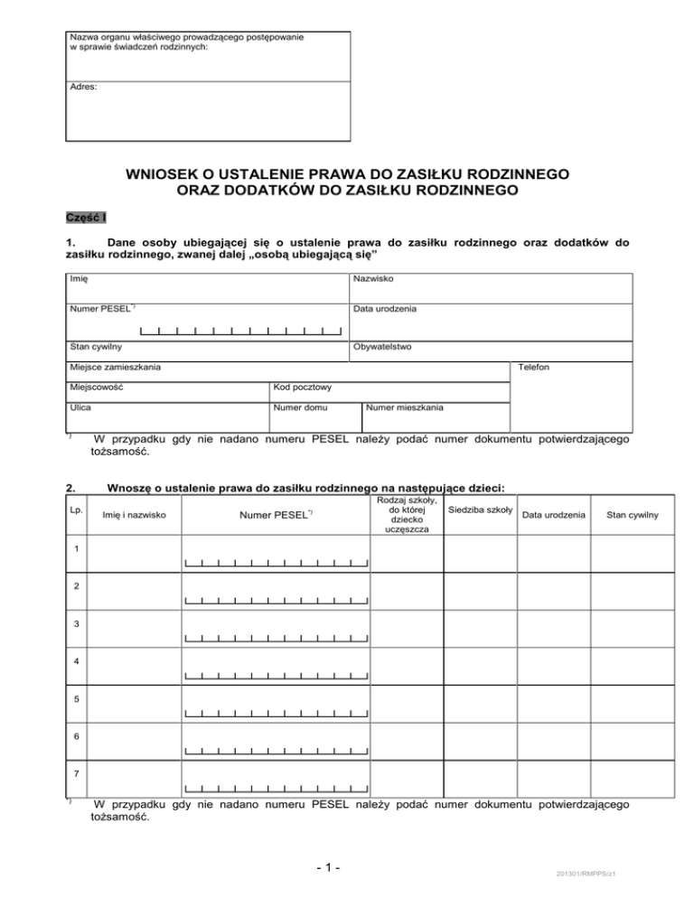 Nazwa organu właściwego prowadzącego postępowanie w sprawie świadczeń rodzinnych: Adres: WNIOSEK O USTALENIE PRAWA DO ZASIŁKU RODZINNEGO ORAZ DODATKÓW DO ZASIŁKU RODZINNEGO Część I 1. Dane osoby ubiegającej się o ustalenie prawa do zasiłku rodzinnego oraz dodatków do zasiłku rodzinnego, zwanej dalej „osobą ubiegającą się” Imię Nazwisko Numer PESEL*) Data urodzenia └─┴─┴─┴─┴─┴─┴─┴─┴─┴─┴─┘ Stan cywilny Obywatelstwo Miejsce zamieszkania Telefon Miejscowość Kod pocztowy Ulica Numer domu *) Numer mieszkania W przypadku gdy nie nadano numeru PESEL należy podać numer dokumentu potwierdzającego tożsamość. 2. Lp. Wnoszę o ustalenie prawa do zasiłku rodzinnego na następujące dzieci: Imię i nazwisko Rodzaj szkoły, do której dziecko uczęszcza Numer PESEL*) Siedziba szkoły Data urodzenia Stan cywilny 1 └─┴─┴─┴─┴─┴─┴─┴─┴─┴─┴─┘ 2 └─┴─┴─┴─┴─┴─┴─┴─┴─┴─┴─┘ 3 └─┴─┴─┴─┴─┴─┴─┴─┴─┴─┴─┘ 4 └─┴─┴─┴─┴─┴─┴─┴─┴─┴─┴─┘ 5 └─┴─┴─┴─┴─┴─┴─┴─┴─┴─┴─┘ 6 └─┴─┴─┴─┴─┴─┴─┴─┴─┴─┴─┘ 7 *) └─┴─┴─┴─┴─┴─┴─┴─┴─┴─┴─┘ W przypadku gdy nie nadano numeru PESEL należy podać numer dokumentu potwierdzającego tożsamość. -1- 201301/RMPPS/z1 oraz dodatków do zasiłku rodzinnego z tytułu: (zakreślić odpowiedni kwadrat i wpisać dane dzieci) urodzenia dziecka ....................................................................., (imię i nazwisko dziecka) ....................................................................., (imię i nazwisko dziecka) ....................................................................., (imię i nazwisko dziecka) ...................................................................... (imię i nazwisko dziecka) opieki nad dzieckiem w okresie korzystania z urlopu wychowawczego (należy wypełnić część II) ....................................................................., (imię i nazwisko dziecka) ..................................................................... (imię i nazwisko dziecka) samotnego wychowywania dziecka (dodatek przysługuje na dwoje dzieci) (należy wypełnić część III) na: ....................................................................., (imię i nazwisko dziecka) ..................................................................... (imię i nazwisko dziecka) wychowywania dziecka w rodzinie wielodzietnej (dodatek przysługuje na trzecie i każde kolejne dziecko uprawnione do zasiłku rodzinnego) na: ....................................................................., (imię i nazwisko dziecka) ..................................................................... (imię i nazwisko dziecka) ....................................................................., (imię i nazwisko dziecka) ..................................................................... (imię i nazwisko dziecka) kształcenia i rehabilitacji dziecka niepełnosprawnego ....................................................................., (imię i nazwisko dziecka) ..................................................................... (imię i nazwisko dziecka) ....................................................................., (imię i nazwisko dziecka) ..................................................................... (imię i nazwisko dziecka) rozpoczęcia roku szkolnego przez: ....................................................................., (imię i nazwisko dziecka) na rok szkolny ..................../.................... ....................................................................., (imię i nazwisko dziecka) na rok szkolny ..................../.................... ....................................................................., (imię i nazwisko dziecka) na rok szkolny ..................../.................... ...................................................................., (imię i nazwisko dziecka) na rok szkolny ...................../................... -2- 201301/RMPPS/z1 podjęcia przez dziecko nauki w szkole poza miejscem zamieszkania (na częściowe pokrycie wydatków związanych z zamieszkaniem w miejscowości, w której znajduje się siedziba szkoły) na: ...................................................................., (imię i nazwisko dziecka) *) na rok szkolny ...................../...................... **) oraz rok szkolny ......................../........................ ....................................................................., (imię i nazwisko dziecka) *) na rok szkolny ...................../...................... **) oraz rok szkolny ......................../........................ ....................................................................., (imię i nazwisko dziecka) *) na rok szkolny ...................../...................... **) oraz rok szkolny ......................../........................ ....................................................................., (imię i nazwisko dziecka) *) na rok szkolny ...................../...................... **) oraz rok szkolny ......................../........................ podjęcia przez dziecko nauki w szkole poza miejscem zamieszkania (na pokrycie wydatków związanych z zapewnieniem dziecku możliwości dojazdu z miejsca zamieszkania do miejscowości, w której znajduje się siedziba szkoły) na: ....................................................................., (imię i nazwisko dziecka) *) na rok szkolny ...................../...................... **) oraz rok szkolny ......................../........................ ....................................................................., (imię i nazwisko dziecka) *) na rok szkolny ...................