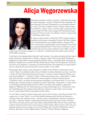 Str. 1 Alicja Węgorzewska mezzosopran Alicja Węgorzewska Śpiewaczka, mezzosopran, urodzona w Szczecinie. Absolwentka klasy fortepianu Liceum Muzycznego w Szczecinie i Wydziału Wokalno-Aktorskiego Akademii Muzycznej w Warszawie. Debiutowała na scenie wiedeńskiej Kammeroper w operze „Die Pilger von Mekka” Glucka. Następnie otrzymała angaż w Neue Oper Wien, a także w Theater an der Wien, gdzie na zaproszenie sekretarza generalnego ONZ Kofi Annana wystąpiła obok takich gwiazd mezzosopranowych jak Fiorenza Cossotto i Grace Bumbry w koncercie z okazji narodzi 6- miliardowego obywatela Ziemi. W nagrodę za wygrany konkurs w Rheinsbergu (1999) I nagroda wystąpiła w tamtejszym teatrze operowym w koprodukcji z Deutsche Oper Berlin w głównej roli w światowej prapremierze opery Siegfrieda Matthusa „Kronprinz Friedrich”w reżyserii jednego z najwybitniejszych reżyserów operowych Goetza Friedricha oraz pod dyrekcją Rolfa Reutera. Premiera była transmitowana na żywo w niemieckim radiu. Jej kreacja zebrała znakomite recenzje. Odbyła z tym spekta-klem tournee po Niemczech, występując m.in. w Bayreuth i w niemieckim pawi-lonie podczas wystawy światowej EXPO 2000 w Hanowerze. Uczestniczyła w wielu międzynarodowych festiwalach i galach operowych, m.in. podczas prestiżowego festiwalu muzy-ki dawnej w Innsbrucku, Donaufestwochen w Wiedniu, a także gali z okazji 750-lecia miasta Bredy. Występowała z frankfurckim Ensemble Modern, śpiewając pod dyrekcją Markusa Stenza i z Staatskapelle Berlin, którą dyrygo-wał Rolf Reuter. Współpracowała z teatrami w Wiedniu, Berlinie, Bayreuth, Monte Carlo. Występowała w tak prestiżowych salach, jak Concertgebouw w Amsterdamie czy berliński Konzerthaus. Wart odnotowania jest także jej udział w koncercie z okazji 40-lecia pracy Katii Ricciarelli w słynnej weneckiej La Fenice (2010). Bardzo prędko zdobyła uznanie w kraju. Występowała w łódzkim Teatrze Wielkim w tytułowej partii w operze „Carmen” Bizeta. Z tym spektaklem odbyła tournee po Holandii (Amsterdam, Rotterdam oraz sławny Lucent Dance Theater). W Operze Krakowskiej śpiewała partię Lukrecji w „Gwałcie na Lukrecji” Benjamina Brittena oraz w dwóch innych produkcjach – w „Orfeuszu i Eurydyce” Glucka (partia Orfeusza) oraz w „Damie pikowej” Czajkowskiego (partia Hrabiny). Na deskach Filharmonii Narodowej wystąpiła w Galowym Finałowym Koncercie ”Lutosławski Awards”, wy-konując światową prapremierę nagrodzonych w tym konkursie pieśni. Na scenie Teatru Wielkiego Opery Narodowej wystą-piła w tytułowej roli w operze Czajkowskiego „Dama pikowa” w reżyserii Mariusza Trelińskiego pod dyrekcją Kazimierza Korda. W 2007 w tym samym teatrze wystąpiła w „Opowieściach Hoffmanna” Offenbacha jako Głos Matki (pod dyrek-cją Tadeusza Kozłowskiego) oraz w ”Krakowiakach i Góralach” Kurpińskiego jako Dorota (dyrygent Łukasz Borowicz). Zaśpiewała tu także Siebela w operze Gounoda „Faust” w reżyserii Roberta Wilsona i pod dyrekcją Gabriela Chmury. Na scenie Opery na Zamku w Szczecinie można ją było usłyszeć w partii Santuzzy w „Rycerskości wieśniaczej” Masca-gniego oraz w „Carmen” Bizeta. Na scenie Opery Bałtyckiej wykonywała partię tytułową rolę Oktawiana w „Kawalerze srebrnej róży” Ryszarda Straussa – uważaną za jedną z najtrudniejszych w repertuarze mezzosopranowym; Olgi w „Eugeniuszu Onieginie” Czajkowskiego (kierownictwo muzyczne Jose Maria Florencio, inscenizacja Marek Weiss) i po-nownie patię Lukrecji w operze Brittena (Spektakl Roku 2008). Wiesław Ochman zaprosił śpiewaczkę do wykonywania partii Carmen w jego inscenizacji w Operze Śląskiej w Bytomiu. Partię tę, która stała się jej wizytówką artystyczna, kreo-wała także na scenie Teatru Wielkiego Opery Narodowej (2010) pod dyr. Łukasza Borowicza. Była gościem Festiwalu Hoffmanowskiego w Poznaniu i Festiwalu Operowego w Bydgoszczy. Str. 2 Alicja Węgorzewska mezzosopran Alicja Węgorzewska W 2008 dała szereg świetnie przyjętych świetnie przyjętych recitali, m. in. w Kuwejcie i Bahrajnie oraz koncerty w Duesseldorfie (Requiem Verdiego). W 2009 roku wzięła udział w produkcji „Złoto Renu” Wagnera pod dyrekcją Jana Lathama Koeniga z okazji 100-lecia Opery Leśnej i reaktywacji Festiwalu Wagnerowskiego. W tym samym roku wystąpiła w partii Carmen oraz w Gali finałowej Międzynarodowego Festiwalu Operowego Maria Biesu w Kiszyniowie. Ważny w jej karierze był rok 2010 Rok Chopinowski. Nagrała wówczas dla Hungarotonu Classic i Fuzeau Classique wraz z wybitnym węgierskim wirtuozem Alexem Szilasi wszystkie pieśni Chopina. W Budapeszcie Kon-certem Galowym otwierała obchody roku Chopinowskiego na Węgrzech, oraz zamykała go koncertami w Nowym Yorku w Yamaha hall, a także w Qatarze. W grudniu tegoż roku po raz pierwszy wyreżyserowała „Carmen” i zaśpiewała w niej tytułowa rolę w Kuwejcie oraz Bahrajnie. Jest laureatką nagrody polskiej estrady Prometeusz (2007). Artystka brała udział w nagraniu ścieżki dźwiękowej do filmu Wiedźmin, za którą otrzymała Złotą Pły-tę. Promuje sztukę operową także poza murami teatrów i sal koncertowych. Często gości w mediach. Wystąpiła jako gość w wielu programach telewizyjnych jak ”Śpiewające fortepiany”, „Jaka to melodia”, „Kocham Cię Pol-sko” ,”Familiada” przeznaczając wygrane fundusze na cel charytatywny. Trzykrotnie wraz z widzami Polsatu o północy witała Nowy Rok występami na żywo w Krakowie na Rynku Starego Miasta oraz na placu Konstytucji w Warszawie. W 2009 zagrała w serialu telewizyjnym ”Dom nad rozlewiskiem” w roli śpiewaczki operowej, Joanny. Zdobyła ogromną popularność jako charyzmatyczny i kompetentny juror w programie „Bitwa na głosy”. Pisuje felietony o operze; założyła i prowadzi Fundację STARTSMART, która zajmuje się świadomą i szeroko pojętą edukacją dzieci. Rok 