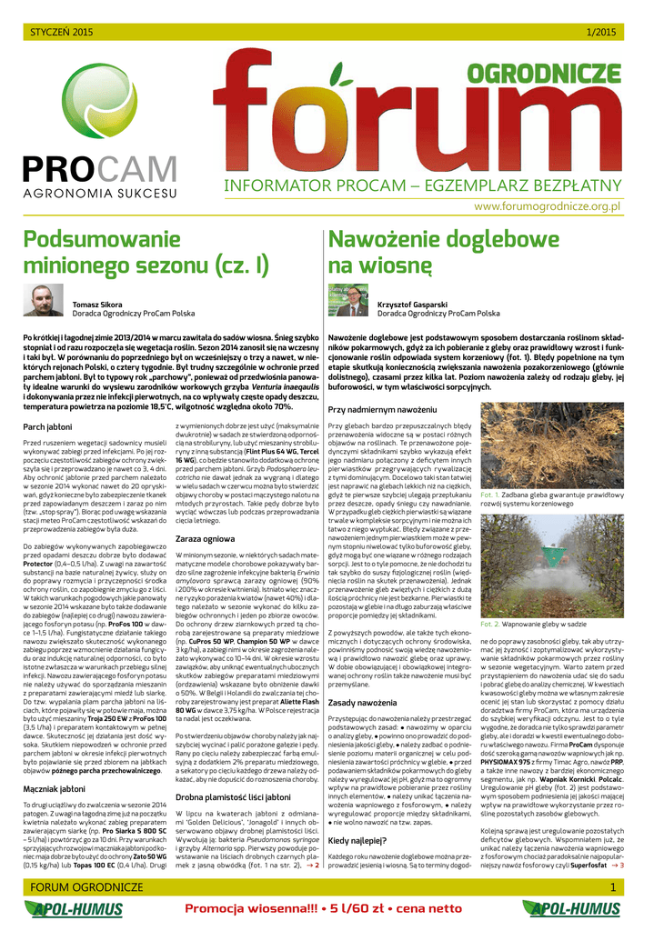 STYCZEŃ 2015 1/2015 INFORMATOR PROCAM – EGZEMPLARZ BEZPŁATNY www.forumogrodnicze.org.pl Podsumowanie minionego sezonu (cz. I) Nawożenie doglebowe na wiosnę Tomasz Sikora Doradca Ogrodniczy ProCam Polska Krzysztof Gasparski Doradca Ogrodniczy ProCam Polska Po krótkiej i łagodnej zimie 2013/2014 w marcu zawitała do sadów wiosna. Śnieg szybko stopniał i od razu rozpoczęła się wegetacja roślin. Sezon 2014 zanosił się na wczesny i taki był. W porównaniu do poprzedniego był on wcześniejszy o trzy a nawet, w niektórych rejonach Polski, o cztery tygodnie. Był trudny szczególnie w ochronie przed parchem jabłoni. Był to typowy rok „parchowy”, ponieważ od przedwiośnia panowały idealne warunki do wysiewu zarodników workowych grzyba Venturia inaeqaulis i dokonywania przez nie infekcji pierwotnych, na co wpływały częste opady deszczu, temperatura powietrza na poziomie 18,5°C, wilgotność względna około 70%. Nawożenie doglebowe jest podstawowym sposobem dostarczania roślinom składników pokarmowych, gdyż za ich pobieranie z gleby oraz prawidłowy wzrost i funkcjonowanie roślin odpowiada system korzeniowy (fot. 1). Błędy popełnione na tym etapie skutkują koniecznością zwiększania nawożenia pozakorzeniowego (głównie dolistnego), czasami przez kilka lat. Poziom nawożenia zależy od rodzaju gleby, jej buforowości, w tym właściwości sorpcyjnych. Parch jabłoni Przy glebach bardzo przepuszczalnych błędy przenawożenia widoczne są w postaci różnych objawów na roślinach. Te przenawożone pojedynczymi składnikami szybko wykazują efekt jego nadmiaru połączony z deficytem innych pierwiastków przegrywających rywalizację z tymi dominującym. Docelowo taki stan łatwiej jest naprawić na glebach lekkich niż na ciężkich, gdyż te pierwsze szybciej ulegają przepłukaniu przez deszcze, opady śniegu czy nawadnianie. W przypadku gleb ciężkich pierwiastki są wiązane trwale w kompleksie sorpcyjnym i nie można ich łatwo z niego wypłukać. Błędy związane z przenawożeniem jednym pierwiastkiem może w pewnym stopniu niwelować tylko buforowość gleby, gdyż mogą być one wiązane w różnego rodzajach sorpcji. Jest to o tyle pomocne, że nie dochodzi tu tak szybko do suszy fizjologicznej roślin (więdnięcia roślin na skutek przenawożenia). Jednak przenawożenie gleb zwięzłych i ciężkich z dużą ilością próchnicy nie jest bezkarne. Pierwiastki te pozostają w glebie i na długo zaburzają właściwe proporcje pomiędzy jej składnikami. Przed ruszeniem wegetacji sadownicy musieli wykonywać zabiegi przed infekcjami. Po jej rozpoczęciu częstotliwość zabiegów ochrony zwiększyła się i przeprowadzano je nawet co 3, 4 dni. Aby ochronić jabłonie przed parchem należało w sezonie 2014 wykonać nawet do 20 opryskiwań, gdyż konieczne było zabezpieczenie tkanek przed zapowiadanym deszczem i zaraz po nim (tzw. „stop spray”). Biorąc pod uwagę wskazania stacji meteo ProCam częstotliwość wskazań do przeprowadzenia zabiegów była duża. Do zabiegów wykonywanych zapobiegawczo przed opadami deszczu dobrze było dodawać Protector (0,4–0,5 l/ha). Z uwagi na zawartość substancji na bazie naturalnej żywicy, służy on do poprawy rozmycia i przyczepności środka ochrony roślin, co zapobiegnie zmyciu go z liści. W takich warunkach pogodowych jakie panowały w sezonie 2014 wskazane było także dodawanie do zabiegów (najlepiej co drugi) nawozu zawierającego fosforyn potasu (np. ProFos 100 w dawce 1–1,5 l/ha). Fungistatyczne działanie takiego nawozu zwiększało skuteczność wykonanego zabiegu poprzez wzmocnienie działania fungicydu oraz indukcję naturalnej odporności, co było istotne zwłaszcza w warunkach przebiegu silnej infekcji. Nawozu zawierającego fosforyn potasu nie należy używać do sporządzania mieszanin z preparatami zawierającymi miedź lub siarkę. Do tzw. wypalania plam parcha jabłoni na liściach, które pojawiły się w połowie maja, można było użyć mieszaniny Troja 250 EW z ProFos 100 (3,5 l/ha) i preparatem kontaktowym w pełnej dawce. Skuteczność jej działania jest dość wysoka. Skutkiem niepowodzeń w ochronie przed parchem jabłoni w okresie infekcji pierwotnych było pojawianie się przed zbiorem na jabłkach objawów późnego parcha przechowalniczego. Mączniak jabłoni To drugi uciążliwy do zwalczenia w sezonie 2014 patogen. Z uwagi na łagodną zimę już na początku kwietnia należało wykonać zabieg preparatem zawierającym siarkę (np. Pro Siarka S 800 SC – 5 l/ha) i powtórzyć go za 10 dni. Przy warunkach sprzyjających rozwojowi mączniaka jabłoni pod koniec maja dobrze było użyć do ochrony Zato 50 WG (0,15 kg/ha) lub Topas 100 EC (0,4 l/ha). Drugi Przy nadmiernym nawożeniu z wymienionych dobrze jest użyć (maksymalnie dwukrotnie) w sadach ze stwierdzoną odpornością na strobiluryny, lub użyć mieszaniny strobiluryny z inną substancją (Flint Plus 64 WG, Tercel 16 WG), co będzie stanowiło dodatkową ochronę przed parchem jabłoni. Grzyb Podosphaera leucotricha nie dawał jednak za wygraną i dlatego w wielu sadach w czerwcu można było stwierdzić objawy choroby w postaci mączystego nalotu na młodych przyrostach. Takie pędy dobrze było wyciąć wówczas lub podczas przeprowadzania cięcia letniego. Zaraza ogniowa W minionym sezonie, w niektórych sadach matematyczne modele chorobowe pokazywały bardzo silne zagrożenie infekcyjne bakterią Erwinia amylovora sprawcą zarazy ogniowej (90% i 200% w okresie kwitnienia). Istniało więc znaczne ryzyko porażenia kwiatów (nawet 40%) i dlatego należało w sezonie wykonać do kilku zabiegów ochronnych i jeden po zbiorze owoców. Do ochrony drzew ziarnkowych przed tą chorobą zarejestrowane są preparaty miedziowe (np. CuPros 50 WP, Champion 50 WP w dawce 3 kg/ha), a zabiegi nimi w okresie zagrożenia należało wykonywać co 10–14 dni. W okresie wzrostu zawiązków, aby uniknąć ewentu