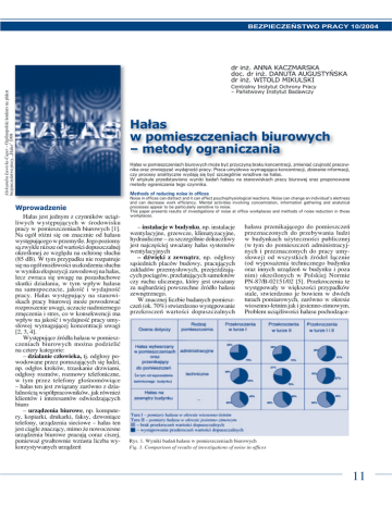 BEZPIECZEŃSTWO PRACY 10/2004 dr inż. ANNA KACZMARSKA doc. dr inż. DANUTA AUGUSTYŃSKA dr inż. WITOLD MIKULSKI Aleksandra Ławicka-Cuper – Ogólnopolski konkurs na plakat bezpieczeństwa pracy, „Hałas” 1998 Centralny Instytut Ochrony Pracy – Państwowy Instytut Badawczy Hałas w pomieszczeniach biurowych – metody ograniczania Hałas w pomieszczeniach biurowych może być przyczyną braku koncentracji, zmieniać czujność pracownika oraz zmniejszać wydajność pracy. Praca umysłowa wymagająca koncentracji, zbieranie informacji, czy procesy analityczne wydają się być szczególnie wrażliwe na hałas. W artykule przedstawiono wyniki badań hałasu na stanowiskach pracy biurowej oraz proponowane metody ograniczania tego czynnika. Methods of reducing noise in offices Wprowadzenie Hałas jest jednym z czynników uciążliwych występujących w środowisku pracy w pomieszczeniach biurowych [1]. Na ogół różni się on znacznie od hałasu występującego w przemyśle. Jego poziomy są zwykle niższe od wartości dopuszczalnej określonej ze względu na ochronę słuchu (85 dB). W tym przypadku nie rozpatruje się na ogół możliwości uszkodzenia słuchu w wyniku ekspozycji zawodowej na hałas, lecz zwraca się uwagę na pozasłuchowe skutki działania, w tym wpływ hałasu na samopoczucie, jakość i wydajność pracy. Hałas występujący na stanowiskach pracy biurowej może powodować rozproszenie uwagi, uczucie nadmiernego zmęczenia i stres, co w konsekwencji ma wpływ na jakość i wydajność pracy umysłowej wymagającej koncentracji uwagi [2, 3, 4]. Występujące źródła hałasu w pomieszczeniach biurowych można podzielić na cztery kategorie: – działanie człowieka, tj. odgłosy powodowane przez poruszających się ludzi, np. odgłos kroków, trzaskanie drzwiami, odgłosy rozmów, rozmowy telefoniczne, w tym przez telefony głośnomówiące – hałas ten jest związany zarówno z działalnością współpracowników, jak również klientów i interesantów odwiedzających biuro – urządzenia biurowe, np. komputery, kopiarki, drukarki, faksy, dzwoniące telefony, urządzenia sieciowe – hałas ten jest ciągle znaczący, mimo że nowoczesne urządzenia biurowe pracują coraz ciszej, ponieważ gwałtownie wzrasta liczba wykorzystywanych urządzeń Noise in offices can distract and it can affect psychophysiological reactions. Noise can change an individual’s alertness and can decrease work efficiency. Mental activities involving concentration, information gathering and analytical processes appear to be particularly sensitive to noise. This paper presents results of investigations of noise at office workplaces and methods of noise reduction in those workplaces. – instalacje w budynku, np. instalacje wentylacyjne, grzewcze, klimatyzacyjne, hydrauliczne – za szczególnie dokuczliwy jest najczęściej uważany hałas systemów wentylacyjnych – dźwięki z zewnątrz, np. odgłosy sąsiednich placów budowy, pracujących zakładów przemysłowych, przejeżdżających pociągów, przelatujących samolotów czy ruchu ulicznego, który jest uważany za najbardziej powszechne źródło hałasu zewnętrznego. W znacznej liczbie badanych pomieszczeń (ok. 70%) stwierdzono występowanie przekroczeń wartości dopuszczalnych hałasu przenikającego do pomieszczeń przeznaczonych do przebywania ludzi w budynkach użyteczności publicznej (w tym do pomieszczeń administracyjnych i przeznaczonych do pracy umysłowej) od wszystkich źródeł łącznie (od wyposażenia technicznego budynku oraz innych urządzeń w budynku i poza nim) określonych w Polskiej Normie PN-87/B-02151/02 [5]. Przekroczenia te występowały w większości przypadków stale, stwierdzono je bowiem w dwóch turach pomiarowych, zarówno w okresie wiosenno-letnim jak i jesienno-zimowym. Problem uciążliwości hałasu pochodzące- Rys. 1. Wyniki badań hałasu w pomieszczeniach biurowych Fig. 1. Comparison of results of investigations of noise in offices 11 BEZPIECZEŃSTWO PRACY 10/2004 go od wyposażenia technicznego budynku (np. od systemu klimatyzacji, dźwigów osobowych, urządzeń rozsyłania sieci informatycznej itp.) dotyczył nawet najnowszych budynków biurowych. W przypadku hałasu zewnętrznego (pochodzącego od ruchu ulicznego) występowanie przekroczeń wartości dopuszczalnych (określonych w rozporządzeniu ministra ochrony środowiska, zasobów naturalnych i leśnictwa [4]) stwierdzono w odniesieniu tylko do dwóch budynków (badano 5 budynków) zlokalizowanych przy bardzo ruchliwych ulicach. Wyniki omawianych badań przedstawiono na rys. 1. (str. 11.). Metody ograniczania hałasu w pomieszczeniach biurowych Hałas w pomieszczeniach biurowych można ograniczyć przez zastosowanie środków technicznych, bądź organizacyjno-administracyjnych. Techniczne środki ograniczania hałasu w środowisku pracy w pomieszczeniach biurowych obejmują [6, 7]: – ograniczenie emisji hałasu przez źródła (tj. ograniczenie hałasu u źródeł jego powstawania) – ograniczenie transmisji hałasu, tj. ograniczenie energii wibroakustycznej na drogach jej przenoszenia – ograniczenie imisji hałasu (tj. hałasu docierającego do określonych obszarów pomieszczeń biurowych oraz na określone stanowiska pracy). Środki organizacyjno-administracyjne obejmują np. stosowanie przerw i ograniczenie czasu pracy, tworzenie oaz ciszy i wydzielanie pomieszczeń i obszarów do prac koncepcyjnych od pomieszczeń zawierających źródła hałasu. Zalecenia techniczne – metody i środki ograniczania transmisji i imisji hałasu Przegrody i elementy budowlane – zabezpieczenia budowlano-konstrukcyjne W zależności od przeznaczenia i lokalizacji pomieszczeń biurowych niektóre z nich (np. pomieszczenia ciche do prac koncepcyjnych, pomieszczenia do prowadzenia rozmów poufnych, pokoje wy- 12 poczynkowe, pomieszczenia przyległe do pomieszczeń technicznych, wyposażenia instalacyjnego budynku) powinny m