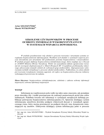 ZESZYTY NAUKOWE WSOWL Nr 2 (156) 2010 ISSN 1731-8157 Artur SZLESZYŃSKI Marek WITKOWSKI SZKOLENIE UŻYTKOWNIKÓW W PROCESIE OCHRONY INFORMACJI WYKORZYSTYWANYCH W SYSTEMACH WSPARCIA DOWODZENIA W artykule przedstawiono rolę szkoleń w procesie tworzenia i utrzymania systemu zarządzania bezpieczeństwem informacyjnym. Wynikiem tych działań w systemach wsparcia procesu dowodzenia jest utrzymanie lub podniesienie poziomu bezpieczeństwa i niezawodności. W artykule przyjęto definicję bezpieczeństwa teleinformatycznego, która znajduje się w Decyzji nr 24/MON Ministra Obrony Narodowej. Wybór ten uzasadniono faktem ograniczenia rozważań do rozwiązań eksploatowanych w Siłach Zbrojnych RP. Uwypuklono problematykę właściwego adresowania tematyki szkoleń do wybranych grup użytkowników. Zaproponowano wykorzystanie techniki wirtualizacji w procesie szkoleń użytkowników. Podkreślono, że celem szkoleń jest tworzenie świadomości istnienia zagrożeń, ich wpływ na bezpieczeństwo fizyczne żołnierzy wykonujących powierzone im zadania. Słowa kluczowe: bezpieczeństwo teleinformatyczne, szkolenia z zakresu ochrony informacji niejawnych, ochrona informacji niejawnych WSTĘP - Informacja na współczesnym polu walki ma takie samo znaczenie, jak posiadane przez dowódcę siły i środki przeznaczone do realizacji postawionych przed nim celów militarnych. Podobnie kwestie roli informacji w systemach zarządczych definiują publikacje poświęcone bezpieczeństwu informacyjnemu [7]. Sprawnie działający system informacyjny umożliwia dowódcy podjęcie właściwych decyzji w warunkach ograniczonego czasu, który można przeznaczyć na podjęcie decyzji, oraz dynamicznie zmieniających się zasobów. Efektywnie działający system informacyjny pełni w procesie - - - - kpt. mgr inż. Artur SZLESZYŃSKI – Wydział Zarządzania Wyższej Szkoły Oficerskiej Wojsk Lądowych kpt. mgr inż. Marek WITKOWSKI – Instytut Dowodzenia Wyższej Szkoły Oficerskiej Wojsk Lądowych Artur SZLESZYŃSKI, Marek WITKOWSKI dowodzenia rolę homeostatu, który pozwala na osiągnięcie zamierzonych celów działania [8]. Dlatego należy dążyć, w czasie użytkowania systemu informacyjnego, do eliminacji lub redukcji poziomu szumu informacyjnego. Zjawisko szumu informacyjnego, które może wystąpić w trakcie eksploatacji rozwiązania, wpływa na zmniejszenie stopnia uporządkowania systemu oraz ogranicza jego efektywność1 [8]. Jedną z miar oceniających stopień ograniczenia efektywności systemu informacyjnego, wykorzystywanego w procesie dowodzenia jest zwiększenie wartości inercji czasowej rozwiązania polegającej na dłuższym czasie potrzebnym do wypracowania i przekazania decyzji do wszystkich węzłów znajdujących się w hierarchii organizacji. Z uwagi na to, że informacja ma wiele źródeł i postaci (np. przekaz ustny, tekst, szkic, rysunek), jej ochrona jest przedsięwzięciem trudnym [7]. Stwierdzenie faktu zmiany treści komunikatu, jego zniszczenia lub nieuprawnionego dostępu jest trudne lub niemożliwe, a następuje dopiero po wystąpieniu jednego z wymienionych wcześniej incydentów. Organizacja chcąc chronić posiadane zasoby informacyjne, powinna utworzyć system zarządzania bezpieczeństwem informacji. Zadaniem rozwiązania jest identyfikacja zasobów wrażliwych oraz zaplanowanie działań redukujących wykryte ryzyka do poziomu akceptowalnego przez właścicieli odpowiedzialnych za wykorzystanie chronionych zasobów [1,7]. W przypadku systemów odpowiedzialnych za wspomaganie procesu dowodzenia informacja przetwarzana w nich jest informacją niejawną w rozumieniu ustawy o ochronie informacji niejawnych. Fakt, że przetwarzana informacja jest niejawna, nakłada na korzystających z niej użytkowników określone wymagania zawarte w ustawie, rozporządzeniach czy decyzjach [11,12,13,14,15]. - - Ponieważ wcześniej stwierdzono, że decyzje powinny zostać podjęte w jak najkrótszym czasie, a następnie muszą zostać przekazane do ich odbiorców, również w jak najkrótszym czasie, można przyjąć, że wymaganie to jest w stanie zrealizować sprawnie działający system teleinformatyczny. Środki informatyczne wchodzące w skład rozwiązania powinny zautomatyzować proces gromadzenia, selekcji i przetwarzania informacji. Zadaniem elementu telekomunikacyjnego, wchodzącego w skład rozwiązania, jest dostarczenie informacji do odbiorcy. Z przesyłaniem informacji w kanale telekomunikacyjnym związane jest występowanie zakłóceń mających wpływ na treść komunikatu, dlatego istotne jest zapewnienie odpowiedniego poziomu ochrony przekazywanych wiadomości. Poziom ochrony związany jest atrybutami bezpieczeństwa informacji, do których należą: poufność, integralność i dostępność [7]. W literaturze przedmiotu pojawiło się nowe pojęcie wojny błyskawicznej [2] (ang. instant war), która będzie atrybutem społeczeństw informacyjnych. Według niej przyszłe wojny nie będą wymagały zaangażowania dużych zasobów ludzkich, jak miało to miejsce w dawnych i obecnych konfliktach zbrojnych. W miejsce żołnierzy z poboru pojawią się osoby posiadające wiedzę oraz urządzenia; przetwarzając dużą liczbę informacji o przeciwniku, pozwolą dowódcy na podjęcie właściwej decyzji, co w rezultacie będzie skutkować eliminacją przeciwnika z pola walki. Można przyjąć, że podobnie jak wojska własne, przyszły przeciwnik będzie używał podobnych rozwiązań. Dlatego ważnym zadaniem, spoczywającym na użytkownikach opisanego rozwiązania, będzie zapewnienie należytego - - - 1 Pojęcie efektywność rozumiane jest, jako zdolność obiektu do zaspokajania związanych z nim potrzeb użytkowników. 194 ROLA SZKOLEŃ UŻYTKOWNIKÓW W PROCESIE OCHRONY INFORMACJI… poziomu bezpieczeństwa i ochrony własnych danych przed rozpoznaniem ze strony przeciwnika. Na potrzeby artykułu zdefiniowano pojęcie bezpieczeństwa teleinformatycznego. Termin te
