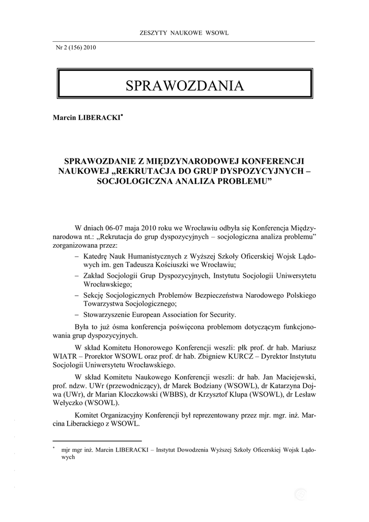 ZESZYTY NAUKOWE WSOWL Nr 2 (156) 2010 ISSN 1731-8157 SPRAWOZDANIA Marcin LIBERACKI SPRAWOZDANIE Z MIĘDZYNARODOWEJ KONFERENCJI NAUKOWEJ „REKRUTACJA DO GRUP DYSPOZYCYJNYCH – SOCJOLOGICZNA ANALIZA PROBLEMU” W dniach 06-07 maja 2010 roku we Wrocławiu odbyła się Konferencja Międzynarodowa nt.: „Rekrutacja do grup dyspozycyjnych – socjologiczna analiza problemu” zorganizowana przez: Katedrę Nauk Humanistycznych z Wyższej Szkoły Oficerskiej Wojsk Lądowych im. gen Tadeusza Kościuszki we Wrocławiu; Zakład Socjologii Grup Dyspozycyjnych, Instytutu Socjologii Uniwersytetu Wrocławskiego; Sekcję Socjologicznych Problemów Bezpieczeństwa Narodowego Polskiego Towarzystwa Socjologicznego; Stowarzyszenie European Association for Security. Była to już ósma konferencja poświęcona problemom dotyczącym funkcjonowania grup dyspozycyjnych. W skład Komitetu Honorowego Konferencji weszli: płk prof. dr hab. Mariusz WIATR – Prorektor WSOWL oraz prof. dr hab. Zbigniew KURCZ – Dyrektor Instytutu Socjologii Uniwersytetu Wrocławskiego. Komitet Organizacyjny Konferencji był reprezentowany przez mjr. mgr. inż. Marcina Liberackiego z WSOWL. - - W skład Komitetu Naukowego Konferencji weszli: dr hab. Jan Maciejewski, prof. ndzw. UWr (przewodniczący), dr Marek Bodziany (WSOWL), dr Katarzyna Dojwa (UWr), dr Marian Kloczkowski (WBBS), dr Krzysztof Klupa (WSOWL), dr Lesław Wełyczko (WSOWL). - - - mjr mgr inż. Marcin LIBERACKI – Instytut Dowodzenia Wyższej Szkoły Oficerskiej Wojsk Lądowych SPRAWOZDANIE Z MIĘDZYNARODOWEJ KONFERENCJI NAUKOWEJ „REKRUTACJA DO… Głównym celem konferencji był rozwój wiedzy socjologicznej na temat procesu rekrutacji do grup dyspozycyjnych oraz wypracowanie rekomendacji dla instytucji zajmujących się zarządzaniem kadrami w tych grupach1. W konferencji wzięło udział ponad 140 uczestników. W czasie dwudniowych obrad zrealizowanych w ramach sześciu sesji zaprezentowano ponad dwadzieścia referatów. W obradach uczestniczyli naukowcy i badacze problematyki grup dyspozycyjnych reprezentujący kilkanaście ośrodków, m.in.: Wyższą Szkołę Oficerską Wojsk Lądowych z Wrocławia, Szkołę Policji w Szczytnie i w Katowicach, Wyższą Szkołę Oficerską Sił Powietrznych z Dęblina, Wojskową Akademię Techniczną z Warszawy, Uniwersytet Wrocławski, Uniwersytet Łódzki, Uniwersytet Szczeciński, Akademię Pomorską ze Słupska, Akademię im. Jana Długosza z Częstochowy, Górnośląską Wyższą Szkołę Handlową im. Wojciecha Korfantego, Wojskowe Biuro Badań Socjologicznych. W konferencji udział wzięli liczni goście zagraniczni, a wśród nich: prof. František Škvrnda - Fakulta medzinárodných vzťahov, Ekonomická univerzita, Bratislava – Słowacja; prof. Jozef Matis - Akademia ozbrojených síl gen.M.R.Štefánika, Liptovsky Mikulaš – Słowacja; dr Zuzana Korčoková - Akademia Ozbrojených Síl gen. M.R.Štefánika, Liptovsky Mikulaš – Słowacja; dr Jana Plachá - Akademia Ozbrojených Síl gen. M.R.Štefánika, Liptovsky Mikulaš – Słowacja; dr Vanda Smetanová – Słowacja; associate professor Vasiliy Mironovich Zaplatinskiy, National Aviation University (Kiev) – Ukraina; dr Inga Uriadnikowa – Ukraina. Wsparcia merytorycznego referentom i uczestnikom konferencji ponadto udzielili: Dziekan Wydziału Zarządzania WSOWL - płk dr hab. Henryk Spustek, prof. ndzw. WSOWL; Dziekan Wydziału Nauk Społecznych Uniwersytetu Wrocławskiego - dr hab. Jerzy Juchnowski, prof. ndzw. UWr; Prodziekan ds. ogólnych i studenckich dr hab. Wanda Patrzałek, prof. ndzw. UWr; prof. dr hab. Andrzej Pepłoński; prof. dr hab. Kazimierz Doktór; dr hab. Zdzisław Morawski, prof. ndzw. UWr; dr hab. Krzysztof Czekaj, prof. ndzw. Górnośląskiej Wyższej Szkoły Handlowej im. Wojciecha Korfantego; dr hab. Henryk Ćwięk prof. ndzw. Akademii im. Jana Długosza z Częstochowy; dr hab. Włodzimierz Chojnacki. Obszar tematyczny zrealizowanej konferencji obejmował następujące zagadnienia: 1 Komunikat nr 1 do konferencji. - - - - prezentacja wyników badań empirycznych dotyczących rekrutacji do grup dyspozycyjnych prowadzonych przez różne ośrodki socjologiczne; wypracowanie kierunków dalszych badań na bazie wniosków z dyskusji z udziałem środowisk naukowych; - 253 Marcin LIBERACKI doskonalenie warsztatu metodologicznego rozpoznawania procesów społecznych związanych z rekrutacją kadr dla wojska, policji, straży granicznej; upowszechnienie wyników dociekań naukowych odnoszących się do procesu rekrutacji poprzez publikację materiałów pokonferencyjnych; przygotowanie rekomendacji działań wojska, policji i innych grup dyspozycyjnych odnoszących się do procesu naboru i selekcji kadr; wypracowanie wniosków mających na celu poprawę jakości działań promujących służbę w grupach dyspozycyjnych2. Konferencja rozpoczęła się od wystąpienia prof. dr. hab. Jana Maciejewskiego – Kierownika Zakładu Socjologii Grup Dyspozycyjnych, Instytutu Socjologii Uniwersytetu Wrocławskiego. Następnie głos zabrała dr Aleksandra Perchla-Włosik - Zastępca Dyrektora Instytutu Socjologii ds. ogólnych Uniwersytetu Wrocławskiego, artykułując kontynuację oraz potrzebę organizowania tego typu konferencji. Pierwszą, uroczystą część konferencji, zakończyło wystąpienie płk. prof. dr. hab. Mariusza Wiatra – Prorektora Wyższej Szkoły Oficerskiej Wojsk Lądowych im. gen. Tadeusza Kościuszki we Wrocławiu (rys. 1). Rys. 1. Rozpoczęcie konferencji. Od lewej: ppłk dr Krzysztof Klupa – Szef Katedry Nauk Humanistycznych WSOWL, płk prof. dr hab. Mariusz Wiatr – Prorektor WSOWL, dr Aleksandra Perchla-Włosik - Zastępca Dyrektora Instytutu Socjologii ds. ogólnych Uniwersytetu Wrocławskiego, dr hab. Jan Maciejewski, prof. nadzw. Uniwersytetu Wrocławskiego W pierwszym dniu konferencji uczestnicy w trakcie czterech sesji wysłuchali 16 następujących referatów: „Proces rekrutacji i szkolenia agentów służb sp