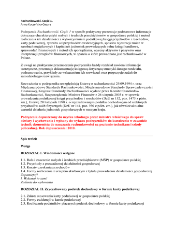 Rachunkowość. Część 1. Anna Kuczyńska-Cesarz Podręcznik Rachunkowość. Część 1 w sposób praktyczny prezentuje podstawowe informacje dotyczące charakterystyki małych i średnich przedsiębiorstw w gospodarce polskiej i metod rozliczania ich działalności z wykorzystaniem podatkowej księgi przychodów i rozchodów, karty podatkowej, ryczałtu od przychodów ewidencyjnych, sposobu rejestracji zmian w zasobach majątkowych i kapitałach jednostek prowadzących pełne księgi handlowe, sprawozdań finansowych i metod ich sporządzania, wyceny aktywów i pasywów oraz interpretacji przepisów finansowych, w oparciu o które prowadzona jest rachunkowość w Polsce. Z uwagi na praktyczne przeznaczenie podręcznika każdy rozdział zawiera informacje teoretyczne, prezentuje dokumentację księgową dotyczącą tematyki danego rozdziału, podsumowanie, przykłady ze wskazaniem ich rozwiązań oraz propozycje zadań do samodzielnego rozwiązania. Rozważania w podręczniku uwzględniają Ustawę o rachunkowości 29.09.1994 r. oraz Międzynarodowe Standardy Rachunkowości, Międzynarodowe Standardy Sprawozdawczości Finansowej, Krajowe Standardy Rachunkowości wydane przez Komitet Standardów Rachunkowości, Rozporządzenie Ministra Finansów z 26 sierpnia 2003 r. w sprawie prowadzenia podatkowej księgi przychodów i rozchodów (DzU nr 152, poz. 1475 z późn. zm.), Ustawę 20 listopada 1998 r. o zryczałtowanym podatku dochodowym od niektórych przychodów osób fizycznych (DzU nr 144, poz. 930 z późn. zm.), jak również aktualne warunki działania jednostek gospodarczych w naszym kraju. Podręcznik dopuszczony do użytku szkolnego przez ministra właściwego do spraw oświaty i wychowania i wpisany do wykazu podręczników do kształcenia w zawodzie technik ekonomista do nauczania rachunkowości na poziomie technikum i szkoły policealnej. Rok dopuszczenia: 2010. Spis treści: Wstęp ROZDZIAŁ I. Wiadomości wstępne 1.1. Rola i znaczenie małych i średnich przedsiębiorstw (MŚP) w gospodarce polskiej 1.2. Przychody z prowadzonej działalności gospodarczej 1.3. Koszty uzyskania przychodów 1.4. Formy rozliczenia z urzędem skarbowym z tytułu prowadzenia działalności gospodarczej Zapamiętaj! I. Wykonaj to sam! Zadania do wykonania ROZDZIAŁ II. Zryczałtowany podatek dochodowy w formie karty podatkowej 2.1. Zakres stosowania karty podatkowej w gospodarce polskiej 2.2. Formy ewidencji w karcie podatkowej 2.3. Rozliczanie podatników płacących podatek dochodowy w formie karty podatkowej Zapamiętaj! II. Wykonaj to sam! Zadania do wykonania ROZDZIAŁ III. Ryczałt od przychodów ewidencjonowanych 3.1. Uwarunkowania prawne stosowania ryczałtu od przychodów ewidencjonowanych 3.2. Formy ewidencji przy zryczałtowanym podatku dochodowym od przychodów ewidencjonowanych 3.3. Rozliczanie podatników płacących zryczałtowany podatek dochodowy od przychodów ewidencjonowanych Zapamiętaj! III. Wykonaj to sam! Zadania do wykonania ROZDZIAŁ IV. Podatkowa księga przychodów i rozchodów 4.1. Ogólne zasady prowadzenia podatkowej księgi przychodów i rozchodów 4.2. Sposób prowadzenia zapisów w podatkowej księdze przychodów i rozchodów 4.2.1. Charakterystyka wpisów do poszczególnych kolumn podatkowej księgi przychodów i rozchodów 4.2.2. Obowiązki nałożone na podatników prowadzących księgi przychodów i rozchodów 4.2.3. Rozliczanie z tytułu podatku dochodowego 4.2.4. Rozliczanie z tytułu podatku VAT Zapamiętaj! IV. Wykonaj to sam! Zadania do wykonania ROZDZIAŁ V. Ogólne zasady rachunkowości 5.1. Uwarunkowania działalności jednostek w gospodarce polskiej 5.2. Pojęcie, zakres i funkcje rachunkowości Zapamiętaj! V. Wykonaj to sam! ROZDZIAŁ VI. Zasoby majątkowe, kapitały i zobowiązania jednostek gospodarczych 6.1. Zasoby majątkowe – aktywa Zapamiętaj! F. Wykonaj to sam! Zadania do wykonania 6.2. Kapitały i zobowiązania – pasywa Zapamiętaj! VI. Wykonaj to sam! Zadania do wykonania ROZDZIAŁ VII. Bilans Zapamiętaj! VII. Wykonaj to sam! Zadania do wykonania ROZDZIAŁ VIII. Operacje gospodarcze i ich wpływ na bilans 8.1. Pojęcie i cechy operacji gospodarczych 8.2. Typy operacji gospodarczych – operacje bilansowe Zapamiętaj! VIII. Wykonaj to sam! Zadania do wykonania Rozdział IX. Zadania i funkcjonowanie kont bilansowych 9.1. Pojęcie konta księgowego i jego elementy 9.2. Zasady funkcjonowania kont bilansowych 9.3. Otwieranie i zamykanie kont 9.4. Zasada podwójnego zapisu 9.5. Zestawienie obrotów i sald 9.6. Bilans końcowy 9.7. Zasady poprawiania błędów księgowych 9.8. Księgi rachunkowe 9.9. Zakładowy plan kont Zapamiętaj! IX. Wykonaj to sam! Zadania do wykonania Rozdział X. Dzielenie i łączenie kont 10.1. Podzielność pozioma (poziomy podział) kont 10.2. Podzielność pionowa (pionowy podział) kont 10.3. Łączenie kont Zapamiętaj! X. Wykonaj to sam! Rozdział XI. Ewidencja na kontach ksiąg pomocniczych 11.1. Uzasadnienie prowadzenia kont ksiąg pomocniczych 11.2. Zasady ewidencji na kontach ksiąg pomocniczych 11.3. Uzgadnianie zapisów na kontach ksiąg pomocniczych z zapisami księgi głównej Zapamiętaj! XI. Wykonaj to sam! Zadania do wykonania Rozdział XII. Dokumentacja księgowa 12.1. Pojęcie, znaczenie i klasyfikacja dokumentów księgowych 12.2. Przygotowanie dokumentów do księgowania 12.3. Przechowywanie dokumentów Zapamiętaj! XII. Wykonaj to sam! Zadania do wykonania Rozdział XIII. Funkcjonowanie kont niebilansowych i wynik finansowy 13.1. Pojęcie i zadania kont niebilansowych 13.2. Zasady ustalania wyniku finansowego 13.3. Ewidencja kosztów w układzie rodzajowym 13.3.1. Ewidencja zużycia materiałów i energii 13.3.2. Ewidencja amortyzacji środków trwałych i wartości niematerialnych i prawnych 13.3.3. Ewidencja usług obcych 13.3.4. Ewidencja pozostałych kosztów 13.3.5. Ewidencja wynagrodzeń i składek ZUS 13.3.6. Ewidencja podatków i opłat 13.4. Ewidencja kosztów w układzie funkcjonalny