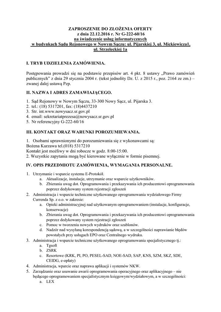 ZAPROSZENIE DO ZŁOŻENIA OFERTY z dnia 22.12.2016 r. Nr G-222-60/16 na świadczenie usług informatycznych w budynkach Sądu Rejonowego w Nowym Sączu: ul. Pijarskiej 3, ul. Mickiewicza1, ul. Strzeleckiej 1a I. TRYB UDZIELENIA ZAMÓWIENIA. Postępowania prowadzi się na podstawie przepisów art. 4 pkt. 8 ustawy „Prawo zamówień publicznych” z dnia 29 stycznia 2004 r. (tekst jednolity Dz. U. z 2015 r., poz. 2164 ze zm.) – zwanej dalej ustawą Pzp. II. NAZWA I ADRES ZAMAWIAJĄCEGO. 1. 2. 3. 4. 5. Sąd Rejonowy w Nowym Sączu, 33-300 Nowy Sącz, ul. Pijarska 3. tel.: (18) 5317201, fax: (18)4437210 Str. int.www.nowysacz.sr.gov.pl email: [email protected] Nr referencyjny G-222-60/16 III. KONTAKT ORAZ WARUNKI POROZUMIEWANIA. 1. Osobami uprawnionymi do porozumiewania się z wykonawcami są: Bożena Kurzawa tel.(018) 5317210 Kontakt jest możliwy w dni robocze w godz. 8:00-15:00. 2. Wszystkie zapytania mogą być kierowane wyłącznie w formie pisemnej. IV. OPIS PRZEDMIOTU ZAMÓWIENIA, WYMAGANIA PERSONALNE. 1. Utrzymanie i wsparcie systemu E-Protokół. 2. 3. 4. 5. a. Aktualizacje, instalacje, utrzymanie oraz wsparcie użytkowników. b. Zbierania uwag dot. Oprogramowania i przekazywania ich producentowi oprogramowania poprzez dedykowany system rejestracji zgłoszeń Administracja i wsparcie techniczne użytkowanego oprogramowania wydziałowego Firmy Currenda Sp. z o.o. w zakresie: a. Opieki administracyjnej nad użytkowanym oprogramowaniem (instalacje, konfiguracje, konserwacje) b. Zbierania uwag dot. Oprogramowania i przekazywania ich producentowi oprogramowania poprzez dedykowany system rejestracji zgłoszeń c. Pomoc w tworzeniu nowych wydruków oraz szablonów. d. Nadzór nad wysyłaną korespondencją sądową, a w szczególności naprawianie błędów powstałych przy usługach EPO oraz Centralnego wydruku. Administracja i wsparcie techniczne użytkowanego oprogramowania specjalistycznego tj.: a. Tgsoft b. ZSRK c. Resortowe (KRK, PI, PO, PESEL-SAD, NOE-SAD, SAP, KNS, SZM, SKZ, SDE, CEIDG, e-opłaty) Administracja, wparcie oraz naprawa aplikacji i systemów NKW. Zarządzanie oraz usuwanie awarii oprogramowania operacyjnego oraz aplikacyjnego – nie będącego oprogramowaniem specjalistycznym księgowym/wydziałowym, a w szczególności: a. LEX b. Legalis c. Centralny program antywirusowy d. Pakiet Office e. Systemy operacyjne rodziny Windows oraz Linux 6. Instalacja oprogramowania z w/w punktów. 7. Usuwanie usterek w w/w systemach informatycznych powstałych podczas użytkowania. 8. Administracja oraz zarządzanie serwerami zainstalowanymi na potrzeby działania jednostki, a w szczególności serwerami: a. Active Directory, b. DNS, c. DHCP, d. bazodanowymi, e. aplikacyjnymi, f. serwerami plików; 9. Wykonywanie kopii zapasowych zgodnie z polityką bezpieczeństwa. 10. Usuwanie awarii sprzętu komputerowego i peryferyjnego. 11. Opieka nad oprogramowanie sieciowym, a w szczególności infrastrukturą CISCO. 12. Pomoc w bieżących problemach dotyczących działania sprzętu. 13. Stały nadzór i konserwacja w/w sprzętu. 14. Prowadzenie dokumentacji m.in. dzienników kopii zapasowych, polityki bezpieczeństwa, aktualizacji, awarii itp. 15. Utrzymanie wszystkich wdrażanych systemów przez zamawiającego oraz systemów niewymienionych powyżej. 16. Nadzór, konserwacja oraz usuwanie awarii telefonii VOIP. 17. Wymogi personalne: a. Wykształcenie wyższe 2-stopnia kierunkowe informatyczne (studia techniczne). b. Doświadczenie w pracy na podobnym stanowisku. c. W razie awarii, usterki systemu dyspozycyjność poza godzinami pracy Sądu. d. Znajomość języka angielskiego pozwalająca czytać dokumentację techniczną. 18. Pozostałe minimalne wymagania: a. Bardzo dobra znajomość systemów Microsoft Windows, Server, Linux. b. Praktyczna znajomość urządzeń sieciowych LAN i WAN, a w szczególności marki CISCO. c. Praktyczna znajomość sieci VLAN oraz technologii PoE. d. Zaawansowana znajomość administracji środowiskami wirtualnymi VMware, HyperV. e. Doświadczenie z systemami VMware Vcenter, Vsphere, Mirage. f. Doświadczenie w pracy z urządzeniami klasy firewall (np. FORTINET). g. Doświadczenie w zarządzaniu systemami bazodanowymi – SQL Server. h. Doświadczenie w zarządzaniu macierzami dyskowymi (HP, EMC). V. TERMIN WYKONANIA ZAMÓWIENIA, CZAS ŚWIADCZENIA USŁUG, MIEJSCE WYKONNIA ZAMÓWIENIA. 1. Termin wykonania zamówienia: od 02.01.2017 r. do 29.12.2017 r. 2. Czas świadczenia usług – 7 godzin dziennie w dni robocze. 3. Miejsce wykonania zamówienia: budynki sądowe w Nowym ul. Pijarskiej 3, ul. Mickiewicza 1, ul. Strzeleckiej 1a. Sączu przy VI. KRYTERIA WYBORU OFERTY I ICH ZNACZENIE ORAZ SPOSÓB OCENY. Przy wyborze oferty zamawiający będzie kierował się następującymi kryteriami: 1. kryterium ceny (C) …………………………….. 70% 2. kryterium doświadczenia wykonawcy (D): …………………..…….. 30% Wyznaczenia wartości punktów dokonywane są następująco: dla kryterium ceny (C): C = Cena najniższa / Cena badana * 70 Maksymalna ilość punktów w tym kryterium wynosi 70. dla kryterium doświadczenia (D): Oferta zyska dodatkowe 30 pkt. za umowę (usługę) w zakresie obsługi informatycznej realizowanej na potrzeby jednostek sądownictwa w okresie ostatnich 3 lat o wartości minimum 50 000,00 zł.. Usługa powinna być świadczona w systemie ciągłym przez minimum 12 miesięcy. Maksymalna ilość punktów w tym kryterium wynosi 30. Sposób wyliczenia punktów oferty (P): gdzie: P C D P=C+D - ilość punktów oferty badanej - ilość punktów oferty badanej w kryterium ceny - ilość punktów oferty badanej w kryterium doświadczenia Za ofertę najkorzystniejszą zostanie uznana oferta, która uzyska najwyższą ilość punktów. VII. MIEJSCE ORAZ TERMIN SKŁADANIA OFERT. 1. Miejsce i termin składania ofert: Sąd Rejonowy w Nowym Sączu, ul. Pijarska 3 - I p. pok. 128, do dnia 29.12.2016 r. do godz. 1000 2. Miejsce i termin otwarcia