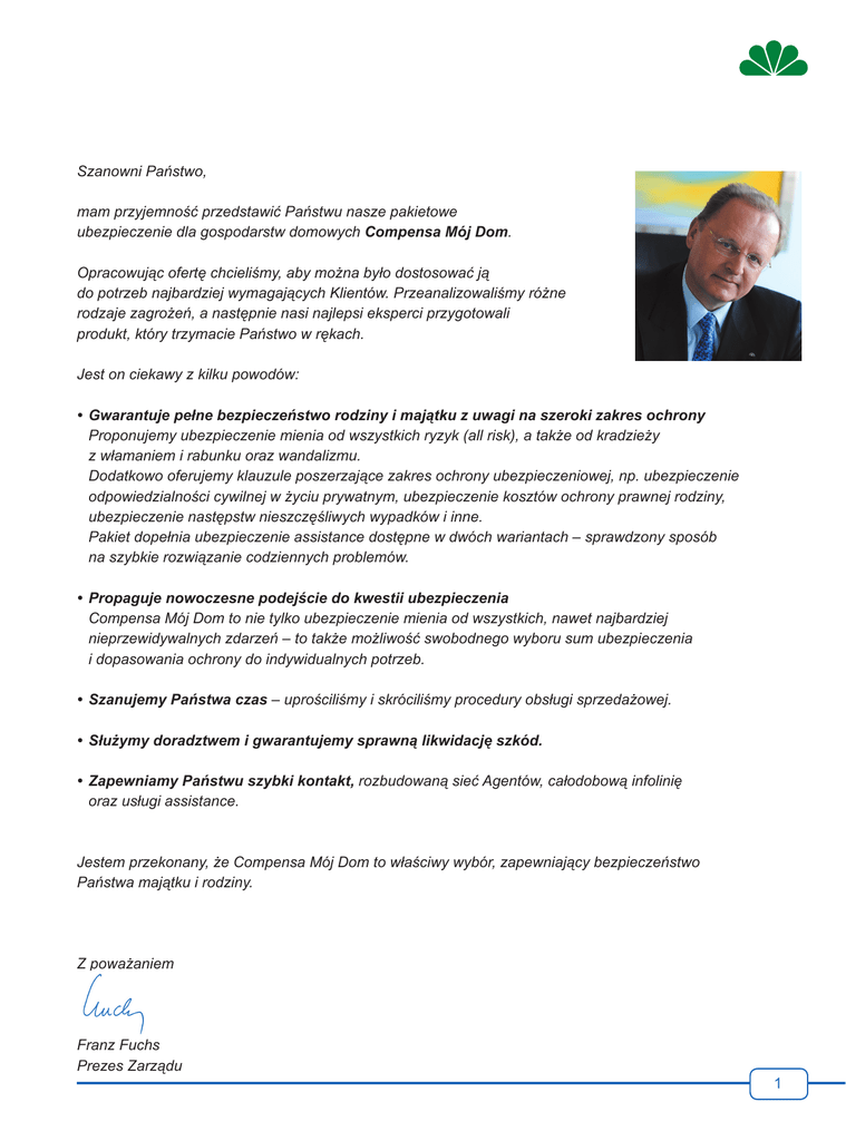 Szanowni Państwo, mam przyjemność przedstawić Państwu nasze pakietowe ubezpieczenie dla gospodarstw domowych Compensa Mój Dom. Opracowując ofertę chcieliśmy, aby można było dostosować ją do potrzeb najbardziej wymagających Klientów. Przeanalizowaliśmy różne rodzaje zagrożeń, a następnie nasi najlepsi eksperci przygotowali produkt, który trzymacie Państwo w rękach. Jest on ciekawy z kilku powodów: • Gwarantuje pełne bezpieczeństwo rodziny i majątku z uwagi na szeroki zakres ochrony Proponujemy ubezpieczenie mienia od wszystkich ryzyk (all risk), a także od kradzieży z włamaniem i rabunku oraz wandalizmu. Dodatkowo oferujemy klauzule poszerzające zakres ochrony ubezpieczeniowej, np. ubezpieczenie odpowiedzialności cywilnej w życiu prywatnym, ubezpieczenie kosztów ochrony prawnej rodziny, ubezpieczenie następstw nieszczęśliwych wypadków i inne. Pakiet dopełnia ubezpieczenie assistance dostępne w dwóch wariantach – sprawdzony sposób na szybkie rozwiązanie codziennych problemów. • Propaguje nowoczesne podejście do kwestii ubezpieczenia Compensa Mój Dom to nie tylko ubezpieczenie mienia od wszystkich, nawet najbardziej nieprzewidywalnych zdarzeń – to także możliwość swobodnego wyboru sum ubezpieczenia i dopasowania ochrony do indywidualnych potrzeb. • Szanujemy Państwa czas – uprościliśmy i skróciliśmy procedury obsługi sprzedażowej. • Służymy doradztwem i gwarantujemy sprawną likwidację szkód. • Zapewniamy Państwu szybki kontakt, rozbudowaną sieć Agentów, całodobową infolinię oraz usługi assistance. Jestem przekonany, że Compensa Mój Dom to właściwy wybór, zapewniający bezpieczeństwo Państwa majątku i rodziny. Z poważaniem Franz Fuchs Prezes Zarządu 1 Grupa VIG Compensa TU S.A. Vienna Insurance Group • działamy na polskim rynku od 1990 roku, • należymy do austriackiej grupy Vienna Insurance Group, wiodącego ubezpieczyciela w Europie Środkowo-Wschodniej, • stosujemy nowoczesne rozwiązania w ubezpieczeniach. Sukcesywnie rośnie • liczba Klientów, którym zapewniamy stale wysoki standard usług, • udział w rynku i wypracowywany zysk, • liczba naszych placówek oraz współpracujących z nami wykwalifikowanych Agentów. Udoskonalamy serwis posprzedażowy • zapewniamy sprawną i szybką likwidację szkód oraz uproszczone procedury, • oferujemy szeroki pakiet assistance. Zapewniamy stały kontakt • Compensa Kontakt: całodobowa infolinia +48 22 212 20 21 informująca o ofercie, przyjmująca zgłoszenie szkody lub wezwanie pomocy assistance, • adres e-mail dla naszych Klientów: [email protected], • strona internetowa www.compensa.pl prezentująca naszą firmę, ofertę i placówki Compensy. 2 Docenia nas rynek Compensa TU S.A. Vienna Insurance Group – Firma Godna Polecenia Wyróżnienie zostało przyznane przez Biuro Promocji Gospodarczej i Certyfikacji w Poznaniu za stworzenie szerokiej, atrakcyjnej i kompleksowej oferty ubezpieczeniowej dla Klientów indywidualnych, małych i średnich przedsiębiorstw, a także dużych Klientów korporacyjnych, jak również za pozycję lidera w branży oraz profesjonalizm w zarządzaniu firmą. Compensa TU S.A. – Pracodawca Godny Zaufania W 2013 roku Compensa TU S.A. otrzymała tytuł Pracodawca Godny Zaufania w kategorii “Ubezpieczenia”. Compensa TU S.A. – Lider Rynku oraz Euro Leader 2012 Compensa TU S.A. Vienna Insurance Group, jako najlepsza w Polsce firma w zakresie ubezpieczeń majątkowych i osobowych, została nagrodzona tytułem Lidera Rynku 2012 oraz Euro Leadera 2012. Przyznając nagrody Kapituła kierowała się produktywnością, kreatywnością, innowacyjnością, jakością produktów, a także konkurencyjnością przy zachowaniu standardów etyki kupieckiej. Drugi tytuł Euro Leadera 2012 przyznała Kapituła Europejskiego Konkursu Promocyjnego. 3 Compensa Mój Dom pakiet ubezpieczeń majątkowych i osobowych dla wymagających Klientów. Najszerszy zakres ubezpieczenia Pakiet Compensa Mój Dom opiera się na modelu ubezpieczenia mienia od ryzyk wszystkich, co oznacza, że Compensa odpowiada za wszystkie zdarzenia, w wyniku których doszło do powstania szkody (zniszczenia, uszkodzenia lub utraty mienia) – z małymi wyjątkami, które szczegółowo opisane są w § 5. ogólnych warunków ubezpieczenia. Jeżeli jakiekolwiek zdarzenie doprowadziło do uszkodzenia lub zniszczenia Twojego mienia, a czytając wyłączenia odpowiedzialności Ubezpieczyciela nie znalazłeś zapisu wyłączającego takie zdarzenie, możesz być pewien, że pakiet Compensa Mój Dom zapewnia ochronę ubezpieczeniową. Co można ubezpieczyć • dom mieszkalny z elementami stałymi, • mieszkanie z elementami stałymi wraz z pomieszczeniami gospodarczymi (piwnice, komórki, schowki itp.) z ich elementami stałymi. ► Ubezpieczając dom mieszkalny lub mieszkanie, uzyskujesz możliwości ubezpieczenia: • budynków gospodarczych, • budowli. Nie zapomnieliśmy o ruchomościach domowych, które mogą znajdować się w domu mieszkalnym lub mieszkaniu, pomieszczeniach i budynkach gospodarczych, budowlach lub na posesjach. Dajemy możliwość ochrony rzeczy, które mamy ze sobą wychodząc z domu do pracy lub wyjeżdżając w podróż. Ważne dla właścicieli domów jednorodzinnych Przewidzieliśmy możliwość ubezpieczenia: • siłowników i automatyki bram od zniszczenia, uszkodzenia lub kradzieży, • ruchomości znajdujących się na posesji – również od kradzieży, • drzew i krzewów – również od kradzieży, • elementów zewnętrznych – również od kradzieży. 4 Elastycznie kreujesz zakres swojego ubezpieczenia Każdy z nas ma inne potrzeby ubezpieczeniowe i dlatego przygotowaliśmy długą listę ryzyk, które rozszerzają zakres odpowiedzialności Compensy w zależności od indywidualnych oczekiwań tj.: • kradzież z włamaniem i rabunek, • kradzież (bez śladów włamania) dla wybranego mienia, • zniszc