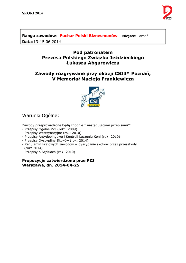 SKOKI 2014 Ranga zawodów: Puchar Polski Biznesmenów Miejsce: Poznań Data:13-15 06 2014 Pod patronatem Prezesa Polskiego Związku Jeździeckiego Łukasza Abgarowicza Zawody rozgrywane przy okazji CSI3* Poznań, V Memoriał Macieja Frankiewicza Warunki Ogólne: Zawody przeprowadzone będą zgodnie z następującymi przepisami*: - Przepisy Ogólne PZJ (rok:: 2009) - Przepisy Weterynaryjne (rok: 2010) - Przepisy Antydopingowe i Kontroli Leczenia Koni (rok: 2010) - Przepisy Dyscypliny Skoków (rok: 2014) - Regulamin krajowych zawodów w dyscyplinie skoków przez przeszkody (rok: 2014) - Przepisy o Sędziach (rok: 2010) Propozycje zatwierdzone prze PZJ Warszawa, dn. 2014-04-25 SKOKI 2014 I. INFORMACJE OGÓLNE 1. Zawody: 1.3 Puchar Polski: T N Halowy T N Kategoria: Młodzi Jeźdźcy Seniorzy Kuce i Małe Konie Kuce Juniorzy Juniorzy Młodsi Data : 13-15 06 2014 Miejsce: Poznań Uczestnicy: 2. Organizator (kompletny adres) Nazwa: Adres: Kod pocztowy: Telefon: Email : Internet: KJ Jumping Events ul. Chotomińska 41A 61-311 Poznan 602345080 Fax : [email protected] www.csi4.pl 3. Komitet Organizacyjny Przewodniczący: Dyrektor Zawodów: Biuro Zawodów: Rzecznik Prasowy: Dyrektor Techniczny: Szef Stajni: Szymon Tarant Tarant Events Marek Lubawiński Robert Sydof 4. Dane kontaktowe na miejscu zawodów: Adres: CWJ Hipodrom Wola, ul. Lutycka 34 Tel.: 602345080 II. OSOBY OFICJALNE (zgodnie z Przepisami o Sędziach wyd. 5, art.14 p.3) 1. Komisja Sędziowska: Przewodniczący: Dariusz Orzoł Sędzia PZJ: Zofia Jurczyńska Kret Sędzia Stylu: Członkowie: Krystyna Kanclerz 2. Delegat Techniczny: Szymon Tarant Asystent Delegata Technicznego 3. Gospodarz Toru: Arkadiusz Wckwert Asystent Gospodarza Toru Wiesław Laskowski SKOKI 2014 4. Komisarze: Witold Bogacz Justyna Olszak 5. Delegat weterynaryjny PZJ: Ryszard Grundwald 6. Lekarz weterynarii zawodów: 7. Komisja Odwoławcza: Grzegorz Jaroszewski III WARUNKI TECHNICZNE Otwarcie stajni data 11 06 14 godzina 12.00 Zebranie techniczne Przegląd Weterynaryjny Plac konkursowy/hala: • podłoże: trawa • wymiary:120 na 60 Rozprężalnia: • podłoże: piasek kwarcowy • wymiary: 60 na 20 IV. WARUNKI UCZESTNICTWA 1.Uczestnictwo Puchar Polski Biznesmenów: Zgodnie z załącznikiem 1 Konkursy dodatkowe: deklarowane amatorstwo, wykluczeni zawodnicy z I licencją PZJ, bez ograniczeń wiekowych Maksymalnie 2 konie na zawodnika na całe zawody, niezależnie od kategorii. 2. Zgłoszenia: Termin zgłoszeń wstępnych:20 maja 2014 Termin zgłoszeń imiennych: 20 maja 2014 Termin zgłoszeń ostatecznych:2 czerwca 2014 Zgłoszenia prosimy wysyłać na adres: Fax : Email: [email protected] 3. Warunki finansowe: Wpisowe z boksem:1000 PLN Każdy zawodnik może wykupić jeden pakiet VIP dla dwóch osób w specjalnej cenie:1000 PLN Netto (loża VIP czynna w sobotę i niedzielę) W sprawie pakietu VIP (Vat 23%) – prosimy o kontakt pod numerem telefonu 602345080 SKOKI 2014 Opłaty wpisowe w całości (1000 PLN od konia) należy wpłacić do 5. 06.2014 na konto: Klub Sportowy Jumping Events ul. Chotominska 41A 61-311 Poznań, Bank: Bank Pocztowy SA Numer: PL 75 1320 1016 3313 5458 2000 0001 Z dopiskiem „opłata PPB” Opłata za program badań antydopingowych 15 zł od konia (konie startujące w PPB). Pasza i siano własne: T N / na koszt KO: T N Podłączenie samochodu do prądu:200 PLN 5. Zakwaterowanie i wyżywienie: na koszt własny: T N na koszt KO: T N Hotel Ramka, ul. Wejherowska 10, Poznan (2 km od Hipodromu Wola) +48 61 8 499 499, +48 731 757 666 [email protected] hasło: CSI cena 159 zł za dobą pokój (jedna lub dwie osoby), śniadanie 25/osoby 5. Kary za brak dokumentów – według stawek PZJ. 6. Za reklamacje i odwołania obowiązuje kaucja w wys.:200 PLN 7. Dokonanie zmiany w zapisach do konkursu (po wywieszeniu list startowych) za zgodą sędziego głównego: PLN 8. Wymagana dokumentacja dla koni aktualne badania i szczepienia ochronne 9. Organizator nie ponosi odpowiedzialności za kradzieże, wypadki oraz inne szkody mogące mieć miejsce podczas zawodów i transportu V. ZAGADNIENIA WETERYNARYJNE Lp. Funkcja Imię i nazwisko 1. Powiatowy lekarz wet. 2. Delegat wet. PZJ Ryszard Grundwald 3. Lekarz wet. zawodów Michał Stanisławiak Ireneusz Sobiak telefon 61 8690347 602 731 064 Szczepienia ochronne przeciwko grypie koni. Obowiązuje następujący schemat szczepień: a. szczepienie podstawowe: • pierwsze szczepienie – w dniu rozpoczęcia szczepień SKOKI 2014 • drugie szczepienie – nie wcześniej niż 21-go dnia i nie później niż 92 dnia od pierwszego szczepienia. b. szczepienie przypominające: • co 6 miesięcy od ostatniego szczepienia (jest dopuszczalny 21 dniowy okres karencji); • żadne szczepienie przypominające nie może się odbyć później niż na 7 dni przed przybyciem na zawody. VI. NAGRODY (zgodnie z Przepisami Ogólnymi art. 35 p.1-10, art. 37 p.1-5) PULA NAGRÓD Nagrody honorowe i nagrody rzeczowe VII. PROGRAM ZAWODÓW Dzień I Dzień: piątek Data: 13 06 2014 KONKURS Nr. 1, (przewidywana godz. rozpoczęcia: 15) Runda: dodatkowa Konkurs (rodzaj):zwykły Klasa konkursu: L Nagrody rzeczowe: tak KONKURS Nr. Art.:238.2.1 2, (przewidywana godz. rozpoczęcia:15.45) Runda: Puchar Polski Biznesmenów – I półfinał Konkurs (rodzaj): Szybkości Art.:263, tabela C Klasa konkursu: P Dzień II Dzień: sobota Data:14 06 2014 KONKURS Nr. 3, (przewidywana godz. rozpoczęcia: 13.00) Runda: dodatkowa Konkurs (rodzaj): zwykły Klasa konkursu: L Nagrody rzeczowe: tak Art.: 238.2.1 KONKURS Nr. 4, (przewidywana godz. rozpoczęcia: 13.45) Runda: Puchar Polski Biznesmenów – II półfinał Konkurs (rodzaj): zwykły Art.: 238.2.1 Klasa konkursu: P1 Dzień III Dzień: niedziela Data:15 06 2014 KONKURS Nr.5, (przewidywana godz. rozpoczęcia:11.00) SKOKI 2014 Runda: dodatkowa Konkurs (rodzaj): dwufazowy Klasa konkursu: L1 Nagrody rzeczowe: tak KONKURS Nr. Art.:274.5.3 6 , (przewidywana godz. rozpoczęcia: 11.45) Runda: Puchar Polski Biznesmenów 