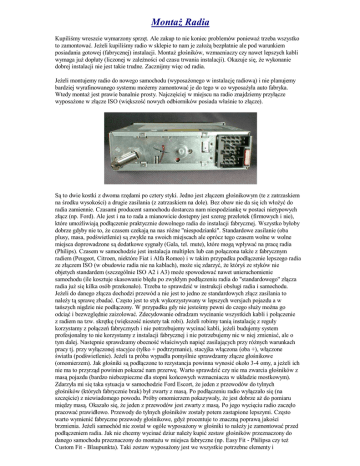 Montaż Radia Kupiliśmy wreszcie wymarzony sprzęt. Ale zakup to nie koniec problemów ponieważ trzeba wszystko to zamontować. Jeżeli kupiliśmy radio w sklepie to nam je założą bezpłatnie ale pod warunkiem posiadania gotowej (fabrycznej) instalacji. Montaż głośników, wzmacniaczy czy nawet lepszych kabli wymaga już dopłaty (liczonej w zależności od czasu trwania instalacji). Okazuje się, że wykonanie dobrej instalacji nie jest takie trudne. Zacznijmy więc od radia. Jeżeli montujemy radio do nowego samochodu (wyposażonego w instalację radiową) i nie planujemy bardziej wyrafinowanego systemu możemy zamontować je do tego w co wyposażyła auto fabryka. Wtedy montaż jest prawie banalnie prosty. Najczęściej w miejscu na radio znajdziemy przyłącze wyposażone w złącze ISO (większość nowych odbiorników posiada właśnie to złącze). Są to dwie kostki z dwoma rzędami po cztery styki. Jedno jest złączem głośnikowym (te z zatrzaskiem na środku wysokości) a drugie zasilania (z zatrzaskiem na dole). Bez obaw nie da się ich włożyć do radia zamiennie. Czasami producent samochodu dostarcza nam niespodziankę w postaci nietypowych złącz (np. Ford). Ale jest i na to rada a mianowicie dostępny jest szereg przelotek (firmowych i nie), które umożliwiają podłączenie praktycznie dowolnego radia do instalacji fabrycznej. Wszystko byłoby dobrze gdyby nie to, że czasem czekają na nas różne "niespodzianki". Standardowe zasilanie (oba plusy, masa, podświetlenie) są zwykle na swoich miejscach ale oprócz tego czasem wolne w wolne miejsca doprowadzone są dodatkowe sygnały (Gala, tel. mute), które mogą wpływać na pracę radia (Philips). Czasem w samochodzie jest instalacja multiplex lub can połączona także z fabrycznym radiem (Peugeot, Citroen, niektóre Fiat i Alfa Romeo) i w takim przypadku podłączenie lepszego radia ze złączem ISO (w obudowie radia nie na kablach), może się zdarzyć, że któryś ze styków nie objetych standardem (szczególnie ISO A2 i A3) może spowodować nawet unieruchomienie samochodu (ile kosztuje skasowanie błędu po zwykłym podłączeniu radia do "standardowego" złącza radia już się kilka osób przekonało). Trzeba to sprawdzić w instrukcji obsługi radia i samochodu. Jeżeli do danego złącza dochodzi przewód a nie jest to jedno ze standardowych złącz zasilania to należy tą sprawę zbadać. Często jest to styk wykorzystywany w lepszych wersjach pojazdu a w tańszych nigdzie nie podłączony. W przypadku gdy nie jesteśmy pewni do czego służy można go odciąć i bezwzględnie zaizolować. Zdecydowanie odradzam wycinanie wszystkich kabli i połączenie z radiem na tzw. skrętkę (większość niestety tak robi). Jeżeli robimy tanią instalację z reguły korzystamy z połączeń fabrycznych i nie potrzebujemy wycinać kabli, jeżeli budujemy system profesjonalny to nie korzystamy z instalacji fabrycznej i nie potrzebujemy nic w niej zmieniać, ale o tym dalej. Następnie sprawdzamy obecność właściwych napięć zasilających przy różnych warunkach pracy tj. przy wyłączonej stacyjce (tylko + podtrzymanie), stacyjka włączona (oba +), włączone światła (podświetlenie). Jeżeli ta próba wypadła pomyślnie sprawdzamy złącze głośnikowe (omomierzem). Jak głośniki są podłączone to rezystancja powinna wynosić około 3-4 omy, a jeżeli ich nie ma to przyrząd powinien pokazać nam przerwę. Warto sprawdzić czy nie ma zwarcia głośników z masą pojazdu (bardzo niebezpieczne dla stopni końcowych wzmacniacza w układzie mostkowym). Zdarzyła mi się taka sytuacja w samochodzie Ford Escort, że jeden z przewodów do tylnych głośników (których fabrycznie brak) był zwarty z masą. Po podłączeniu radio wyłączało się (na szczęście) z niewiadomego powodu. Próby omomierzem pokazywały, że jest dobrze aż do pomiaru między masą. Okazało się, że jeden z przewodów jest zwarty z masą. Po jego wycięciu radio zaczęło pracować prawidłowo. Przewody do tylnych głośników zostały potem zastąpione lepszymi. Często warto wymienić fabryczne przewody głośnikowe, gdyż procentuje to znaczną poprawą jakości brzmienia. Jeżeli samochód nie został w ogóle wyposażony w głośniki to należy je zamontować przed podłączeniem radia. Jak nie chcemy wycinać dziur należy kupić zestaw głośników przeznaczony do danego samochodu przeznaczony do montażu w miejsca fabryczne (np. Easy Fit - Philipsa czy też Custom Fit - Blaupunkta). Taki zestaw wyposażony jest we wszystkie potrzebne elementy i wyczerpującą instrukcję (rysunki). Pozostaje nam jeszcze kwestia anteny. Montujemy ją zgodnie z zaleceniami producenta (wpłynie to korzystnie na odbiór) zarówno dotyczącymi sposobu i miejsca montażu jak i stosowania ewentualnych wzmacniaczy. Nie należy ciąć, przedłużać i skracać przewodu antenowego. Jeżeli antena posiada wzmacniacz jego zasilanie podłączamy do wyjścia radia sterującego anteną automatyczną. Jeżeli posiadamy antenę automatyczną to sterowanie jej (nie zasilanie) podłączamy do tego wyjścia. Bardzo ważne dla posiadaczy Audi/VW/Skoda. W wielu pojazdach montowana jest antena dachowa ze wzmacniaczem (taki "ogon jamnika"). Do radia natomiast doprowadzony jest tylko przewód antenowy. Jak więc zasilany jest wzmacniacz? Sygnał zasilający jest doprowadzany razem z sygnałem antenowym jednym kablem podobnie jak to jest w przypadku domowych anten siatkowych. Jak mamy fabryczne radio to problem zasilania odpada, bo w sygnał antenowy jest wprowadzone zasilanie. Jak stosujemy inne radio nie ma już takiej sytuacji. Co zatem zrobić? Trzeba zastosować taki element co wprowadzi nam to zasilanie. Jest to taki cylindryczny metalowy element, z jednej strony ma gniazdo antenowe w standardzie ISO, z drugiej natomiast zakończone jest wtykiem antenowym DIN i ma wyprowadzony przewód do podłączenia w złączu ISO do styku A5. A co jest w tym metal