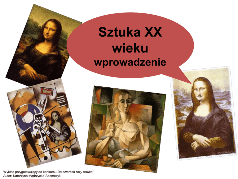 Sztuka XX wieku wprowadzenie Wykład przygotowujący do konkursu Do czterech razy sztuka! Autor: Katarzyna Mądrzycka-Adamczyk P IE R W S Z A P O Ł O W A X X W IE K U DEKADA WYDARZENIE Przed 1900 1839 pierwsze zdjęcie wykonane na płytce miedzianej przez Daguerre’a 1895 pierwszy film pokazany publicznie nakręcony przez braci Lumiére 1900-1909 1903-1905 wojna rosyjsko-japońska 1903 pierwszy lot samolotem z silnikiem spalinowym skonstruowany przez braci Wright 1903 Nagroda Nobla dla Marii SkłodowskiejCurie w dziedzinie fizyki 1905 rewolucja rosyjska 1905 Literacka Nagroda Nobla dla Henryka Sienkiewicza 1908 rusza produkcja seryjna samochodów Ford 1910-1919 1911 Nagroda Nobla dla Marii SkłodowskiejCurie w dziedzinie chemii 1914 –1918 I Wojna Światowa 1917 rewolucja w Rosji 1918 odzyskanie niepodległości przez Polskę 1920-1929 1924 Literacka Nagroda Nobla dla Władysława Reymonta 1929 kryzys w USA 1930-1939 Adolfa Hitlera w Niemczech; Józef Stalin w ZSRR; Benito Mussolini we Włoszech 1939 wybuch II Wojny Światowej 1940-1949 1944 – wybuch Powstania Warszawskiego 1945 – zakończenie II Wojny Światowej Kierunki w sztuce I połowy XX wieku Fowizm Ekspresjonizm Kubizm Futuryzm Dadaizm Surrealizm Neoplastycyzm Konstruktywizm Kierunki w sztuce I połowy XX wieku Fowizm Ekspresjonizm Kubizm Futuryzm Dadaizm Surrealizm Neoplastycyzm Konstruktywizm 1905 Barbarzyńskie i pełne 18 naiwności października - 25 listopada zabawy dziecka, któremu w prezencie gwazdkowym III Salon Jesienny podarowano pudełko farbek. (Marcel Nicolle Le Journal de Rouen) Prostota tych popiersi zaskakuje wśród tej orgii czystych tonów. Rzec by można – Donatello wśród dzikich bestii! (Louis Vauxcelles Gil Blas) Puszka żółtej farby została wylana na głowy publiczności! (Camille Mauclair Le Figaro) Rzeźba autorstwa Alberta Marqueta Grupa fowistów w słynnej sali "dzikich bestii” Fowizm Caspar David Friedrich, Kobieta przy oknie, 1822 Henri Matisse, Otwarte okno, 1905 Fowizm Chardin, Martwa natura z granatami i winogronami, 1763 Paul Cezanne, Stół, serweta i obrus, 1895-1900 Henri Matisse, Martwa natura, 1905 Fowizm H. Matisse, Deser, 1897 H. Matisse, Czerwony Pokój (Harmonia Czerwieni), 1908 Fowizm C. Monet, Kobieta w zielonej sukni, 1866 H. Matisse, Portret kobiety w kapeluszu, 1905 Fowizm • barwy czyste • silne kontrasty barwne / temperaturowe / dopełnieniowe / symultaniczne (równoczesne) • repetycja barwna / powtarzanie tych samych tonów barwnych • barwy sugestywne, niezależne od rzeczywistych / abstrakcyjne • synteza światła i barwy / jasność (światło) uzyskane dzięki barwie • światło rozproszone • źródło światła trudne do zidentyfikowania • brak tradycyjnego modelunku / światłocień umowny • światło i cień odzwierciedlane różnicami barw (ciepłe-zimne), a nie walorem H. Matisse, Portret kobiety w kapeluszu, 1905 Fowizm „Moim zdaniem, ekspresja nie znajduje wyrazu w uczuciu, które płonie w twarzy lub jest ewidentne dzięki gwałtownym gestom. Jest ona w całej dyspozycji obrazu”. (Henri Matisse) Fowizm Henri Matisse, Taniec,1910 Fowizm Najważniejsze • • • • • 1905 początek – pierwsza wystawa fr. le fauve oznaczaja dziką bestię kolor/płaszczyzna barwna – najważniejszy środek wyrazu Ekspresja barwna – krzyczy kolor! Nie namalowana postać Synteza/uproszczenie kształtów • Przedstawiciele: – Henri Matisse wym. [onri matis] – Andre Derain wym. [onre dirę] – Maurice Vlaminck wym. [moris flamik] – Raoul Dufy wym. [raul daf]] Kierunki w sztuce I połowy XX wieku Fowizm Ekspresjonizm Kubizm Futuryzm Dadaizm Surrealizm Neoplastycyzm Konstruktywizm Ekspresjonizm „ … to połączenie czerwonego ugru, smutnej przytłumionej zieleni i czarnych kresek otaczających konturem sprawia wrażenie udręki, która ogarnia czasem moich współtowarzyszy niedoli – wrażenie zwane »czarno-czerwonym«…” Vincent Van Gogh Autoportret z obciętym uchem i fajką, 1889 Vincent Van Gogh Nocna kawiarnia, 1888 Vincent van Gogh jest przedstawicielem postimpresjonizmu, ale jego twórczość zapoczątkowała ekspresjonizm Ekspresjonizm „Nowa niemiecka sztuka • odrealniony kolor chciała krzyczeć tak • świadoma deformacja postaci donośnie, jak przerażona mająca na postać celu przekazanie światem ze słynnego emocji obrazu twórcyMuncha.” (Waldemar Baraniewski) James Sidney Ensor, Intryga, 1890 Protoeksprsjonizm Edward Munch, Krzyk, 1895 Ekspresjonizm Grupa Die Brücke Grupa Der Blaue Reiter Ekspresjonizm Grupa Die Brücke • Die Brücke (most) • łączy to, co zewnętrzne i wewnętrzne, • most między przeszłością i przyszłością • powstała w 1905 roku w Dreźnie • członków nie wiązały ścisłe założenia programowe • wspólne hasła rewolucyjności i buntu, młodzieńczej niezgody na rzeczywistość • członkowie: • Karl Schmidt-Rottluff • Erich Heckel • Ernst Ludwig Kirchner • Max Pechstein • Emil Nolde • Otto Mueller (Műller) Ernst Ludwig Kirchner: Grupowy portret,1926 Ekspresjonizm • krytyczny stosunek do otaczającej rzeczywistości (mieszczaństwo) • postać ludzka pozbawiona cech indywidualnych • reprezentant grupy społecznej / pewnego typu moralności • próba wyzwolenia się poprzez sztukę z tego co zewnętrzne • odrzucano piękno jako cel (narzucone fałszuje prawdziwą sztukę) • uprawiali malarstwo, grafikę, rzeźbę • 1913 roku stowarzyszenie zostaje rozwiązane Grupa Die Brücke Ernst Ludwig Kirchner, Fragment programu „die Brücke”, 1906 Ekspresjonizm Grupa Die Brücke Ernst Ludwig Kirchner Malarz i modelka, 1906 Erich Heckel Śpiący Pachstein, 1910 Ekspresjonizm Grupa Die Brücke Vincent van Gogh Autoportret z zabandażowanym uchem, 1889, Protoeksprsjonizm Ernst Ludwig Kirchner Autoportret jako żołnierz, 1914 Vincent van Gogh Autoportret z obciętym uchem i fajką, 1889, Ekspresjonizm Grupa Die Brücke Ernst Ludwig Kirchner Nollendo