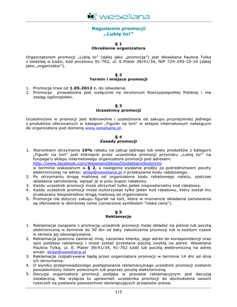 Regulamin promocji „Lubię to!” §1 Określenie organizatora Organizatorem promocji „Lubię to” (dalej jako „promocja”) jest Weseliana Paulina Tylka z siedzibą w Łodzi, kod pocztowy 91-762, ul. E.Plater 39/41/34, NIP 724-240-10-10 (dalej jako „organizator”). §2 Termin i miejsce promocji 1. Promocja trwa od 1.05.2012 r. do odwołania. 2. Promocja prowadzona jest wyłącznie na terytorium Rzeczypospolitej Polskiej i ma zasięg ogólnopolski. §3 Uczestnicy promocji Uczestnictwo w promocji jest dobrowolne i uzależnione od zakupu przynajmniej jednego z produktów oferowanych w kategorii „Figurki na tort” w sklepie internetowym należącym do organizatora pod domeną www.weseliana.pl. §4 Zasady promocji 1. Warunkiem otrzymania 10% rabatu na zakup jednego lub wielu produktów z kategorii „Figurki na tort” jest kliknięcie przez uczestnika promocji przycisku „Lubię to!” na funpage’u sklepu internetowego organizatora promocji pod adresem: http://www.facebook.com/WeselianaSklepZDodatkamiSlubnymi w terminie wskazanym w § 2, a następnie wysłanie prośby za pośrednictwem poczty elektronicznej na adres: [email protected] o przekazanie kodu rabatowego. 2. Po otrzymaniu drogą mailową od organizatora kodu rabatowego należy, podczas składania zamówienia, wpisać je w polu kupon rabatowy. 3. Każdy uczestnik promocji może otrzymać tylko jeden niepowtarzalny kod rabatowy. 4. Każdy uczestnik promocji może wykorzystać tylko jeden kod rabatowy, który został mu przekazany bezpośrednio drogą mailową od organizatora. 5. Promocja nie dotyczy zakupu figurek na tort, które w momencie składania zamówienia są oferowane w obniżonej cenie (oznaczone symbolem "niska cena"). §5 Reklamacje 1. Reklamacje związane z promocją uczestnik promocji może składać na piśmie lub pocztą elektroniczną w terminie do 30 dni od daty zakończenia promocji lub w każdym czasie w okresie jej obowiązywania. 2. Reklamacja powinna zawierać imię, nazwisko klienta, jego adres do korespondencji oraz opis podstaw reklamacji i może zostać przesłana pocztą zwykłą na adres: Weseliana Paulina Tylka, ul. E. Plater 39/41/34, 91-762 Łódź lub pocztą elektroniczną na adres email: [email protected] 3. Reklamacje rozpatrywane będą przez organizatora promocji w terminie 14 dni od dnia ich otrzymania. 4. O wyniku przeprowadzonego postępowania reklamacyjnego uczestnik promocji zostanie powiadomiony listem poleconym lub poprzez pocztę elektroniczną. 5. Decyzja organizatora promocji podjęta w procesie reklamacyjnym jest decyzją ostateczną. Nie wyłącza to uprawnień uczestnika promocji do dochodzenia swoich roszczeń na postawie powszechnie obowiązujących przepisów prawa. 1/2 §6 Postanowienia końcowe 1. Organizator zapewnia ochronę danych osobowych uczestników promocji i oświadcza, że wykorzystanie danych osobowych będzie zgodne z ustawą z dnia 29 października 1997 r. o ochronie danych osobowych (Dz.U. nr 133, poz. 883). Administratorem danych osobowych udostępnianych przez uczestników promocji jest organizator. 2. Udział uczestnika w promocji oznacza jego akceptację zasad promocji zawartych w niniejszym regulaminie, w tym wyrażenie zgody na przetwarzanie jego danych osobowych przez organizatora na potrzeby promocji. 2/2