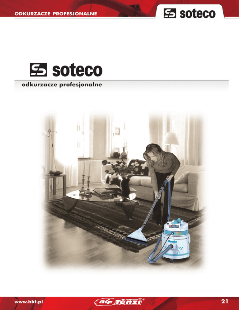 ODKURZACZE PROFESJONALNE odkurzacze profesjonalne www.bkf.pl ® 21 ODKURZACZE PROFESJONALNE odkurzacze do zanieczyszczeń suchych 7 5 Leo 4 3 6 1 2 9 8 dane techniczne Leo 230-240 V, 50 Hz napięcie zasilania 1300 W maksymalna moc silnika 2600 mm H2O podciśnienie 3 przepływ powietrza 200 m /h pojemność zbiornika 10 l PPL materiał zbiornika 8m długość przewodu zasilającego 8,5 kg waga SO LEO kod zamówienia Play YES 1. wąż ssący szary 2. ssawa dwufunkcyjna 3. rura zgięta (rękojeść) 4. rura prosta (2 szt.) 5. ssawka do tapicerki 6. ssawka szczelinowa 7. ssawka okrągła z włosiem 8. filtr cartridge AKCESORIA OPCJONALNE 9. worek papierowy SO 07993 G-G52 SO 0632T G52 SO 06158 G52 SO 06240 G52 SO 00616 G52 SO 00617 G17 SO 00004 G52 SO 07847 SO 07882 5 1 6 3 7 10 4 2 8 dane techniczne 1. wąż ssący czarny szary 2. ssawa dwufunkcyjna 3. rura zgięta (rękojeść) 4. rura prosta 5. ssawka do tapicerki 6. ssawka szczelinowa 7. ssawka okrągła z włosiem 8. filtr poliestrowo-bawełniany AKCESORIA OPCJONALNE 9. filtr nylonowy 10. worek papierowy Play YES 202 230-240 V, 50 Hz napięcie zasilania 1300 W maksymalna moc silnika 2370 mm H2O podciśnienie 3 przepływ powietrza 202 m /h pojemność zbiornika 16 l PPL materiał zbiornika 8,5 m długość przewodu zasilającego 8 kg waga SO YES202MI kod zamówienia SO 01685 SO 01685G SO 00632 SO 06158 SO 06240 SO 00616 SO 00617 SO 00004 SO 03293 SO 00155 SO 00147 5 UFO dry 1 6 3 7 10 4 8 dane techniczne UFO dry 230-240 V, 50 Hz napięcie zasilania 1200 W maksymalna moc silnika 2200 mm H2O podciśnienie 3 przepływ powietrza 180 m /h pojemność zbiornika 17 l PPL materiał zbiornika 8,5 m długość przewodu zasilającego 7 kg waga SO UFO100 kod zamówienia 22 9 ® 9 2 1. wąż ssący czarny szary 2. ssawa dwufunkcyjna 3. rura zgięta (rękojeść) 4. rura prosta 5. ssawka do tapicerki 6. ssawka szczelinowa 7. ssawka okrągła z włosiem 8. filtr poliestrowo-bawełniany AKCESORIA OPCJONALNE 9. filtr nylonowy 10. worek papierowy SO 01685 SO 01685G SO 00632 SO 06158 SO 06240 SO 00616 SO 00617 SO 00004 SO 03229 SO 00155 SO 00147 www.bkf.pl ODKURZACZE PROFESJONALNE odkurzacze do zanieczyszczeń suchych i mokrych FILTRY (DO PRACY NA SUCHO) 1 9 7 6 UFO wet 11 10 3 8 5 2 12 4 1 6 AKCESORIA STANDARDOWE FILTRY OPCJONALNE 4 14 3 10 5 8 9 1. wąż ssący 2. rura zgięta (rękojeść) 3. rura prosta 4. ssawa szczelinowa 5. reduktor 6. ssawa okrągła z włosiem 7. ssawa na sucho 8. ssawa na mokro 9. filtr poliestrowo-bawełniany AKCESORIA OPCJONALNE 10. ssawa do dywanów 11. filtr bawełniany 12. filtr nylonowy 13. filtr cartridge 14. tarcza filtra 15. worek papierowy Dakota 303 E 11 2 opcja 12 13 15 SO 00008 SO 06389 SO 06387 SO 00003 SO 06388 SO 06295 SO 06384 SO 06385 SO 03239 SO 06386 SO 00556 SO 00312 AA 2852 SO 02855 SO 02741 dane techniczne Dakota 303 E napięcie zasilania 230-240 V, 50 Hz maksymalna moc silnika 1400 W podciśnienie 2400 mm H2O przepływ powietrza 215 m3/h pojemność zbiornika 35 l materiał zbiornika PPL waga 8,7 kg stopień ochrony IP x4 długość przewodu zasilającego 8,5 m kod zamówienia SO DAK303E 6 AKCESORIA STANDARDOWE FILTRY OPCJONALNE 4 14 3 opcja 8 9 1. wąż ssący 2. rura zgięta (rękojeść) 3. rura prosta 4. ssawa szczelinowa 5. reduktor 6. ssawa okrągła z włosiem 7. ssawa na sucho 8. ssawa na mokro 9. filtr poliestrowo-bawełniany AKCESORIA OPCJONALNE 10. ssawa do dywanów 11. filtr bawełniany 12. filtr nylonowy 13. filtr cartridge 14. tarcza filtra 15. worek papierowy www.bkf.pl Nevada 503 11 2 7 10 5 UFO wet 230-240 V, 50 Hz napięcie zasilania 1200 W maksymalna moc silnika 2200 mm H2O podciśnienie 3 przepływ powietrza 170 m /h pojemność zbiornika 17 l PPL materiał zbiornika 7 kg waga IP x4 stopień ochrony 8,5 m długość przewodu zasilającego SO UFO200 kod zamówienia SO 00556 SO 00312 SO 02871 SO 02855 SO 00147 7 1 dane techniczne SO 01685 SO 01685G SO 00632 SO 06158 SO 06240 SO 00616 SO 00617 SO 02720 SO 03291 1. wąż ssący czarny szary 2. ssawa dwufunkcyjna 3. rura zgięta (rękojeść) 4. rura prosta 5. ssawka do tapicerki 6. ssawka szczelinowa 7. ssawa na mokro 8. filtr poliestrowo-bawełniany FILTRY OPCJONALNE 9. filtr bawełniany 10. filtr nylonowy 11. filtr cartridge 12. tarcza filtra 13. worek papierowy 13 12 13 15 SO 00008 SO 06389 SO 06387 SO 00003 SO 06388 SO 06295 SO 06384 SO 06385 SO 03241 SO 06386 SO 00556 SO 00312 AA 2852 SO 02855 SO 02741 dane techniczne Nevada 503 napięcie zasilania 230-240 V, 50 Hz maksymalna moc silnika 1200 W podciśnienie 2400 mm H2O przepływ powietrza 215 m3/h pojemność zbiornika 32 l materiał zbiornika INOX waga 10 kg stopień ochrony IP x4 długość przewodu zasilającego 8,5 m kod zamówienia SO NEV503 ® 23 ODKURZACZE PROFESJONALNE Power+ BKF Power+ to unikalny odkurzacz do zanieczyszczeń suchych i mokrych, wyposażony w opatentowany system, zwiększający podciśnienie o 60% bez dodatkowych silników i zużycia energii. Operator przesuwając dźwignię zwiększa płynnie siłę ssania z 2380 mmH2O do 3800 mmH2O. dane techniczne napięcie zasilania moc silników typ chłodzenia podciśnienie ssania: - POWER+ wył. - POWER+ max przepływ powietrza: - POWER+ wył. - POWER+ max pojemność zbiornika kod zamówienia BKF Power+ 230-240 V, 50 Hz 2x1300 W by-pass 2380 mm H2O 3800 mm H2O 6384 6386 (opcja) 6385 6389 6295 6387 3 6387 400 m3/h 220 m3/h 62 l SO PWR-PL 8 2855 6388 24 2852 ® www.bkf.pl ODKURZACZE PROFESJONALNE 6 7 9 3 1 4 10. 11. 12. 13. 14. 15. 16. wąż ssący rura zgięta (rękojeść) rura prosta ssawa szczelinowa reduktor ssawa okrągła z włosiem ssawa na sucho ssawa na mokro filtr poliestrowo-bawełniany AKCESORIA OPCJONALNE ssawa do dywanów ssawa na sucho do wózków ssawa na mokro do wózków filtr nylonowy filtr cartridge tarcza filtra worek papierowy 6 14 Dakota 423 W napięcie zasilania 230-240 V, 50 Hz maksymalna moc silnika 2600 W liczba silników 2 podciśnienie 2400 mm H2O przepływ powietrza 430 m3/h pojemność zbio