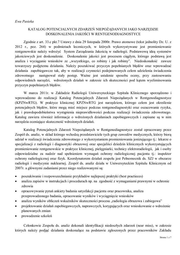 Ewa Pasieka KATALOG POTENCJALNYCH ZDARZEŃ NIEPOŻĄDANYCH JAKO NARZĘDZIE DOSKONALENIA JAKOŚCI W RENTGENODIAGNOSTYCE Zgodnie z art. 33.c pkt.7 Ustawy z dnia 29 listopada 2000r. Prawo atomowe (tekst jednolity Dz. U. z 2012 r., poz. 264) w podmiotach leczniczych, w których wykorzystywane jest promieniowanie rentgenowskie należy wdrożyć System Zarządzania Jakością w radiologii. Podstawową ideą systemów jakościowych jest doskonalenie. Doskonalenie jakości jest procesem ciągłym, którego podstawą jest analiza i wyciąganie wniosków ze „wszystkiego, co robimy i jak robimy”. Niedoskonałość zawsze towarzyszy podjętemu działaniu. Należy poszukiwać przyczyn popełnianych błędów oraz wprowadzać działania zapobiegawcze tak, aby w realizacji czynności podejmowanych celem udzielenia świadczenia zdrowotnego następował stały postęp. Ważne jest ustalenie sposobu oceny, przy zastosowaniu odpowiednich narzędzi, wdrożonych działań w zakresie ich skuteczności pod kątem wyeliminowania przyczyn popełnianych błędów. W marcu 2011r. w Zakładzie Radiologii Uniwersyteckiego Szpitala Klinicznego sporządzono i wprowadzono do realizacji Katalog Potencjalnych Zdarzeń Niepożądanych w Rentgenodiagnostyce (KPZNwRTG). W praktyce klinicznej KPZNwRTG jest narzędziem, którego celem jest określenie potencjalnych błędów, które mogą mieć miejsce podczas rentgenodiagnostyki oraz oszacowanie ryzyka, jak i prawdopodobieństwa wystąpienia nieprawidłowości podczas realizacji świadczenia zdrowotnego. Katalog zawiera również informacje o wdrożonych działaniach zapobiegawczych i zapisane są w nim narzędzia oceniające skuteczność wdrożonych działań. Katalog Potencjalnych Zdarzeń Niepożądanych w Rentgenodiagnostyce został opracowany przez Zespół ds. analiz, w skład którego wchodzą przedstawiciele tych grup zawodów medycznych, którzy biorą udział w realizacji świadczenia zdrowotnego z wykorzystaniem promieniowania jonizującego tj.: lekarze o specjalizacji z radiologii i diagnostyki obrazowej oraz specjaliści dziedzin klinicznych wykorzystujących promieniowanie rentgenowskie w praktyce klinicznej, pielęgniarki, technicy elektroradiologii, jak i osoby odpowiedzialne za nadzór nad spełnieniem wymagań ochrony radiologicznej pacjenta tj.: inspektor ochrony radiologicznej oraz fizyk. Koordynatorem działań zespołu jest Pełnomocnik ds. SZJ w obszarze radiologii i medycynie nuklearnej. Zespół ds. analiz działa w Uniwersyteckim Szpitalu Klinicznym od 2007r. a głównymi zadaniami przez niego realizowanymi są: poszukiwanie i rozpowszechnianie przykładów najlepszej praktyki (best practieces) analiza zapisów w instrukcjach i procedurach np. na zgodność z wymaganiami prawnymi w ochronie zdrowia opracowywanie pytań ankiety badania satysfakcji pacjenta oraz pracownika, analiza przeprowadzonego badania, opracowanie wyników i wyciągnięcie wniosków analiza wyników obliczeń wskaźników skuteczności procesu „radiologia obrazowa i zabiegowa” projektowanie działań zapobiegawczych, naprawczych, korygujących oraz wnioskowanie o wdrożenie planowanych zmian prowadzenie szkoleń Członkowie Zespołu ds. analiz dokonali identyfikacji niedoszłych zdarzeń (near miss), w zakresie których należy podjąć działania doskonalące na podstawie zgłoszonych przez pracowników Zakładu Strona 1 z 7 Radiologii Uniwersyteckiego Szpitala Klinicznego w Białymstoku sugestii, zebranych podczas comiesięcznych spotkań dotyczących analizy funkcjonowaniu SZJ w radiologii. W tworzeniu Katalogu uwzględniono również informacje z przeglądu piśmiennictwa (przegląd bazy Medline) oraz orzecznictwa krajowego w zakresie zdarzeń niepożądanych w rentgenodiagnostyce. Na tej podstawie zidentyfikowano potencjalne zdarzenia niepożądane, które mogą mieć miejsce w rentgenodiagnostyce: Błędna identyfikacja danych osobowych pacjenta Błędna identyfikacja strony badanej, zakresu badania Wykonanie innego zdjęcia rtg niż zlecone w skierowaniu Wykonanie zdjęcia rtg lub zabiegu radiologicznego kobiecie w ciąży (poza uzasadnieniem, jakim jest sytuacją zagrożenia życia i zdrowia matki) Brak wywiadu w kierunku uczulenia na środek kontrastowy celem wykluczenia potencjalnej reakcji alergicznej Niestosowanie zasad i środków ochrony przed promieniowaniem Niepoinformowanie pacjenta o konieczności i sposobie przygotowania do badania rtg Zidentyfikowane potencjalne zdarzenie niepożądane w rentgenodiagnostyce oszacowano pod kątem ryzyka, jak i prawdopodobieństwa wystąpienia przy wykorzystaniu matrycy punktowej oceny ryzyka (Tabela 1). Potencjalne zdarzenia niepożądane w rentgenodiagnostyce Poziom ryzyka Opis Opis ilościowy jakościowy Błędna identyfikacja danych osobowych pacjenta 25 wysoki Błędna identyfikacja strony badanej, zakresu badania 25 wysoki Wykonanie innego zdjęcia rtg niż zlecone w skierowaniu 20 wysoki Wykonanie zdjęcia rtg lub zabiegu radiologicznego kobiecie w ciąży (poza uzasadnieniem, jakim jest sytuacją zagrożenia życia i zdrowia matki) 20 wysoki Niestosowanie zasad i środków ochrony przed promieniowaniem 10 średni Niepoinformowanie pacjenta o konieczności i sposobie przygotowania do badania rtg 10 średni Brak wywiadu w kierunku uczulenia na środek kontrastowy celem wykluczenia 9 średni potencjalnej reakcji alergicznej Tabela 1: Wyniki szacowania poziomu ryzyka wystąpienia potencjalnych zdarzeń niepożądanych w rentgenodiagnostyce. Kolejnym etapem pracy Zespołu ds. analiz było określenie potencjalnych przyczyn zdarzeń niepożądanych w rentgenodiagnostyce. W tym celu zastosowano, jako narzędzie analizy diagram przyczynowo-skutkowy Ishikawy tzw. rybią ość w kategoriach 5M + E (Man - człowiek, Method – „metoda”, Machine – „maszyna”, Material – „materiał”, Management - „zarządzanie”, Environment„otoczenie”). Analiza wykonanych wykresów ujawniła, że generalnie występują