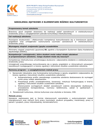 SZKOLENIA JĘZYKOWE Z ELEMENTAMI RÓŻNIC KULTUROWYCH Proponowany temat szkolenia Branżowy język angielski stosowany do realizacji zadań zawodowych w wielokulturowym środowisku pracy z uwzględnieniem potrzeb komunikacji interkulturowej. Cel realizacji szkolenia Rozwijanie skuteczności i efektywności kompetencji komunikowania się w branżowym języku angielskim oraz umiejętności wykonywania czynności zawodowych w wielokulturowym środowisku pracy. Wymagany stopień znajomości języka uczestników Minimalny stopień znajomości językowej B1 zgodnie z Europejskim Systemem Opisu Kształcenia Językowego (ESOKJ). Kompetencje i umiejętności, które student może nabyć dzięki udziałowi w proponowanym szkoleniu. Czego student może się nauczyć? Kompetencja interkulturowa umożliwiająca skuteczne i odpowiednie działanie w wielokulturowym środowisku pracy. Umiejętność prawidłowego komunikowania się w języku angielskim w różnorodnych sytuacjach zawodowych występujących w branży zgodnej z kierunkiem studiów uczestników szkolenia. Ramowy program – z uwzględnieniem metod pracy 1. Sprawności leksykalne oraz funkcjonalna komunikacja w języku angielskim (odpowiednio do branży zgodnej z kierunkiem studiów uczestników szkolenia): a. Autoprezentacja profilu zawodowego uczestnika szkolenia dostosowana do wymagań rynku pracy wobec absolwentów. b. Prezentacja profilu przedsiębiorstwa, korporacji, instytucji funkcjonującej w branży zgodnej z kierunkiem studiów uczestników szkolenia. c. Wykonywanie wymaganych działań zawodowych (zakres obowiązków służbowych, prowadzenie korespondencji, rozmowy telefoniczne, udział w spotkaniach i zebraniach). 2. Świadomość kulturowa, różnice kulturowe oraz etykieta w biznesie, CSR. Metody pracy: Szkolenie realizowane jest w formie intensywnych warsztatów z wykorzystaniem metod interaktywnych oraz różnych form pracy (symulacji, studium przypadku, inscenizacji, pracy w parach i grupach, pracy indywidualnej, konwersatorium). Krótka informacja o prowadzącym/prowadzących Grażyna Kopyś - starszy wykładowca Uniwersytetu Ekonomicznego we Wrocławiu, trener biznesu. Absolwentka Filologii Angielskiej Uniwersytetu Wrocławskiego. Pracę zawodową rozpoczęła w Polskiej Izbie Handlu Zagranicznego, gdzie pełniła funkcję tłumacza języka angielskiego w trakcie spotkań biznesowych oraz zajmowała się korespondencją handlową. Od 1991 roku zatrudniona na Uniwersytecie Ekonomicznym, realizowała szereg projektów w programach Unii Europejskiej oraz prowadziła szkolenia z języka biznesu dla kadry menedżerskiej przedsiębiorstw i instytucji Dolnego Śląska w zakresie różnic kulturowych, negocjacji, prezentacji, spotkań biznesowych, komunikacji interkulturowej oraz korespondencji handlowej. Prowadziła warsztaty językowe w programach „Wrocławski Absolwent” oraz liczne szkolenia dla pracowników dydaktycznych i administracyjnych Uniwersytetu Ekonomicznego. Od 1995 realizuje autorski program języka biznesu na Magisterskich Studiach Menedżerskich (MBA).