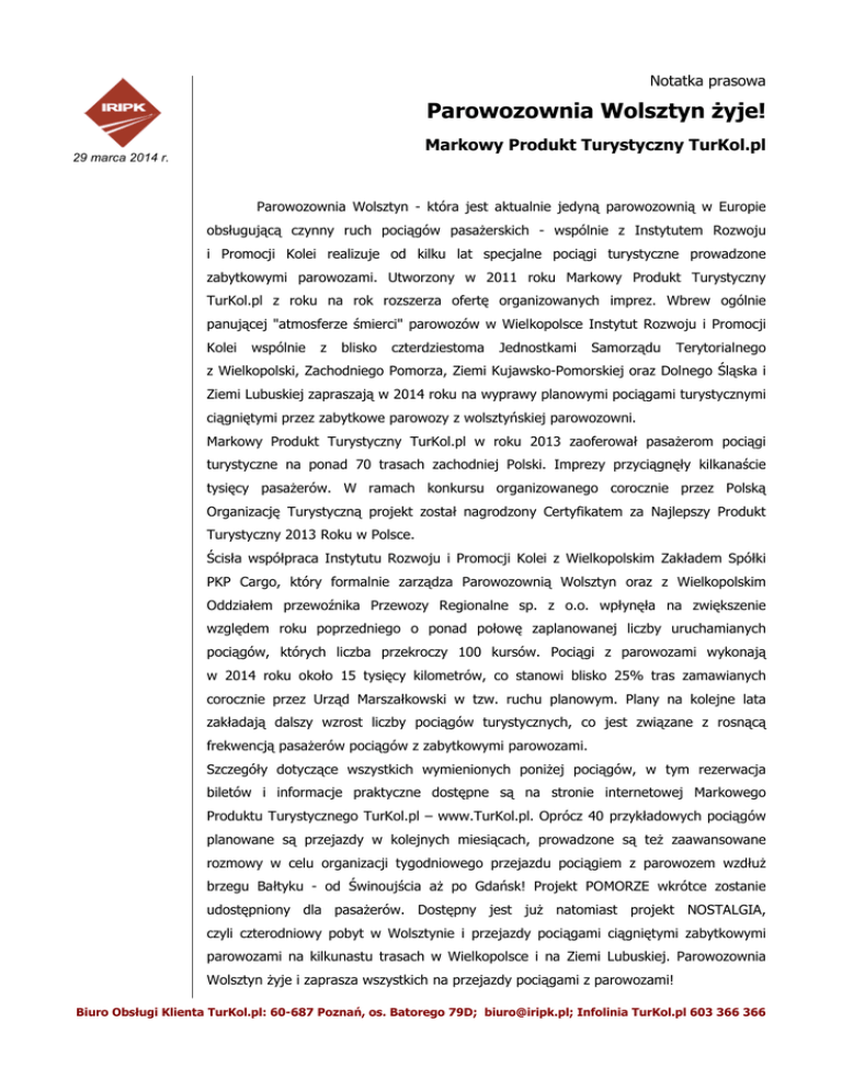 Notatka prasowa Parowozownia Wolsztyn żyje! Markowy Produkt Turystyczny TurKol.pl 29 marca 2014 r. Parowozownia Wolsztyn - która jest aktualnie jedyną parowozownią w Europie obsługującą czynny ruch pociągów pasażerskich - wspólnie z Instytutem Rozwoju i Promocji Kolei realizuje od kilku lat specjalne pociągi turystyczne prowadzone zabytkowymi parowozami. Utworzony w 2011 roku Markowy Produkt Turystyczny TurKol.pl z roku na rok rozszerza ofertę organizowanych imprez. Wbrew ogólnie panującej "atmosferze śmierci" parowozów w Wielkopolsce Instytut Rozwoju i Promocji Kolei wspólnie z blisko czterdziestoma Jednostkami Samorządu Terytorialnego z Wielkopolski, Zachodniego Pomorza, Ziemi Kujawsko-Pomorskiej oraz Dolnego Śląska i Ziemi Lubuskiej zapraszają w 2014 roku na wyprawy planowymi pociągami turystycznymi ciągniętymi przez zabytkowe parowozy z wolsztyńskiej parowozowni. Markowy Produkt Turystyczny TurKol.pl w roku 2013 zaoferował pasażerom pociągi turystyczne na ponad 70 trasach zachodniej Polski. Imprezy przyciągnęły kilkanaście tysięcy pasażerów. W ramach konkursu organizowanego corocznie przez Polską Organizację Turystyczną projekt został nagrodzony Certyfikatem za Najlepszy Produkt Turystyczny 2013 Roku w Polsce. Ścisła współpraca Instytutu Rozwoju i Promocji Kolei z Wielkopolskim Zakładem Spółki PKP Cargo, który formalnie zarządza Parowozownią Wolsztyn oraz z Wielkopolskim Oddziałem przewoźnika Przewozy Regionalne sp. z o.o. wpłynęła na zwiększenie względem roku poprzedniego o ponad połowę zaplanowanej liczby uruchamianych pociągów, których liczba przekroczy 100 kursów. Pociągi z parowozami wykonają w 2014 roku około 15 tysięcy kilometrów, co stanowi blisko 25% tras zamawianych corocznie przez Urząd Marszałkowski w tzw. ruchu planowym. Plany na kolejne lata zakładają dalszy wzrost liczby pociągów turystycznych, co jest związane z rosnącą frekwencją pasażerów pociągów z zabytkowymi parowozami. Szczegóły dotyczące wszystkich wymienionych poniżej pociągów, w tym rezerwacja biletów i informacje praktyczne dostępne są na stronie internetowej Markowego Produktu Turystycznego TurKol.pl – www.TurKol.pl. Oprócz 40 przykładowych pociągów planowane są przejazdy w kolejnych miesiącach, prowadzone są też zaawansowane rozmowy w celu organizacji tygodniowego przejazdu pociągiem z parowozem wzdłuż brzegu Bałtyku - od Świnoujścia aż po Gdańsk! Projekt POMORZE wkrótce zostanie udostępniony dla pasażerów. Dostępny jest już natomiast projekt NOSTALGIA, czyli czterodniowy pobyt w Wolsztynie i przejazdy pociągami ciągniętymi zabytkowymi parowozami na kilkunastu trasach w Wielkopolsce i na Ziemi Lubuskiej. Parowozownia Wolsztyn żyje i zaprasza wszystkich na przejazdy pociągami z parowozami! Biuro Obsługi Klienta TurKol.pl: 60-687 Poznań, os. Batorego 79D; [email protected]; Infolinia TurKol.pl 603 366 366 Oferta turystyczna pociągów „TurKol.pl” realizowanych składami ciągniętymi przez zabytkowe parowozy z wolsztyńskiej parowozowni od kwietnia do sierpnia 2014 to między innymi: PIERNIK - 12 kwietnia - Poznań - Toruń - Poznań; KO-PIERNIK - 12 kwietnia - Toruń - Bydgoszcz - Toruń; BASZTA - 1 maja - Wolsztyn - Jarocin - Poznań - Jarocin - Wolsztyn; FRANEK - 1 maja - wokół Poznania; MEBELEK - 1 maja - Poznań - Swarzędz - Poznań; TULIPAN - 2 maja - Wolsztyn - Międzychód - Wolsztyn; CEGIELSKI - 3 maja - Poznań - Wolsztyn - Poznań; JOANNITA - 4 maja - Wolsztyn - Łagów - Wolsztyn; PERŁA - 4 maja - Łagów - Sieniawa Lubuska - Łagów; WOJCIECH - 17 maja - Wolsztyn - Poznań - Gniezno - Poznań - Wolsztyn; KOSYNIER - 17 maja - Gniezno - Trzemeszno - Gniezno; PIRAT - 31 maja - Poznań - Kołobrzeg - Poznań; PYRA - 13 czerwca - Wolsztyn - Poznań - Wolsztyn; FRANEK - 13 czerwca - wokół Poznania; MEBELEK - 13 czerwca - Poznań - Swarzędz - Poznań; ROLNIK - 13 czerwca - Poznań - Szreniawa - Poznań; ANAKONDA - 22 czerwca - Poznań - Drawsko Pomorskie - Poznań; REKIN - 28 czerwca - Poznań - Świnoujście - Poznań; PŁYWAK - 29 czerwca - Wolsztyn - Cigacice - Zielona Góra - Wolsztyn; WĘZEŁEK - 29 czerwca - Zielona Góra - Czerwieńsk - Zielona Góra; KROTOSZANIN - 5 lipca - Wolsztyn - Leszno - Krotoszyn - Leszno - Wolsztyn; ZIEMIANIN - 5 lipca - Poznań - Krotoszyn - Krobia - Krotoszyn - Poznań; BISKUPIANIN - 5 lipca - Krotoszyn - Krobia - Krotoszyn; FENIKS - 5 lipca - Krotoszyn - Kalisz - Krotoszyn; JOANNITA - 19 lipca - Wolsztyn - Łagów - Wolsztyn; PERŁA - 19 lipca - Łagów - Sieniawa Lubuska - Łagów; CYSTERS - 26 lipca - Wolsztyn - Poznań - Wągrowiec - Poznań - Wolsztyn; ROGAŚ - 26 lipca - Wągrowiec - Rogoźno - Wągrowiec; JOANNITA - 9 sierpnia - Wolsztyn - Łagów - Wolsztyn; PERŁA - 9 sierpnia - Łagów - Sieniawa Lubuska - Łagów; FARMER - 16 sierpnia - Wolsztyn - Międzychód - Wolsztyn; WIERZBA - 16 siierpnia - Międzychód - Wierzbno - Międzychód; POJEZIERZE - 16 sierpnia - Poznań - Międzychód - Poznań; PIERNIK - 23 sierpnia - Poznań - Toruń - Poznań; TĘŻNIA - 23 sierpnia - Toruń - Ciechocinek - Toruń; PYRA - 27 sierpnia - Wolsztyn - Poznań - Wolsztyn; FRANEK - 27 sierpnia - wokół Poznania; MEBELEK - 27 sierpnia - Poznań - Swarzędz - Poznań; ROLNIK - 27 sierpnia - Poznań - Szreniawa - Poznań; KILOF - 30 sierpnia - Poznań - Wrocław - Kłodzko - Wałbrzych - Wrocław - Poznań; Biuro Obsługi Klienta TurKol.pl: 60-687 Poznań, os. Batorego 79D; [email protected]; Infolinia TurKol.pl 603 366 366