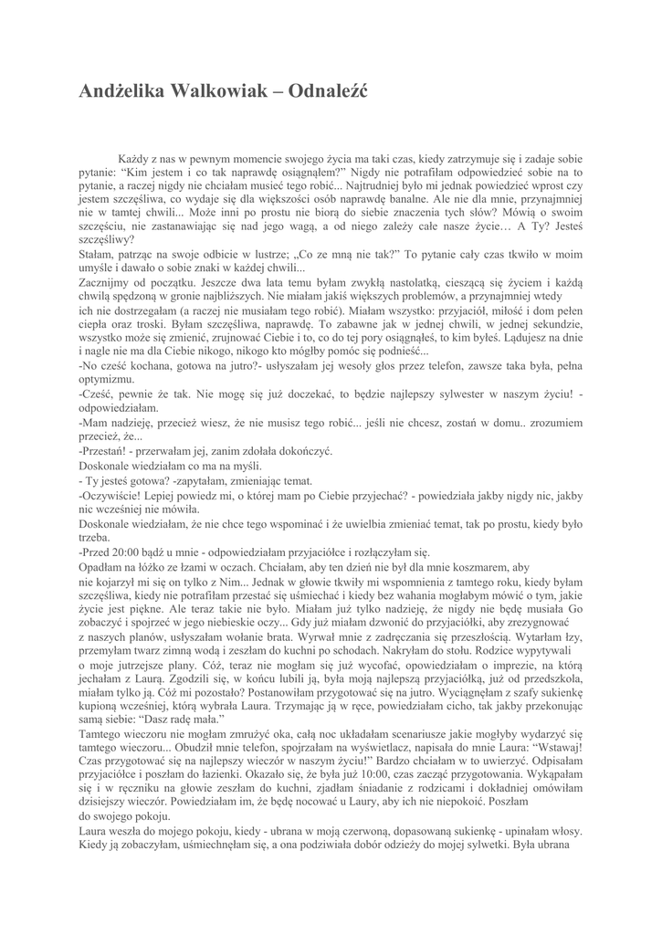 Andżelika Walkowiak – Odnaleźć Każdy z nas w pewnym momencie swojego życia ma taki czas, kiedy zatrzymuje się i zadaje sobie pytanie: “Kim jestem i co tak naprawdę osiągnąłem?” Nigdy nie potrafiłam odpowiedzieć sobie na to pytanie, a raczej nigdy nie chciałam musieć tego robić... Najtrudniej było mi jednak powiedzieć wprost czy jestem szczęśliwa, co wydaje się dla większości osób naprawdę banalne. Ale nie dla mnie, przynajmniej nie w tamtej chwili... Może inni po prostu nie biorą do siebie znaczenia tych słów? Mówią o swoim szczęściu, nie zastanawiając się nad jego wagą, a od niego zależy całe nasze życie… A Ty? Jesteś szczęśliwy? Stałam, patrząc na swoje odbicie w lustrze; „Co ze mną nie tak?” To pytanie cały czas tkwiło w moim umyśle i dawało o sobie znaki w każdej chwili... Zacznijmy od początku. Jeszcze dwa lata temu byłam zwykłą nastolatką, cieszącą się życiem i każdą chwilą spędzoną w gronie najbliższych. Nie miałam jakiś większych problemów, a przynajmniej wtedy ich nie dostrzegałam (a raczej nie musiałam tego robić). Miałam wszystko: przyjaciół, miłość i dom pełen ciepła oraz troski. Byłam szczęśliwa, naprawdę. To zabawne jak w jednej chwili, w jednej sekundzie, wszystko może się zmienić, zrujnować Ciebie i to, co do tej pory osiągnąłeś, to kim byłeś. Lądujesz na dnie i nagle nie ma dla Ciebie nikogo, nikogo kto mógłby pomóc się podnieść... -No cześć kochana, gotowa na jutro?- usłyszałam jej wesoły głos przez telefon, zawsze taka była, pełna optymizmu. -Cześć, pewnie że tak. Nie mogę się już doczekać, to będzie najlepszy sylwester w naszym życiu! odpowiedziałam. -Mam nadzieję, przecież wiesz, że nie musisz tego robić... jeśli nie chcesz, zostań w domu.. zrozumiem przecież, że... -Przestań! - przerwałam jej, zanim zdołała dokończyć. Doskonale wiedziałam co ma na myśli. - Ty jesteś gotowa? -zapytałam, zmieniając temat. -Oczywiście! Lepiej powiedz mi, o której mam po Ciebie przyjechać? - powiedziała jakby nigdy nic, jakby nic wcześniej nie mówiła. Doskonale wiedziałam, że nie chce tego wspominać i że uwielbia zmieniać temat, tak po prostu, kiedy było trzeba. -Przed 20:00 bądź u mnie - odpowiedziałam przyjaciółce i rozłączyłam się. Opadłam na łóżko ze łzami w oczach. Chciałam, aby ten dzień nie był dla mnie koszmarem, aby nie kojarzył mi się on tylko z Nim... Jednak w głowie tkwiły mi wspomnienia z tamtego roku, kiedy byłam szczęśliwa, kiedy nie potrafiłam przestać się uśmiechać i kiedy bez wahania mogłabym mówić o tym, jakie życie jest piękne. Ale teraz takie nie było. Miałam już tylko nadzieję, że nigdy nie będę musiała Go zobaczyć i spojrzeć w jego niebieskie oczy... Gdy już miałam dzwonić do przyjaciółki, aby zrezygnować z naszych planów, usłyszałam wołanie brata. Wyrwał mnie z zadręczania się przeszłością. Wytarłam łzy, przemyłam twarz zimną wodą i zeszłam do kuchni po schodach. Nakryłam do stołu. Rodzice wypytywali o moje jutrzejsze plany. Cóż, teraz nie mogłam się już wycofać, opowiedziałam o imprezie, na którą jechałam z Laurą. Zgodzili się, w końcu lubili ją, była moją najlepszą przyjaciółką, już od przedszkola, miałam tylko ją. Cóż mi pozostało? Postanowiłam przygotować się na jutro. Wyciągnęłam z szafy sukienkę kupioną wcześniej, którą wybrała Laura. Trzymając ją w ręce, powiedziałam cicho, tak jakby przekonując samą siebie: “Dasz radę mała.” Tamtego wieczoru nie mogłam zmrużyć oka, całą noc układałam scenariusze jakie mogłyby wydarzyć się tamtego wieczoru... Obudził mnie telefon, spojrzałam na wyświetlacz, napisała do mnie Laura: “Wstawaj! Czas przygotować się na najlepszy wieczór w naszym życiu!” Bardzo chciałam w to uwierzyć. Odpisałam przyjaciółce i poszłam do łazienki. Okazało się, że była już 10:00, czas zacząć przygotowania. Wykąpałam się i w ręczniku na głowie zeszłam do kuchni, zjadłam śniadanie z rodzicami i dokładniej omówiłam dzisiejszy wieczór. Powiedziałam im, że będę nocować u Laury, aby ich nie niepokoić. Poszłam do swojego pokoju. Laura weszła do mojego pokoju, kiedy - ubrana w moją czerwoną, dopasowaną sukienkę - upinałam włosy. Kiedy ją zobaczyłam, uśmiechnęłam się, a ona podziwiała dobór odzieży do mojej sylwetki. Była ubrana w krótką niebieską sukienkę, na szyi wisiał naszyjnik, który dostała ode mnie na swoje 16. urodziny. Jej usta, z których uśmiech nie znikał, były podkreślone ciemną czerwienią, włosy opadały jej na ramiona. Wyglądała naprawdę pięknie. Przywitałyśmy się. Pomogła mi dokończyć makijaż, a gdy już miałyśmy szykować się do wyjścia, usiadła na łóżku, spoglądając na mnie. Wiedziałam co się teraz stanie. Zacznie się jej gadka o tym, ile wycierpiałam i ile znaczy dla niej to, że nie siedzę w domu dzisiejszego wieczoru. Nim zdążyła otworzyć usta, przerwałam jej, uśmiechając się i krzycząc: - Będziemy się świetnie bawić! (nie wiem tylko czy próbowałam przekonać ją, czy samą siebie). -A więc chodźmy- odpowiedziała, zaczynając się śmiać. Pożegnałam się z rodzicami. Gdy wychodziłyśmy, krzyknęli tylko coś w rodzaju ‘’Uważaj na siebie’’. Nie wiem co mieli na myśli, ale wtedy nie przejmowałam się tym za bardzo, martwiłam się tylko tym, jak przetrwać kolejnych kilka godzin. Wchodząc do samochodu, rzuciłam Laurze tylko przelotny uśmiech. Przez cała drogę nie odezwałyśmy się do siebie, nie wiem czy chciała zastanowić się jak mi pomóc, czy po prostu dała mi czas, abym trochę ochłonęła. Nienawidziłam tej ciszy, słyszałam tylko w głowie głosy: URODZIŁAŚ SIĘ TYLKO PO TO, ABY PRZYSPARZAĆ CIERPIEŃ KAŻDEMU, KTO SIĘ Z TOBĄ ZETKNĄŁ, chciałam wyrzucić te słowa z mojej głowy, zamknęłam oczy