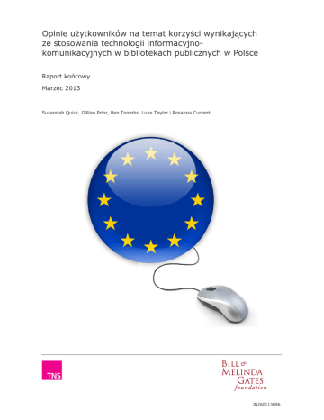 Opinie użytkowników na temat korzyści wynikających ze stosowania technologii informacyjnokomunikacyjnych w bibliotekach publicznych w Polsce Raport końcowy Marzec 2013 Susannah Quick, Gillian Prior, Ben Toombs, Luke Taylor i Rosanna Currenti JN260113096 Spis treści Podsumowanie wyników badania 4 1. Uwarunkowania i metodologia 7 2. Obraz bibliotek publicznych i dostępu do Internetu 9 3. Korzystanie z bibliotek oraz komputerów publicznych 10 4. Postrzeganie bibliotek publicznych 18 5. Nieformalne i pozaformalne uczenie się 21 6. Zastosowanie komputerów publicznych w dziedzinie zatrudnienia i działalności gospodarczej 24 7. E-administracja i aktywność obywatelska 26 8. Korzyści 29 Opinie użytkowników dotyczące stosowania technologii komunikacyjno-informacyjnych w bibliotekach publicznych w Polsce 2 Podziękowania Autorzy niniejszego raportu dziękują następującym osobom za ich wkład w realizację publikacji i pomoc, które przyczyniły się do pomyślnego zakończenia tego projektu: Jan Braeckman Bibnet Kelly Carey GMMB Belgium Marcel Chiranov Biblionet Romania Romania Mikkel Christoffersen Kulturstyrelsen / Danish Agency for Culture Denmark Giedrė Čistovienė Lithuania Chris Coward National Library of Lithuania Technology and Social Change Group (TASCHA), University of Washington Annie Dourlent Bibliothèque publique d'information France Elaine Fulton Scottish Library and Information Council/CILIP in Scotland United Kingdom Francoise Gaudet Bibliothèque publique d'information France Robin Knowles Civic Agenda Library Development Program, Information Society Development Foundation Poland Maciej Kochanowicz Zdenek Matušík Fédération Wallonie Bruxelles Service de la lecture publique Association of Library and Information Professionals of the Czech Republic (SKIP) Maria Antonia Carrato Mena Ministerio de Educación, Cultura y Deporte Dan Mount Civic Agenda Julia Nagy GMMB Margarida Oleiro Direção‐Geral do Livro, dos Arquivos e das Bibliotecas Portugal Marjolein Oomes Netherlands Institute for Public Libraries Netherlands Helen Osborn Libraries NI United Kingdom Kristine Paberza State Agency „Culture Information Systems” Latvia Jeremy Paley Global Libraries, Bill & Melinda Gates foundation USA Stefano Parise Comune di Milano Italy Aldo Pirola Comune di Milano Italy Vasilis Polyhronopoulos Total Quality Unit of Greek Academic Libraries Greece Renata Sadunishvili Independent consultant Lithuania Janet Sawaya Global Libraries, Bill & Melinda Gates foundation USA Miriam Schriefers Deutscher Bibliotheksverband e.V. Germany David Streatfield United Kingdom Ian Watson Consultant Adult & Community Services Directorate, Lancashire County Council United Kingdom Barbro Wigell‐Ryynänen Ministry of Education and Culture Finland Alexandre Lemaire Belgium Czech Republic Spain Branimira Vezhdarova Glob@l Libraries – Bulgaria Bulgaria Anna Kåring Wagman Swedish Library Association Sweden Helen Williams CyMAL: Museums Archives and Libraries Wales United Kingdom Dr George Zachos Council of Libraries and Archives at the Ministry of Education Greece Wyłączenie odpowiedzialności Niniejszy raport opiera się na badaniu sfinansowanym przez fundację Billa i Melindy Gates. Ustalenia oraz wnioski zawarte w raporcie są wyrazem osobistych poglądów autorów i niekoniecznie odzwierciedlają stanowisko oraz politykę fundacji Billa i Melindy Gates. Opinie użytkowników dotyczące stosowania technologii komunikacyjno-informacyjnych w bibliotekach publicznych w Polsce 3 Podsumowanie wyników badania Cele i metodologia badania Fundacja Billa i Melindy Gates zleciła TNS, niezależnej firmie badawczej o globalnym zasięgu, przeprowadzenie badania w 17 krajach UE, aby poznać opinie na temat bibliotek publicznych i określić sposoby korzystania z nich. Badanie miało ustalić, jaki wpływ wywierają biblioteki publiczne nażycie użytkowników. Badanie składało się z następujących części: warsztaty z udziałem stron zainteresowanych w celu omówienia priorytetów badania; badanie źródeł zastanych, aby zebrać kluczowe dane na temat bibliotek; badanie ankietowe reprezentatywnej próby populacji w wieku od 15 lat wzwyż w każdym z 17 krajów; badanie ankietowe wśród użytkowników bibliotek oraz użytkowników publicznych komputerów w badanie jakościowe wśród użytkowników oraz personelu bibliotek. wieku od 15 lat wzwyż w każdym z 17 krajów, prowadzone w bibliotekach; oraz Niniejszy raport przedstawia w skrótowej formie wyniki uzyskane w Polsce i porównuje je z wynikami uzyskanymi dla całej UE. Obraz bibliotek publicznych w Polsce Na podstawie badania źródeł zastanych ustalono, że w Polsce istnieje 8 261 bibliotek publicznych, co przekłada się na 2,2 biblioteki na 10 000 mieszkańców, w porównaniu ze średnią w UE, wynoszącą 1,3 biblioteki na 10 000 mieszkańców. Obecnie 83% bibliotek publicznych w Polsce oferuje użytkownikom dostęp do komputerów. Korzystanie z bibliotek oraz publicznie dostępnych komputerów Szacuje się, że 6,6 miliona dorosłych Polaków, tj. jedna piąta dorosłych mieszkańców kraju (20%), korzystała z biblioteki publicznej w ciągu ostatnich 12 miesięcy w porównaniu z nieco mniej niż jedną czwartą (23%) dorosłych w Europie. Około 0,5 miliona dorosłych w Polsce, 1% dorosłej populacji, korzystało z publicznie dostępnych komputerów w ciągu ostatnich 12 miesięcy. Jest to zdecydowanie poniżej średniej europejskiej, wynoszącej 4% dorosłych. Użytkownikami publicznie dostępnych komputerów w Polsce – podobnie jak w przypadku średniej unijnej – są częściej mężczyźni oraz osoby z grupy wiekowej 15-24 lata; znacznie częściej, w porównaniu ze średnią dla UE, są to osoby mieszkające w miastach lub dużych miastach i częściej także niż w przypadku średniej w Unii mamy do czynienia z osobami , które nadal uczą się/studiują. Wśród głównych motywacji użytkowników publicznie dostę