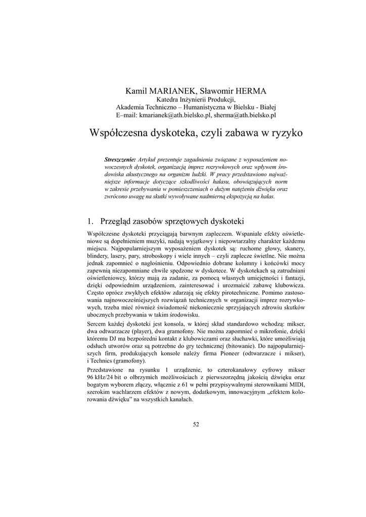 Kamil MARIANEK, Sławomir HERMA Katedra Inżynierii Produkcji, Akademia Techniczno – Humanistyczna w Bielsku - Białej E–mail: [email protected], [email protected] Współczesna dyskoteka, czyli zabawa w ryzyko Streszczenie: Artykuł prezentuje zagadnienia związane z wyposażeniem nowoczesnych dyskotek, organizacją imprez rozrywkowych oraz wpływem środowiska akustycznego na organizm ludzki. W pracy przedstawiono najważniejsze informacje dotyczące szkodliwości hałasu, obowiązujących norm w zakresie przebywania w pomieszczeniach o dużym natężeniu dźwięku oraz zwrócono uwagę na skutki wywoływane nadmierną ekspozycją na hałas. 1. Przegląd zasobów sprzętowych dyskoteki Współczesne dyskoteki przyciągają barwnym zapleczem. Wspaniałe efekty oświetleniowe są dopełnieniem muzyki, nadają wyjątkowy i niepowtarzalny charakter każdemu miejscu. Najpopularniejszym wyposażeniem dyskotek są: ruchome głowy, skanery, blindery, lasery, pary, stroboskopy i wiele innych – czyli zaplecze świetlne. Nie można jednak zapomnieć o nagłośnieniu. Odpowiednio dobrane kolumny i końcówki mocy zapewnią niezapomniane chwile spędzone w dyskotece. W dyskotekach są zatrudniani oświetleniowcy, którzy mają za zadanie, za pomocą własnych umiejętności i fantazji, dzięki odpowiednim urządzeniom, zainteresować i urozmaicić zabawę klubowicza. Często oprócz zwykłych efektów zdarzają się efekty pirotechniczne. Pomimo zastosowania najnowocześniejszych rozwiązań technicznych w organizacji imprez rozrywkowych, trzeba mieć również świadomość niekoniecznie sprzyjających zdrowiu skutków ubocznych przebywania w takim środowisku. Sercem każdej dyskoteki jest konsola, w której skład standardowo wchodzą: mikser, dwa odtwarzacze (player), dwa gramofony. Nie można zapomnieć o mikrofonie, dzięki któremu DJ ma bezpośredni kontakt z klubowiczami oraz słuchawki, które umożliwiają odsłuch utworów oraz są potrzebne do gry technicznej (bitowanie). Do najpopularniejszych firm, produkujących konsole należy firma Pioneer (odtwarzacze i mikser), i Technics (gramofony). Przedstawione na rysunku 1 urządzenie, to czterokanałowy cyfrowy mikser 96 kHz/24 bit o olbrzymich możliwościach z pierwszorzędną jakością dźwięku oraz bogatym wyborem złączy, włącznie z 61 w pełni przypisywalnymi sterownikami MIDI, szerokim wachlarzem efektów z nowym, dodatkowym, innowacyjnym „efektem kolorowania dźwięku” na wszystkich kanałach. 52 Rys. 1. Przykładowy mikser PIONEER DJM-800 DJM Rys. 2. Przykładowe odtwarzacze o Pioneer CDJ-1000MK3 Przedstawione na rysunku 2 odtwarzacze obejmują pełną kompatybilność z formatem MP3, funkcję HOT LOOP, możliwość regulacji "wyczucia" siły oporu tarczy JOG oraz udoskonaloną aloną prezentację ścieżki i danych WAVE wraz z obsługą kart SD do zapisywazapisyw nia punktów cue i pętli. Ponadto jaśniejszy wyświetlacz na podniesionej tarczy JOG o większej rozdzielczości oraz poprawione parametry wyświetlacza głównego jeszcze bardziej zwiększają ją możliwości użytkowania. Rys. 3. Przykładowy Przykładow gramofon TECHNICS 1210 M5G 53 Kolejno, gramofony Technics charakteryzują się długowiecznością, ale model "1210 M5G" to pierwszy gramofon tej firmy, co do którego nie można mieć zastrzeżeń. Wyposażony jest w osobny tryb pracy umożliwiający zmiany prędkości w zakresie +/-16 % (choć można też grać w klasyczny sposób na +/- 8%), obudowany włącznik nie daje się już tak łatwo wyłączyć w czasie „skreczu”, dodano też twardą slipmatę oraz specjalną folię dzięki czemu „skrecz” może być jeszcze efektywniejszy. Stabilizowany kwarcowo napęd pozwala odtwarzać płyty o prędkościach 331/3 lub 45 RPM (obroty na minutę). Jak większość urządzeń tej firmy, gramofon wyposażono w pokrywę oraz koszyk na krótki system (headshell). Dopełnieniem sceny dźwiękowej każdego klubu jest właściwy dobór oświetlenia. Stanowi ono uzupełnienie atmosfery i często ogromną atrakcję. Oświetlenie jest również bardzo często niedoceniane w mniejszych dyskotekach czy klubach, co jest dużym błędem, ze względu na atrakcyjność i aranżacje wnętrza klubu. Do uzyskania właściwej sceny świetlnej kluby dysponują w dzisiejszych czasach bardzo szeroką gamą urządzeń emitujących wiele rodzajów światła. Najpopularniejszymi z nich są ruchome głowice, skanery, stroboskopy oraz wszechobecne lasery. Właściwy dobór urządzeń, ich rozmieszczenie oraz konfiguracja programów – to zadanie dla „dj-light’a”. Osoba ta w klubie jest praktycznie niezauważalna a od jej pracy zależy cała scena świetlna i wrażenia wizualne towarzyszące muzyce. Wszystkie urządzenia emisyjne wykorzystują różne typy źródeł światła. Mogą to być zwykłe żarowe punkty świetlne, neony, lampy halogenowe, żarówki wyładowcze oraz diody świetlne i diody laserowe. Uzupełnieniem są różnej mocy palniki stroboskopowe emitujące cykliczne błyski o bardzo dużej mocy. We współczesnych klubach najczęściej stosowane są różnej mocy i wielkości ruchome głowice świetlne. Urządzenia składające się z korpusu i obrotowego elementu świetlnego, wykorzystują tzw. tarcze gobo (wzorów) oraz tarcze kolorów. Dzięki nim można wyświetlać rozmaite układy świetlne obejmujące bardzo dużą powierzchnię. Ruchome głowice mają bowiem możliwość pracy w szerokim zakresie obejmującym 440º × 306º. Flagowym modelem wykorzystywanym bardzo często przy tworzeniu scen świetlnych jest produkt firmy Martin model MAC 500. Uzupełnieniem dla sceny tworzonej z ruchomych głowic jest urządzenie potocznie zwane skanerem. Od omawianego wcześniej urządzenia odróżnia je mniejsze spektrum, dostępne za pomocą promienia świetlnego oraz praca wiązką światła odbitego od lustra skanującego. Poza tymi szczegółami, skanery mogą być wyposażone w źródła światła oraz 