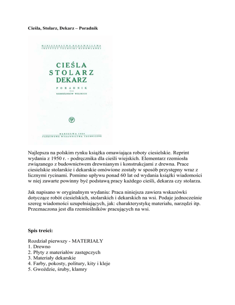 Cieśla, Stolarz, Dekarz – Poradnik Najlepsza na polskim rynku książka omawiająca roboty ciesielskie. Reprint wydania z 1950 r. - podręcznika dla cieśli wiejskich. Elementarz rzemiosła związanego z budownictwem drewnianym i konstrukcjami z drewna. Prace ciesielskie stolarskie i dekarskie omówione zostały w sposób przystępny wraz z licznymi rycinami. Pomimo upływu ponad 60 lat od wydania książki wiadomości w niej zawarte powinny być podstawą pracy każdego cieśli, dekarza czy stolarza. Jak napisano w oryginalnym wydaniu: Praca niniejsza zawiera wskazówki dotyczące robót ciesielskich, stolarskich i dekarskich na wsi. Podaje jednocześnie szereg wiadomości uzupełniających, jak: charakterystykę materiału, narzędzi itp. Przeznaczona jest dla rzemieślników pracujących na wsi. Spis treści: Rozdział pierwszy - MATERIAŁY 1. Drewno 2. Płyty z materiałów zastępczych 3. Materiały dekarskie 4. Farby, pokosty, politury, kity i kleje 5. Gwoździe, śruby, klamry Rozdział drugi - ROBOTY CIEŚIELSKIE 1. Charakterystyka budynków drewnianych 2. Narzędzia ciesielskie 3. Ściany drewniane 4. Stropy drewniane 5. Podłogi drewniane i posadzki 6. Więźba dachowa 7. Rusztowania i deskowania 8. Deskowania i stemplowania Rozdział trzeci - ROBOTY STOLARSKIE 1. Narzędzia i sprzęt stolarski 2. Dobór i obróbka materiału 3. Złącza stolarskie 4. Okna 5. Drzwi i bramy 6. Okucia okien, drzwi i bram 7. Szklenie 8. Schody drewniane 9. Gruntowanie i malowanie oraz politurowanie stolarki Rozdział czwarty - ROBOTY DEKARSKIE 1. Uwagi ogólne 2. Pokrycia palne 3. Pokrycia ogniochronne Rozdział piąty - TABLICE OBLICZEŃ I WZORY 1. Pola figur płaskich 2. Objętości niektórych brył 3. Sposoby wykreślania linii krzywych 4. Miary 5. Ciężary objętościowe niektórych materiałów i konstrukcji 6. Obciążenie użytkowe stropów 7. Analiza robót i przekroje drewna 8. Kąty pochylenia dachu zależne od sposobu pokrycia 9. Ciężar pokrycia dachowego wraz z ciężarem łacenia i krokwi w kilkogramach
