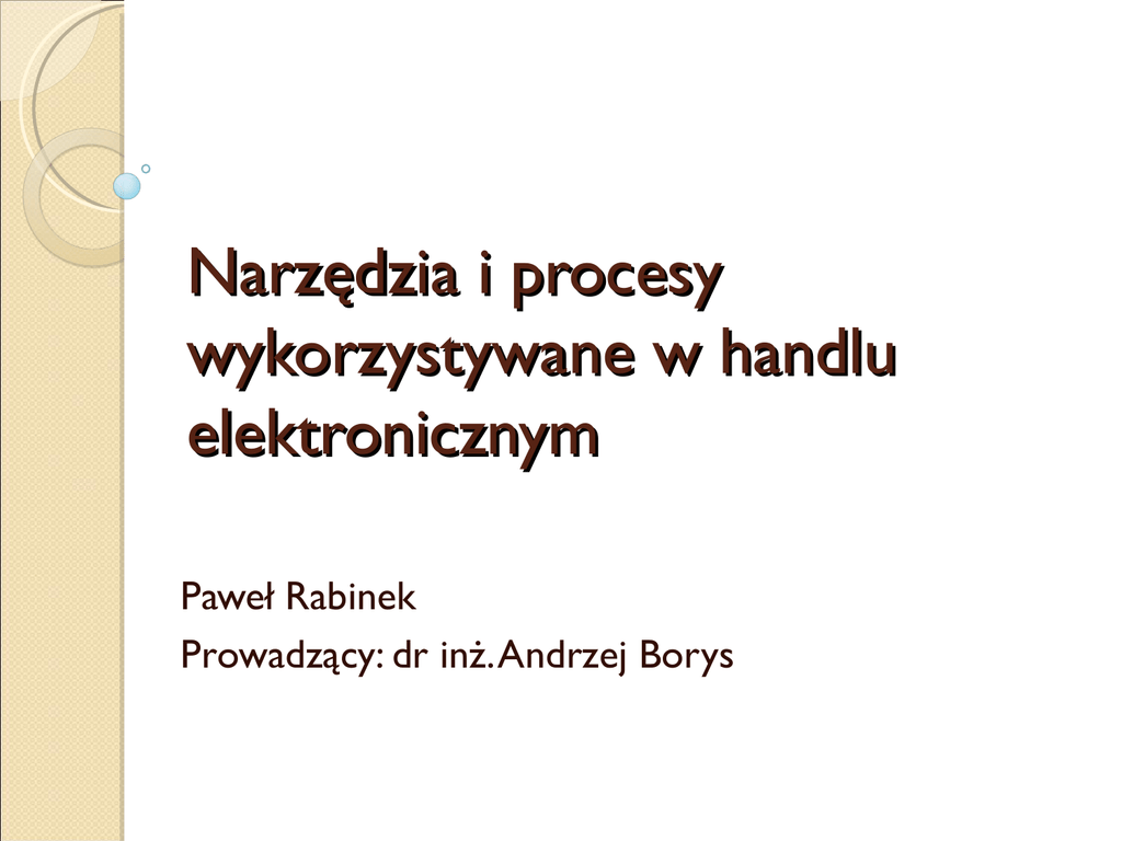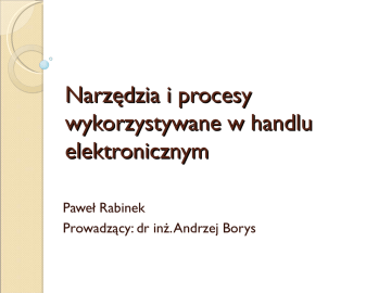 Narzędzia i procesy wykorzystywane w handlu elektronicznym Paweł Rabinek Prowadzący: dr inż. Andrzej Borys Plan prezentacji Podstawowe pojęcia E-commerce w Polsce Platformy handlu elektronicznego M-commerce Cel pracy Przedstawienie narzędzi oraz procesów w handlu elektronicznym Rozpoznanie technicznych problemów w handlu elektronicznym i propozycje ich rozwiązania Podstawowe pojęcia E-commerce – handel elektroniczny Podstawowe pojęcia M-commerce – handel elektroniczny z wykorzystaniem urządzeń mobilnych Rodzaje usług B2B - Business-to-Business Dystrybutor – Sklep Tour operator – Biuro podróży B2C - Business-to-Consumer Sklep – Klient E-commerce w Polsce Według Money.pl, w roku 2006: 12 mln Internautów powyżej 15 lat 3,3 mln robi zakupy w sieci 5,8 mln korzysta z serwisów ogłoszeniowych 5 mld zł obrotu 0,9 mld zł w 2004 Popularne produkty i usługi książki obuwie i buty telefony komórkowe i akcesoria sprzęt komputerowy sprzęt RTV muzyka (płyty, kasety, DVD, MP3) kosmetyki części samochodowe sprzęt fotograficzny rzeczy dla dzieci bilety lotnicze, kolejowe oprogramowanie sprzęt sportowy/turystyczny inne gry komputerowe bilety na koncerty filmy (VHS, DVD, CD-R) usługi turystyczne 14,23% 12,39% 9,02% 8,87% 8,74% 7,83% 7,81% 6,29% 5,65% 4,79% 4,74% 4,57% 4,54% 4,32% 3,78% 3,74% 3,44% 2,90% Raport SMG/KRC z 2006 roku Platformy handlu elektronicznego Aukcje Darmowe sklepy (open source) Płatne oprogramowanie ◦ Jednorazowa opłata (sklep) ◦ Abonament (sklep, serwer, wsparcie) Dedykowane rozwiązania Aukcje internetowe Najniższy koszt Małe możliwości Brak specjalistycznych narzędzi Duży zasięg Sklepy Open Source Niski koszt Wymagana duża wiedza Teoretycznie duże możliwości rozbudowy Słaba dokumentacja i brak wsparcia Przestarzałe oprogramowanie Własny serwer Płatne oprogramowanie Opłaty jednorazowe lub abonament Uzależnienie od producenta Duże możliwości Dobre wsparcie Dedykowane rozwiązania Duży koszt Częściowe uzależnienie od producenta Bardzo duże możliwości Wymagane doświadczenie Własny serwer Narzędzia wspomagające CMS (Content Management System) System zarządzania treścią CRM (Customer Relationship Management) System relacji z klientami M-commerce Płatności Zakupy Usługi bankowe Bilety komunikacji miejskiej Opłaty parkingowe Pobieranie multimediów Usługi informacyjne ◦ Wiadomości, giełda, sport, pogoda LBS (Location-based Services) ◦ Informacje o korkach Dziękuje za uwagę