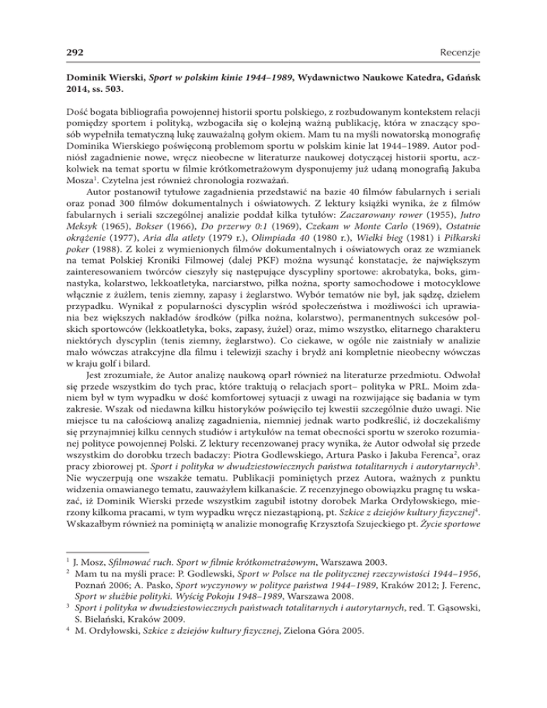 292 Recenzje Dominik Wierski, Sport w polskim kinie 1944–1989, Wydawnictwo Naukowe Katedra, Gdańsk 2014, ss. 503. Dość bogata bibliografia powojennej historii sportu polskiego, z rozbudowanym kontekstem relacji pomiędzy sportem i polityką, wzbogaciła się o kolejną ważną publikację, która w znaczący sposób wypełniła tematyczną lukę zauważalną gołym okiem. Mam tu na myśli nowatorską monografię Dominika Wierskiego poświęconą problemom sportu w polskim kinie lat 1944–1989. Autor podniósł zagadnienie nowe, wręcz nieobecne w literaturze naukowej dotyczącej historii sportu, aczkolwiek na temat sportu w filmie krótkometrażowym dysponujemy już udaną monografią Jakuba Mosza1. Czytelna jest również chronologia rozważań. Autor postanowił tytułowe zagadnienia przedstawić na bazie 40 filmów fabularnych i seriali oraz ponad 300 filmów dokumentalnych i oświatowych. Z lektury książki wynika, że z filmów fabularnych i seriali szczególnej analizie poddał kilka tytułów: Zaczarowany rower (1955), Jutro Meksyk (1965), Bokser (1966), Do przerwy 0:1 (1969), Czekam w Monte Carlo (1969), Ostatnie okrążenie (1977), Aria dla atlety (1979 r.), Olimpiada 40 (1980 r.), Wielki bieg (1981) i Piłkarski poker (1988). Z kolei z wymienionych filmów dokumentalnych i oświatowych oraz ze wzmianek na temat Polskiej Kroniki Filmowej (dalej PKF) można wysunąć konstatacje, że największym zainteresowaniem twórców cieszyły się następujące dyscypliny sportowe: akrobatyka, boks, gimnastyka, kolarstwo, lekkoatletyka, narciarstwo, piłka nożna, sporty samochodowe i motocyklowe włącznie z żużlem, tenis ziemny, zapasy i żeglarstwo. Wybór tematów nie był, jak sądzę, dziełem przypadku. Wynikał z popularności dyscyplin wśród społeczeństwa i możliwości ich uprawiania bez większych nakładów środków (piłka nożna, kolarstwo), permanentnych sukcesów polskich sportowców (lekkoatletyka, boks, zapasy, żużel) oraz, mimo wszystko, elitarnego charakteru niektórych dyscyplin (tenis ziemny, żeglarstwo). Co ciekawe, w ogóle nie zaistniały w analizie mało wówczas atrakcyjne dla filmu i telewizji szachy i brydż ani kompletnie nieobecny wówczas w kraju golf i bilard. Jest zrozumiałe, że Autor analizę naukową oparł również na literaturze przedmiotu. Odwołał się przede wszystkim do tych prac, które traktują o relacjach sport– polityka w PRL. Moim zdaniem był w tym wypadku w dość komfortowej sytuacji z uwagi na rozwijające się badania w tym zakresie. Wszak od niedawna kilku historyków poświęciło tej kwestii szczególnie dużo uwagi. Nie miejsce tu na całościową analizę zagadnienia, niemniej jednak warto podkreślić, iż doczekaliśmy się przynajmniej kilku cennych studiów i artykułów na temat obecności sportu w szeroko rozumianej polityce powojennej Polski. Z lektury recenzowanej pracy wynika, że Autor odwołał się przede wszystkim do dorobku trzech badaczy: Piotra Godlewskiego, Artura Pasko i Jakuba Ferenca2, oraz pracy zbiorowej pt. Sport i polityka w dwudziestowiecznych państwa totalitarnych i autorytarnych3. Nie wyczerpują one wszakże tematu. Publikacji pominiętych przez Autora, ważnych z punktu widzenia omawianego tematu, zauważyłem kilkanaście. Z recenzyjnego obowiązku pragnę tu wskazać, iż Dominik Wierski przede wszystkim zagubił istotny dorobek Marka Ordyłowskiego, mierzony kilkoma pracami, w tym wypadku wręcz niezastąpioną, pt. Szkice z dziejów kultury fizycznej4. Wskazałbym również na pominiętą w analizie monografię Krzysztofa Szujeckiego pt. Życie sportowe 1 2 3 4 J. Mosz, Sfilmować ruch. Sport w filmie krótkometrażowym, Warszawa 2003. Mam tu na myśli prace: P. Godlewski, Sport w Polsce na tle politycznej rzeczywistości 1944–1956, Poznań 2006; A. Pasko, Sport wyczynowy w polityce państwa 1944–1989, Kraków 2012; J. Ferenc, Sport w służbie polityki. Wyścig Pokoju 1948–1989, Warszawa 2008. Sport i polityka w dwudziestowiecznych państwach totalitarnych i autorytarnych, red. T. Gąsowski, S. Bielański, Kraków 2009. M. Ordyłowski, Szkice z dziejów kultury fizycznej, Zielona Góra 2005. Recenzje 293 w PRL5. Zważywszy że gros rozważań w recenzowanej pracy odnosi się do tematyki piłkarskiej, nie sposób tu nie zauważyć, że konieczne było odwołanie się do pracy Roberta Gawkowskiego pt. Futbol dawnej Warszawy6, której ostatnia część dotyka problematyki sportu piłkarskiego w okupowanej Warszawie i w pierwszych pięciu powojennych latach. Tej samej dyscyplinie poświęcona została również praca zbiorowa pt. Tajne służby a piłka nożna7, która chronologicznie odnosi się przede wszystkim do lat 60.–70. i późniejszych, z tekstami kilku historyków: Grzegorza Majchrzaka, Sebastiana Ligarskiego, Marty Marcinkiewicz, Krzysztofa Łoniewskiego, Jerzego Eislera, Karola Nawrockiego, Jarosława Wąsowicza, Pawła Szulca i Grzegorza Wołka. Ich rozważania dotyczą np. rywalizacji Górnika Zabrze z Manchesterem United oraz Lechii Gdańsk z Juventusem Turyn, którą po dzień dzisiejszy wspominają kibice piłki nożnej. Historycy omówili również kulisy mundialów 1982 r. i 1986 r. (spojrzenie przez pryzmat komisarza wojskowego i funkcjonariuszy służby bezpieczeństwa). Zachęcam do lektury tej pracy chociażby przez wzgląd na to, iż gros uwagi Autor poświęcił grze reprezentacji Polski na mundialach oraz analizie filmu pt. Piłkarski poker. W gronie bohaterów wymienionego wyżej tomu jest także Jan Ciszewski, jeden z najwybitniejszych komentatorów sportowych powojennej Polski, który na początku lat 70. podjął współpracę ze Służbą Bezpieczeństwa. O innych komentatorach sportowych, niekwestionowanych z racji swoich kompetencji, w zakresie tak popularnych dyscyplin, jak kolarstwo i tenis ziemny, traktują prace Artura Cegiełki pt. Działania MSW wokół olimpijskich zmagań. Moskwa ’808 i Magia sportu i słowa. Tom studiów dedykow