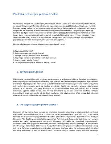 Polityka dotycząca plików Cookie W poniższej Polityce ws. Cookie opisujemy rodzaje plików Cookie oraz inne technologie stosowane na naszej Witrynie i platformie, jak również wyjaśniamy, do czego pliki te służą. Pragniemy zwrócid Paostwa uwagę na fakt, że bez umieszczania plików Cookie i/lub podobnych technologii w Paostwa urządzeniu nie jesteśmy w stanie oferowad naszej Witryny lub Serwisu. Z tego względu wyrażają Paostwo zgodę na stosowanie przez nas plików Cookie podczas korzystania przez Paostwa ze Stron Grupy Aviva za pomocą domyślnych ustawieo przeglądarki (zgodnie z art. 173 ust. 2 Ustawy Prawo Telekomunikacyjne). Jednakże mogą Paostwo zrezygnowad z wykorzystania tego rodzaju plików poprzez odpowiednie skonfigurowanie ustawieo przeglądarki. Niniejsza Polityka ws. Cookie składa się z następujących części: 1. Czym są pliki Cookie? 2. Do czego używamy plików Cookie? 3. Jakiego rodzaju plików Cookie używamy? 4. Czy mogę sterowad plikami Cookie lub je usunąd? 5. Czy używamy plików Cookie? 6. Szczegółowe informacje na temat plików Cookie? 1. Czym są pliki Cookie? Pliki Cookie to niewielkie pliki tekstowe umieszczone w wybranym folderze Paostwa przeglądarki. Podczas przeglądania witryny internetowej tego rodzaju plik umieszczony w urządzeniu wyśle pewne informacje do przeglądarki. Pliki Cookie są bardzo rozpowszechnione i używane na niemal wszystkich witrynach internetowych, gdyż są bardzo przydatne. Dzięki nim zarządca witryny internetowej mógłby m.in. określid, czy dany komputer (i prawdopodobnie jego użytkownik) już ją kiedyś odwiedził. Ogólnie rzecz biorąc, pliki Cookie stosowane są w celu poprawy działania witryny internetowej oraz uczynienia jej bardziej atrakcyjną dla użytkownika, chod mogą byd również używane w celach reklamowych (co wyjaśniamy poniżej). 2. Do czego używamy plików Cookie? Używamy ich by Strona Aviva stawała się łatwiejsze (bardziej intuicyjna) w użytkowaniu i aby lepiej dopasowad Strony Aviva oraz nasze produkty do twoich zainteresowao i potrzeb. Pliki Cookie mogą również byd używane do przyśpieszenia Paostwa przyszłych aktywności i doświadczeo na naszych Stronach. Pliki Cookie pozwalają także zapamiętad Paostwa sesje logowania ułatwiając tym samym dostęp do treści wymagających rejestracji. Używamy ich także do kompilacji anonimowych, statystyk, które pomagają nam zrozumied jak ludzie używają naszych stron i pomagają w polepszeniu ich struktury i zawartości. Pliki Cookie mogą służyd także do poprawy wydajności działania naszej witryny w Paostwa przeglądarce, umożliwiają poprawne działanie wielu narzędzi wsparcia (takich jak wirtualny asystent) czy też prezentację treści multimedialnych (wideo, mapy, niektóre animacje 1 Flash). Pliki Cookie są niezbędne do poprawnej integracji witryny z usługami społecznościowymi, takimi jak Facebook.com czy Twitter.com. 3. Jakiego rodzaju plików Cookie używamy? Na Stronach AVIVA mogą byd używane dwa rodzaje plików Cookie – „sesyjne” oraz „stałe”. Te pierwsze są tymczasowymi plikami Cookie, które pozostają na Paostwa urządzeniu aż do opuszczenia Stron AVIVA. Pliki Cookie stałe pozostają na Paostwa urządzeniu znacznie dłużej lub do momentu kiedy je manualnie usuniesz (to jak długo dane ciasteczko pozostanie na Paostwa urządzeniu zależy od „czasu życia” tego pliku Cookie oraz od ustawieo Paostwa przeglądarki internetowej). Niektóre strony które odwiedzasz mogą również zbierad informacje za pomocą pixel tags (zwanymi również clear gifs), które mogą byd również udostępnione stronom trzecim, które bezpośrednio wspierają nasze akcje promocyjne oraz rozwój stron internetowych. Na przykład, informacja na temat użytkowania strony internetowej przez odwiedzających Strony AVIVA mogą byd udostępnione stronom trzecim, tj. agencjom reklamowym w celu lepszego pozycjonowania internetowych bannerów reklamowych na naszych stronach internetowych. Ta informacja nie jest jednakże identyfikowalna osobowo, może jednak byd połączona z Paostwa danymi osobowymi. Typ pliku Cookie Koniecznośd Co ono robi? Czy te pliki zbierają moje dane osobowe/identyfikują mnie? Te pliki Cookie są Te pliki nie identyfikują niezbędne do prawidłowego Paostwa personalnie. funkcjonowania Stron Jeżeli nie zaakceptują Paostwo AVIVA, pozwalają na tych plików Cookie, poruszanie się po naszej może to wpłynąd na stronie oraz używania jej prawidłowe działanie elementów. Przykłady strony lub jej części. wliczają zapamiętywanie poprzednich akcji (np. otwartych tekstów) podczas wracania na stronę w tej samej sesji. Wydajnośd Te pliki Cookie pomagają Te pliki Cookie nie 2 nam zrozumied jak Identyfikują Paostwa odwiedzający kooperują z personalnie. Wszystkie naszą stroną internetową dane są zbierane i poprzez dostarczanie agregowane anonimowo. informacji na temat obszarów które odwiedził, czas jaki spędził na stronie oraz problemy jakie na niej napotkał, jak np. komunikaty o błędach. To pomaga nam polepszad działanie naszej strony. Funkcjonalnośd Te pliki Cookie pozwalają Informacje, które te pliki naszym stronom zbierają mogą zawierad internetowym na również te, które mogą Paostwa zapamiętywanie Paostwa wyborów (jak np. nazwa użytkownika, język czy region) by dostarczyd bardziej spersonalizowane działania online. Pozwalają również odwiedzającym na oglądanie filmów i animacji, używanie narzędzi społecznościowych, np. identyfikowad, a które sam udostępniasz, np. nazwę użytkownika. Zawsze będziemy z Paostwem szczerzy na temat danych, które zbieramy, tego co z nimi robimy i z kim się nimi dzielimy. Jeżeli Paostwo nie włączą tych plików, może to wpłynąd 3 blogów, chatów i forów. na działanie strony internetowej i jej funkcjonalności oraz może ograniczyd dostęp do jej zawartości. Pozycjonowanie/reklama Te pliki Cookie 