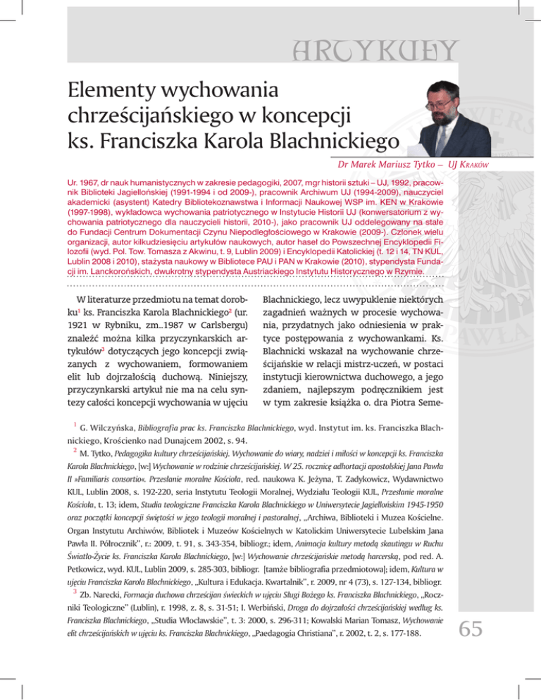 ARTYKUŁY Elementy wychowania chrześcijańskiego w koncepcji ks. Franciszka Karola Blachnickiego Dr Marek Mariusz Tytko – UJ Kraków Ur. 1967, dr nauk humanistycznych w zakresie pedagogiki, 2007, mgr historii sztuki – UJ, 1992, pracownik Biblioteki Jagiellońskiej (1991-1994 i od 2009-), pracownik Archiwum UJ (1994-2009), nauczyciel akademicki (asystent) Katedry Bibliotekoznawstwa i Informacji Naukowej WSP im. KEN w Krakowie (1997-1998), wykładowca wychowania patriotycznego w Instytucie Historii UJ (konwersatorium z wychowania patriotycznego dla nauczycieli historii, 2010-), jako pracownik UJ oddelegowany na stałe do Fundacji Centrum Dokumentacji Czynu Niepodległościowego w Krakowie (2009-). Członek wielu organizacji, autor kilkudziesięciu artykułów naukowych, autor haseł do Powszechnej Encyklopedii Filozofii (wyd. Pol. Tow. Tomasza z Akwinu, t. 9, Lublin 2009) i Encyklopedii Katolickiej (t. 12 i 14, TN KUL, Lublin 2008 i 2010), stażysta naukowy w Bibliotece PAU i PAN w Krakowie (2010), stypendysta Fundacji im. Lanckorońskich, dwukrotny stypendysta Austriackiego Instytutu Historycznego w Rzymie. W literaturze przedmiotu na temat dorobku1 ks. Franciszka Karola Blachnickiego2 (ur. 1921 w Rybniku, zm..1987 w Carlsbergu) znaleźć można kilka przyczynkarskich artykułów3 dotyczących jego koncepcji związanych z wychowaniem, formowaniem elit lub dojrzałością duchową. Niniejszy, przyczynkarski artykuł nie ma na celu syntezy całości koncepcji wychowania w ujęciu 1 Blachnickiego, lecz uwypuklenie niektórych zagadnień ważnych w procesie wychowania, przydatnych jako odniesienia w praktyce postępowania z wychowankami. Ks. Blachnicki wskazał na wychowanie chrześcijańskie w relacji mistrz-uczeń, w postaci instytucji kierownictwa duchowego, a jego zdaniem, najlepszym podręcznikiem jest w tym zakresie książka o. dra Piotra Seme- G. Wilczyńska, Bibliografia prac ks. Franciszka Blachnickiego, wyd. Instytut im. ks. Franciszka Blach- nickiego, Krościenko nad Dunajcem 2002, s. 94. 2 M. Tytko, Pedagogika kultury chrześcijańskiej. Wychowanie do wiary, nadziei i miłości w koncepcji ks. Franciszka Karola Blachnickiego, [w:] Wychowanie w rodzinie chrześcijańskiej. W 25. rocznicę adhortacji apostolskiej Jana Pawła II »Familiaris consortio«. Przesłanie moralne Kościoła, red. naukowa K. Jeżyna, T. Zadykowicz, Wydawnictwo KUL, Lublin 2008, s. 192-220, seria Instytutu Teologii Moralnej, Wydziału Teologii KUL, Przesłanie moralne Kościoła, t. 13; idem, Studia teologiczne Franciszka Karola Blachnickiego w Uniwersytecie Jagiellońskim 1945-1950 oraz początki koncepcji świętości w jego teologii moralnej i pastoralnej, „Archiwa, Biblioteki i Muzea Kościelne. Organ Instytutu Archiwów, Bibliotek i Muzeów Kościelnych w Katolickim Uniwersytecie Lubelskim Jana Pawła II. Półrocznik”, r.: 2009, t. 91, s. 343-354, bibliogr.; idem, Animacja kultury metodą skautingu w Ruchu Światło-Życie ks. Franciszka Karola Blachnickiego, [w:] Wychowanie chrześcijańskie metodą harcerską, pod red. A. Petkowicz, wyd. KUL, Lublin 2009, s. 285-303, bibliogr. [tamże bibliografia przedmiotowa]; idem, Kultura w ujęciu Franciszka Karola Blachnickiego, „Kultura i Edukacja. Kwartalnik”, r. 2009, nr 4 (73), s. 127-134, bibliogr. 3 Zb. Narecki, Formacja duchowa chrześcijan świeckich w ujęciu Sługi Bożego ks. Franciszka Blachnickiego, „Rocz- niki Teologiczne” (Lublin), r. 1998, z. 8, s. 31-51; I. Werbiński, Droga do dojrzałości chrześcijańskiej według ks. Franciszka Blachnickiego, „Studia Włocławskie”, t. 3: 2000, s. 296-311; Kowalski Marian Tomasz, Wychowanie elit chrześcijańskich w ujęciu ks. Franciszka Blachnickiego, „Paedagogia Christiana”, r. 2002, t. 2, s. 177-188. 65 ARTICLES nenki CR pt. Życie duchowe (wyd. pol. Lwów 1931, wyd. ang. Interior Life, Rzym 1969)4. O. Piotr Semenenko, doktor teologii, obok prof. Bogdana Jańskiego i o. dra Hieronima Kajsiewicza CR, był jednym z trzech Ojców-Założycieli Zmartwychwstańców. Zmartwychwstańcze koncepcje mistrzowsko-uczniowskich relacji duchowych zainspirowały Blachnickiego. Szczególnym obszarem jego zainteresowań było formowanie elity chrześcijańskiej dzięki liturgii, bo liturgia sama w sobie pełni funkcję wychowawczą w Kościele: „Nigdy nie można inaczej formować w ogóle jakiejkolwiek elity chrześcijańskiej, jak tylko wokół liturgii”5. Użył terminu ‘wychowanie liturgiczne’ na określenie wychowania przez liturgię. Wskazał na wychowawcze aspekty liturgii, na paradoksalną wolność przez posłuszeństwo, jaką daje liturgia uczestnikomwychowankom. Wolność jest istotnym dobrem dla człowieka i realizuje się w relacji z Bogiem dzięki liturgii, skoro „Liturgia jest szkołą wolności, wychowaniem do wolności. Wielu mówi, że liturgia krępuje, ogranicza, takie twierdzenie związane jest z niewłaściwym rozumieniem wolności osoby ludzkiej. Właściwe wychowanie liturgiczne, uczestnictwo w liturgii to jest także wspaniała szkoła wolności osoby ludzkiej, bo wolność i posłuszeństwo to są dwie rzeczy nierozdzielne. Tak jak Chrystus doszedł do pełnego wyzwolenia człowieka przez swoje posłuszeństwo, tak i my w szkole posłuszeństwa uczymy się wolności”6. Autor wyjaśnił, że istotą wychowania przez liturgię jest posłuszeństwo wobec znaków, wszak formowanie człowieka przez liturgię odbywa się dzięki światłu znaków, światłu symbolów, światłu obrzędów. Mamy do czynienia z rodzajem 66 inicjacji, oświeceniem wewnętrznym człowieka dzięki transcendencji, przez czynności zewnętrzne i słowa płynące z zewnątrz do człowieka, niosące dobro. Człowiekuczestnik liturgii, ‘wychowanek liturgiczny’, staje wobec ‘wychowawcy liturgicznego’, czyli celebransa, który przekazuje treść religijną i moralną na drodze werbalnej przez wypowiadane słowa i niewerbalnej przez gesty, czynności i milczenie. Liturgia ma strukturę
