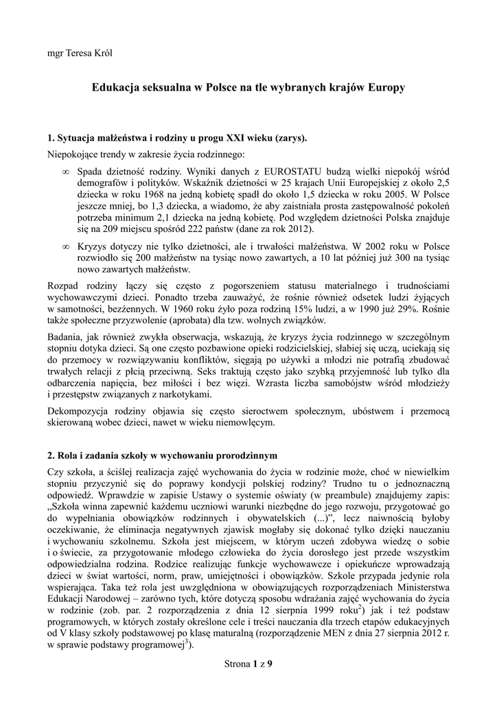 mgr Teresa Król Edukacja seksualna w Polsce na tle wybranych krajów Europy 1. Sytuacja małżeństwa i rodziny u progu XXI wieku (zarys). Niepokojące trendy w zakresie życia rodzinnego: • Spada dzietność rodziny. Wyniki danych z EUROSTATU budzą wielki niepokój wśród demografów i polityków. Wskaźnik dzietności w 25 krajach Unii Europejskiej z około 2,5 dziecka w roku 1968 na jedną kobietę spadł do około 1,5 dziecka w roku 2005. W Polsce jeszcze mniej, bo 1,3 dziecka, a wiadomo, że aby zaistniała prosta zastępowalność pokoleń potrzeba minimum 2,1 dziecka na jedną kobietę. Pod względem dzietności Polska znajduje się na 209 miejscu spośród 222 państw (dane za rok 2012). • Kryzys dotyczy nie tylko dzietności, ale i trwałości małżeństwa. W 2002 roku w Polsce rozwiodło się 200 małżeństw na tysiąc nowo zawartych, a 10 lat później już 300 na tysiąc nowo zawartych małżeństw. Rozpad rodziny łączy się często z pogorszeniem statusu materialnego i trudnościami wychowawczymi dzieci. Ponadto trzeba zauważyć, że rośnie również odsetek ludzi żyjących w samotności, bezżennych. W 1960 roku żyło poza rodziną 15% ludzi, a w 1990 już 29%. Rośnie także społeczne przyzwolenie (aprobata) dla tzw. wolnych związków. Badania, jak również zwykła obserwacja, wskazują, że kryzys życia rodzinnego w szczególnym stopniu dotyka dzieci. Są one często pozbawione opieki rodzicielskiej, słabiej się uczą, uciekają się do przemocy w rozwiązywaniu konfliktów, sięgają po używki a młodzi nie potrafią zbudować trwałych relacji z płcią przeciwną. Seks traktują często jako szybką przyjemność lub tylko dla odbarczenia napięcia, bez miłości i bez więzi. Wzrasta liczba samobójstw wśród młodzieży i przestępstw związanych z narkotykami. Dekompozycja rodziny objawia się często sieroctwem społecznym, ubóstwem i przemocą skierowaną wobec dzieci, nawet w wieku niemowlęcym. 2. Rola i zadania szkoły w wychowaniu prorodzinnym Czy szkoła, a ściślej realizacja zajęć wychowania do życia w rodzinie może, choć w niewielkim stopniu przyczynić się do poprawy kondycji polskiej rodziny? Trudno tu o jednoznaczną odpowiedź. Wprawdzie w zapisie Ustawy o systemie oświaty (w preambule) znajdujemy zapis: „Szkoła winna zapewnić każdemu uczniowi warunki niezbędne do jego rozwoju, przygotować go do wypełniania obowiązków rodzinnych i obywatelskich (...)”, lecz naiwnością byłoby oczekiwanie, że eliminacja negatywnych zjawisk mogłaby się dokonać tylko dzięki nauczaniu i wychowaniu szkolnemu. Szkoła jest miejscem, w którym uczeń zdobywa wiedzę o sobie i o świecie, za przygotowanie młodego człowieka do życia dorosłego jest przede wszystkim odpowiedzialna rodzina. Rodzice realizując funkcje wychowawcze i opiekuńcze wprowadzają dzieci w świat wartości, norm, praw, umiejętności i obowiązków. Szkole przypada jedynie rola wspierająca. Taka też rola jest uwzględniona w obowiązujących rozporządzeniach Ministerstwa Edukacji Narodowej – zarówno tych, które dotyczą sposobu wdrażania zajęć wychowania do życia w rodzinie (zob. par. 2 rozporządzenia z dnia 12 sierpnia 1999 roku2) jak i też podstaw programowych, w których zostały określone cele i treści nauczania dla trzech etapów edukacyjnych od V klasy szkoły podstawowej po klasę maturalną (rozporządzenie MEN z dnia 27 sierpnia 2012 r. w sprawie podstawy programowej3). Strona 1 z 9 Zasadniczym celem wychowania do życia w rodzinie (WdŻ) jest stymulowanie rozwoju zintegrowanej osobowości młodego człowieka, ukazywanie wartości rodziny oraz pomoc w zrozumieniu i akceptacji przemian związanych z okresem dojrzewania. Realizacja przedmiotu WdŻ pomoże uczniom w osiągnięciu dojrzałej postawy wobec siebie i innych, odkryciu i kształtowaniu wartości nadających sens ludzkiemu życiu, jak: miłość, poczucie bezpieczeństwa, odpowiedzialność, a także małżeństwo i rodzina. Przedmiot ten ma szczególne znaczenie w sytuacji szybkich przemian społeczno-kulturowych. Zmienia się również obyczajowość pod wpływem seksualizacji kultury, co wiąże wartość osoby z seksualną atrakcyjnością i jej uprzedmiotowieniem. Łatwy dostęp do treści erotycznych i pornograficznych, szczególnie poprzez Internet, potęguje skalę tego zjawiska. Lansuje się kult ciała oraz wizję seksu bez miłości i odpowiedzialności za dokonywane wybory. Według „Raportu o seksualizacji dziewcząt” sporządzonego przez Amerykańskie Towarzystwo Psychologiczne (2007 rok) poważne konsekwencje zjawiska dotyczą sfery poznawczej (pogorszenie logicznego myślenia i sprawności umysłowej), emocjonalnej (nieakceptacja własnego ciała, brak pewności siebie), psychicznej (zaburzenia odżywiania, niska samoocena, depresja), seksualnej (brak asertywności, nierealistyczne oczekiwania wobec sfery seksualnej), a także związane z kształtowaniem tożsamości (traktowanie fizycznej atrakcyjności jako centralnej wartości u kobiety). Naukowcy podkreślają, że ważnymi czynnikami chroniącymi młodzież przed wczesną inicjacją seksualną, prostytucją dziewcząt i chłopców oraz uzależnieniami są silne więzi emocjonalne z rodziną, zainteresowanie nauką, poszanowanie norm i wartości, przynależność do pozytywnej grupy oraz praktyki religijne. Zatem istnieje potrzeba wychowania szkolnego i prorodzinnego dla budowania postaw kreujących odpowiedzialne przeżywanie własnej seksualności. Istotnym elementem dojrzałej osobowości jest odkrywanie stopniowo rodzącej się świadomości seksualnej i potraktowanie jej jako zadania życiowego tak, aby płciowość stanowiła integralną część ludzkich potrzeb, pragnień i dążeń. Osiągnięcie na tej drodze dojrzałości sprawia, że seksualność stanie się językiem miłości oraz miejscem odpowiedzialnego przekazywania życia. Budowane wówczas związki małżeńskie stają się pod