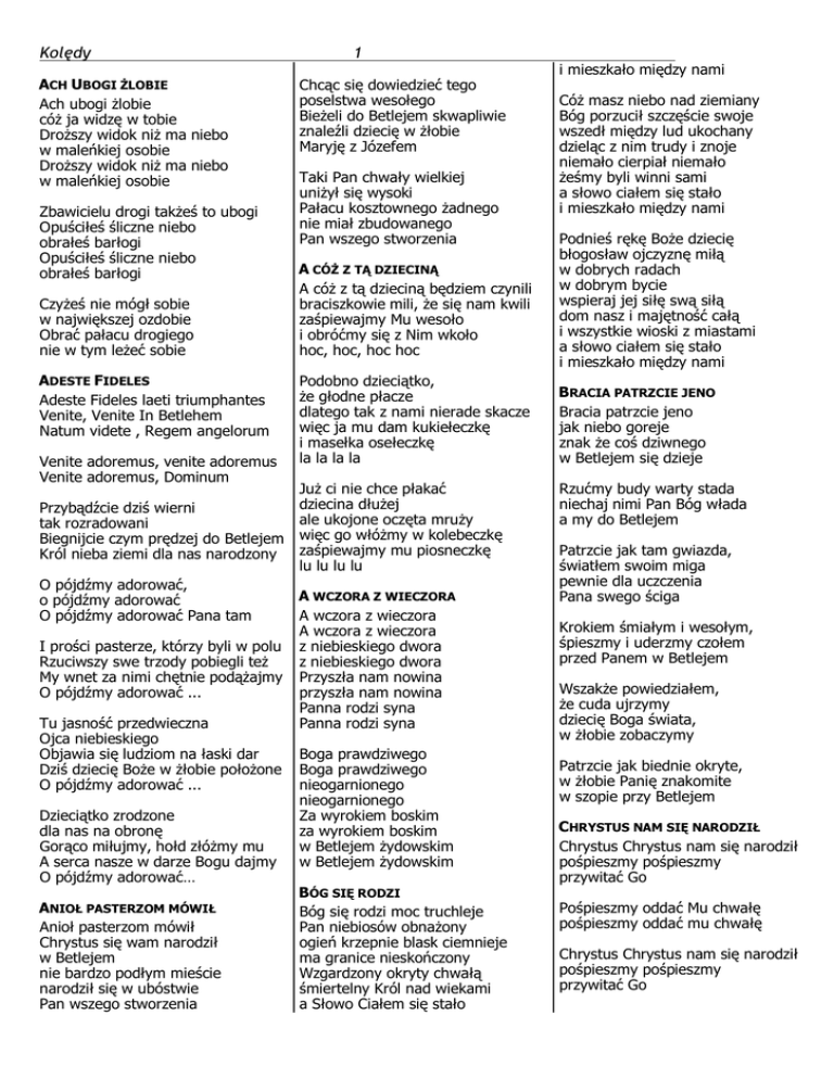 Kolędy ACH UBOGI ŻLOBIE Ach ubogi żlobie cóż ja widzę w tobie Droższy widok niż ma niebo w maleńkiej osobie Droższy widok niż ma niebo w maleńkiej osobie Zbawicielu drogi takżeś to ubogi Opuściłeś śliczne niebo obrałeś barłogi Opuściłeś śliczne niebo obrałeś barłogi Czyżeś nie mógł sobie w największej ozdobie Obrać pałacu drogiego nie w tym leżeć sobie ADESTE FIDELES Adeste Fideles laeti triumphantes Venite, Venite In Betlehem Natum videte , Regem angelorum Venite adoremus, venite adoremus Venite adoremus, Dominum 1 Chcąc się dowiedzieć tego poselstwa wesołego Bieżeli do Betlejem skwapliwie znaleźli dziecię w żłobie Maryję z Józefem Taki Pan chwały wielkiej uniżył się wysoki Pałacu kosztownego żadnego nie miał zbudowanego Pan wszego stworzenia A CÓŻ Z TĄ DZIECINĄ A cóż z tą dzieciną będziem czynili braciszkowie mili, że się nam kwili zaśpiewajmy Mu wesoło i obróćmy się z Nim wkoło hoc, hoc, hoc hoc Podobno dzieciątko, że głodne płacze dlatego tak z nami nierade skacze więc ja mu dam kukiełeczkę i masełka osełeczkę la la la la Już ci nie chce płakać dziecina dłużej Przybądźcie dziś wierni ale ukojone oczęta mruży tak rozradowani więc go włóżmy w kolebeczkę Biegnijcie czym prędzej do Betlejem zaśpiewajmy mu piosneczkę Król nieba ziemi dla nas narodzony lu lu lu lu O pójdźmy adorować, A WCZORA Z WIECZORA o pójdźmy adorować O pójdźmy adorować Pana tam A wczora z wieczora A wczora z wieczora I prości pasterze, którzy byli w polu z niebieskiego dwora Rzuciwszy swe trzody pobiegli też z niebieskiego dwora My wnet za nimi chętnie podążajmy Przyszła nam nowina O pójdźmy adorować ... przyszła nam nowina Panna rodzi syna Tu jasność przedwieczna Panna rodzi syna Ojca niebieskiego Objawia się ludziom na łaski dar Boga prawdziwego Dziś dziecię Boże w żłobie położone Boga prawdziwego O pójdźmy adorować ... nieogarnionego nieogarnionego Dzieciątko zrodzone Za wyrokiem boskim dla nas na obronę za wyrokiem boskim Gorąco miłujmy, hołd złóżmy mu w Betlejem żydowskim A serca nasze w darze Bogu dajmy w Betlejem żydowskim O pójdźmy adorować… BÓG SIĘ RODZI ANIOŁ PASTERZOM MÓWIŁ Bóg się rodzi moc truchleje Anioł pasterzom mówił Pan niebiosów obnażony Chrystus się wam narodził ogień krzepnie blask ciemnieje w Betlejem ma granice nieskończony nie bardzo podłym mieście Wzgardzony okryty chwałą narodził się w ubóstwie śmiertelny Król nad wiekami Pan wszego stworzenia a Słowo Ciałem się stało i mieszkało między nami Cóż masz niebo nad ziemiany Bóg porzucił szczęście swoje wszedł między lud ukochany dzieląc z nim trudy i znoje niemało cierpiał niemało żeśmy byli winni sami a słowo ciałem się stało i mieszkało między nami Podnieś rękę Boże dziecię błogosław ojczyznę miłą w dobrych radach w dobrym bycie wspieraj jej siłę swą siłą dom nasz i majętność całą i wszystkie wioski z miastami a słowo ciałem się stało i mieszkało między nami BRACIA PATRZCIE JENO Bracia patrzcie jeno jak niebo goreje znak że coś dziwnego w Betlejem się dzieje Rzućmy budy warty stada niechaj nimi Pan Bóg włada a my do Betlejem Patrzcie jak tam gwiazda, światłem swoim miga pewnie dla uczczenia Pana swego ściga Krokiem śmiałym i wesołym, śpieszmy i uderzmy czołem przed Panem w Betlejem Wszakże powiedziałem, że cuda ujrzymy dziecię Boga świata, w żłobie zobaczymy Patrzcie jak biednie okryte, w żłobie Panię znakomite w szopie przy Betlejem CHRYSTUS NAM SIĘ NARODZIŁ Chrystus Chrystus nam się narodził pośpieszmy pośpieszmy przywitać Go Pośpieszmy oddać Mu chwałę pośpieszmy oddać mu chwałę Chrystus Chrystus nam się narodził pośpieszmy pośpieszmy przywitać Go Kolędy CICHA NOC Cicha noc, święta noc pokój niesie ludziom wszem a u żłóbka matka święta czuwa sama uśmiechnięta nad dzieciątka snem Cicha noc, święta noc pastuszkowie od swych trzód biegną wielce zadziwieni za anielskich głosem pieni gdzie się spełnił cud Cicha noc, święta noc narodzony Boży syn Pan wielkiego majestatu niesie dziś całemu światu odkupienie win CÓŻ TO ZA DZIECIĘ Cóż to za dziecię w żłóbku śpi Przy boku Maryi Panny Dla kogóż to radośnie brzmi anielskich głosów hymn Pan nasz to Jezus, Król zbawiciel z dawna czekany śpieszmy się pokłonić Mu królowi, co nam zesłany Dlaczegóż Panie w stajence śpisz gdy my z sercami czekamy byś w nich zamieszkał na zawsze już nie zwlekaj, przyjdź, Cię błagamy Miast oddać mu wdzięczności dług kadzidło, złoto, mirrę Królowi dary w ofierze złóż siebie, rodzinę, ojczyznę DO SZOPY HEJ PASTERZE Do szopy hej pasterze do szopy bo tam Bóg Syn Boży w żłobie leży by zbawić ludzki ród śpiewajcie Aniołowie, pasterze grajcie mu kłaniajcie się królowie nie budźcie go ze snu Padnijmy na kolana to dziecię to nasz Bóg uczcijmy niebios Pana miłości złóżmy dług DZISIAJ W BETLEJEM Dzisiaj w Betlejem 2 dzisiaj w Betlejem wesoła nowina Bo panna czysta, Bo Panna czysta porodziła Syna Chrystus się rodzi nas oswobodzi Anieli grają króle witają pasterze śpiewają bydlęta klękają cuda cuda ogłaszają Maryja Panna, Maryja Panna Dzieciątko piastuje I Józef święty, i Józef święty ono pielęgnuje GDY SIĘ CHRYSTUS RODZI Gdy się Chrystus rodzi i na świat przychodzi ciemna noc w jasności promienistej brodzi aniołowie się radują pod niebiosa wyśpiewują Gloria, gloria gloria in excelsis Deo Mówią do pasterzy, którzy trzód swych strzegli aby do Betlejem Czem prędzej pobiegli bo się narodził zbawiciel wszego świata odkupiciel O niebieskie duchy i posłowie nieba powiedzcież wyraźniej, co nam czynić trzeba bo my nic nie pojmujemy ledwie od strachu żyjemy Idźcie do Betlejem gdzie dziecię złożone w pieluszki spowite w żłobie położone oddajcie mu pokłon Boski on osłodzi wasze troski GDY ŚLICZNA