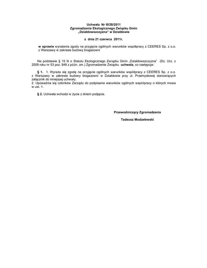 Uchwała Nr III/28/2011 Zgromadzenia Ekologicznego Związku Gmin „Działdowszczyzna” w Działdowie z dnia 21 czerwca 2011r. w sprawie wyrażenia zgody na przyjęcie ogólnych warunków współpracy z CEERES Sp. z o.o. z Warszawy w zakresie budowy biogazowni Na podstawie § 15 lit o Statutu Ekologicznego Zwi ązku Gmin „Działdowszczyzna” (Dz. Urz. z 2009 roku nr 53 poz. 849 z późn. zm.) Zgromadzenie Związku uchwala, co następuje: § 1. 1. Wyraża się zgodę na przyjęcie ogólnych warunków współpracy z CEERES Sp. z o.o. z Warszawy w zakresie budowy biogazowni w Działdowie przy ul. Przemysłowej stanowiących załącznik do niniejszej uchwały. 2. Upoważnia się członków Zarządu do podpisania warunków ogólnych wspó łpracy o których mowa w ust. 1. § 2. Uchwała wchodzi w życie z dniem podjęcia. Przewodniczący Zgromadzenia Tadeusz Modzelewski Załącznik do Uchwały nr III/28/2011 Zgromadzenia Ekologicznego Związku Gmin „Działdowszczyzna” w Działdowie z dnia 21 czerwca 2011r. ` WARUNKI OGÓLNE WSPÓŁPRACY zostały zawarte dnia _____ maja 2011 roku przez: 1. CEERES Spółka z ograniczoną odpowiedzialnością, będąca podatnikiem VAT czynnym, NIP 1070015786, REGON 142305175 z siedzib ą przy ul. Wybrzeże Kościuszkowskie 43/2, 00-347 Warszawa, Polska, wpisana do Rejestru Przedsi ębiorców Krajowego Rejestru Sądowego przez Sąd Rejonowy dla miasta stołecznego Warszawy, XII Wydział Gospodarczy Krajowego Rejestru Sądowego pod numerem KRS 349315, reprezentowana przez: Randy Michael Mott - Prezesa Zarządu, (zwana dalej “CEERES”) 2. Ekologiczny Związek Gmin “Działdowszczyzna” NIP 5711474249, REGON 130350452 z siedzib ą przy ul. Księżodworskiej 10/24, 13-200 Działdowo, reprezentowane przez: 1) Przewodniczącego Zarządu „Działdowszczyzna” – Kazimierza Kordeckiego 2) Członka Zarządu “Działdowszczyzna” – Pawła Cieślińskiego (dalej „Działdowszczyzna”) 3. Gmina Miasto Działdowo, NIP 1070015786, REGON 142305175 z siedzib ą przy ul. Zamkowej 12, 13-200 Działdowo, reprezentowane przez: Burmistrza Miasta Działdowo – Bronisława Mazurkiewicza (dalej „miasto Działdowo”) Zwane dalej łącznie „Stronami” WSTĘP CEERES powoła nową spółkę celową dedykowaną pod budowę i eksploatację biogazowni o mocy zainstalowanej przekraczaj ącej 1 MWel zlokalizowanej w mieście Działdowo (zwaną dalej „Spółką”). DZIAŁDOWSZCZYZNA będzie partnerem powyższej inwestycji. W ciągu najbliższych 60 dni Strony podpiszą Umowę o współpracy regulującą zakres współpracy pomiędzy Stronami. Podstawowe warunki przyszłej Umowy o współpracy zostały uzgodnione i przedstawione poni żej. Dalsza Umowa o współpracy będzie zawierać Załączniki w postaci Umowy na dostawę substratów i Umowy przeniesienia własności działki. Obie wyżej wymienione umowy zostaną uzgodnione i podpisane w ciągu następnych 90 dni. 1. UDZIAŁOWCY A. Spółka posiada wymagany minimalny kapitał zakładowy. Wszystkie udziały będą początkowo własnością CEERES. DZIAŁDOWSZCZYZNA może zdecydować się na nabycie 10% udziałów spółki od CEERES w zamian za dzierżawę nieruchomości gruntowej przez okres dziesięciu lat wraz z możliwością późniejszego jej zakupu. Je śli DZIAŁDOWSZCZYZNA wybierze możliwość wydzierżawienia nieruchomości gruntowej w zamian za nabycie udziałów spółki, wartość dzierżawy gruntu będzie skorygowana o wartość wyceny 10% udziałów spółki. Saldo dostosowanej wartości udziałów spółki będzie zapewniona w gotówce przez CEERES oraz jego inwestorów. B. Przed rozpoczęciem realizacji projektu CEERES odsprzeda firmie EDF Energies Nouvelles SA (dalej zwana “EDF EN”) większościowy pakiet udziałów w Spółce. C. Strony zawrą umowę na dzierżawę i przekazanie nieruchomości gruntowej na warunkach określonych poniżej, w ciągu 90 dni od podpisania niniejszej umowy. D. Miasto Działdowo posiadając 100% udziałów w Przedsiębiorstwie Ciepłowniczym sp. z o.o. w Działdowie zobowiązuje się do organizacji rozmów o wzajemnej współpracy między tym przedsiębiorstwem a CEERES. 2. PRZENIESIENIE WŁASNOŚCI DZIAŁKI A. DZIAŁDOWSZCZYZNA zgadza się wydzierżawić Spółce nieruchomość gruntową o powierzchni 1,5 hektara na okres 10 lat wraz z możliwością późniejszego jej zakupu dla której prowadzona jest księga wieczysta o numerze 3711/11 (dalej ”grunt”). W przypadku gdy DZIAŁDOWSZCZYZNA wybierze możliwość nabycia 10% udziałów Spółki, strony niniejszym postanawiaj ą, że DZIAŁDOWSZCZYZNA wydzierżawi Spółce grunt na okres dziesięciu lat wraz z możliwością późniejszego zakupu po stawce rocznego czynszu dzierżawnego i cenie gruntu ni ższej od wartości rynkowej. Wycena wartości gruntu oraz rocznego czynszu dzierżawnego zostanie sporządzona przez licencjonowanego rzeczoznawcę majątkowego a otrzymane wartości zostaną pomniejszona o równowartość nabytych 10% udziałów spółki przez DZIAŁDOWSZCZYZNE. Roczny czynsz dzierżawny wraz z wyceną gruntu zostaną ustalona w ciągu 2 tygodni od otrzymania przez DZIAŁDOWSZCZYZNE sporządzonej wyceny gruntu przez licencjonowanego rzeczoznawcę majątkowego. CEERES wraz z inwestorami zapewnią dodatkowe 90% wpłaconego kapitału w gotówce, wyliczonego proporcjonalnie na podstawie warto ści gruntu przypisanej 10% udziałów spółki. Powyższe kwoty wpłaconego kapitału zostaną zapewnione przez CEERES i inwestorów jako pożyczka do Spółki w celu zapewnienia wystarczających środków finansowych do realizacji projektu. B. W przypadku gdy DZIAŁDOWSZCZYZNA nie zdecyduje się nabyć udziałów Spółki, w sposób wspomniany powyżej, grunt dzierżawiony będzie przez Spółkę na warunkach rynkowych i zasadach mających zastosowanie do tego typu transakcji przez okres dziesi ęciu lat z możliwością pierwokupu. 3. FINANSOWANIE A. Zakłada się, że transakcja zostanie zakończona przez