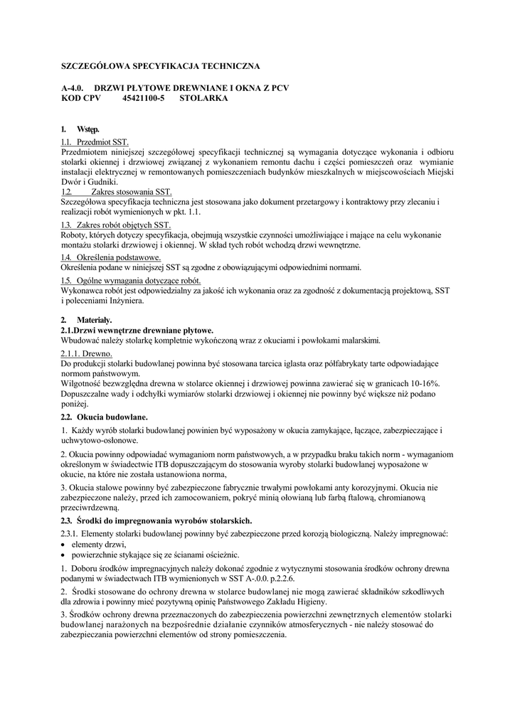 SZCZEGÓŁOWA SPECYFIKACJA TECHNICZNA A-4.0. DRZWI PŁYTOWE DREWNIANE I OKNA Z PCV KOD CPV 45421100-5 STOLARKA 1. Wstęp. 1.1. Przedmiot SST. Przedmiotem niniejszej szczegółowej specyfikacji technicznej są wymagania dotyczące wykonania i odbioru stolarki okiennej i drzwiowej związanej z wykonaniem remontu dachu i części pomieszczeń oraz wymianie instalacji elektrycznej w remontowanych pomieszczeniach budynków mieszkalnych w miejscowościach Miejski Dwór i Gudniki. 1.2. Zakres stosowania SST. Szczegółowa specyfikacja techniczna jest stosowana jako dokument przetargowy i kontraktowy przy zlecaniu i realizacji robót wymienionych w pkt. 1.1. 1.3. Zakres robót objętych SST. Roboty, których dotyczy specyfikacja, obejmują wszystkie czynności umożliwiające i mające na celu wykonanie montażu stolarki drzwiowej i okiennej. W skład tych robót wchodzą drzwi wewnętrzne. 1.4. Określenia podstawowe. Określenia podane w niniejszej SST są zgodne z obowiązującymi odpowiednimi normami. 1.5. Ogólne wymagania dotyczące robót. Wykonawca robót jest odpowiedzialny za jakość ich wykonania oraz za zgodność z dokumentacją projektową, SST i poleceniami Inżyniera. 2. Materiały. 2.1.Drzwi wewnętrzne drewniane płytowe. Wbudować należy stolarkę kompletnie wykończoną wraz z okuciami i powłokami malarskimi. 2.1.1. Drewno. Do produkcji stolarki budowlanej powinna być stosowana tarcica iglasta oraz półfabrykaty tarte odpowiadające normom państwowym. Wilgotność bezwzględna drewna w stolarce okiennej i drzwiowej powinna zawierać się w granicach 10-16%. Dopuszczalne wady i odchyłki wymiarów stolarki drzwiowej i okiennej nie powinny być większe niż podano poniżej. 2.2. Okucia budowlane. 1. Każdy wyrób stolarki budowlanej powinien być wyposażony w okucia zamykające, łączące, zabezpieczające i uchwytowo-osłonowe. 2. Okucia powinny odpowiadać wymaganiom norm państwowych, a w przypadku braku takich norm - wymaganiom określonym w świadectwie ITB dopuszczającym do stosowania wyroby stolarki budowlanej wyposażone w okucie, na które nie została ustanowiona norma, 3. Okucia stalowe powinny być zabezpieczone fabrycznie trwałymi powłokami anty korozyjnymi. Okucia nie zabezpieczone należy, przed ich zamocowaniem, pokryć minią ołowianą lub farbą ftalową, chromianową przeciwrdzewną. 2.3. Środki do impregnowania wyrobów stolarskich. 2.3.1. Elementy stolarki budowlanej powinny być zabezpieczone przed korozją biologiczną. Należy impregnować: • elementy drzwi, • powierzchnie stykające się ze ścianami ościeżnic. 1. Doboru środków impregnacyjnych należy dokonać zgodnie z wytycznymi stosowania środków ochrony drewna podanymi w świadectwach ITB wymienionych w SST A-.0.0. p.2.2.6. 2. Środki stosowane do ochrony drewna w stolarce budowlanej nie mogą zawierać składników szkodliwych dla zdrowia i powinny mieć pozytywną opinię Państwowego Zakładu Higieny. 3. Środków ochrony drewna przeznaczonych do zabezpieczenia powierzchni zewnętrznych elementów stolarki budowlanej narażonych na bezpośrednie działanie czynników atmosferycznych - nie należy stosować do zabezpieczania powierzchni elementów od strony pomieszczenia. 4. Środków ochrony drewna przeznaczonych do zabezpieczenia powierzchni zewnętrznych elementów stolarki budowlanej narażonych na bezpośrednie działanie czynników atmosferycznych - nie należy stosować do zabezpieczania powierzchni elementów od strony pomieszczenia. 2.4. Środki do gruntowania wyrobów stolarskich. 1. Do gruntowania wyrobów stolarki budowlanej należy stosować pokost naturalny lub syntetyczny oraz bioodporne farby do gruntowania. 2. Jeżeli na budowę dostarczona jest stolarka gruntowana, należy podać rodzaj środka użytego do gruntowania. 2.5. Farby i lakiery do malowania stolarki budowlanej. Do malowania wyrobów stolarki budowlanej należy stosować: • do elementów konfekcjonowanych należy stosować zestaw farb chemoutwardzalnych szybkoschnących wg. BN-71/6113-46 • do elementów pozostałych farby ftalowe podkładowe wg PN-C-81901/2002, oraz farby ftalowe ogólnego stosowania wg. BN-79/6115-44 lub emalie olejno-żywiczne i ftalowe ogólnego stosowania wg. BN-76/6115-38. 2.6. Szkło • Do szklenia należy stosować szkło płaskie walcowane wg. PN-78/B-13050. • Szklenie drzwi i okien wydzielenia pożarowego szkłem przeciwpożarowym 2.7. Okna z PCV -gotowe elementy do wmontowania wg. instrukcji producenta Okucia umożliwiające otwieranie okien z poziomu posadzki 2.8. Składowanie elementów Wszystkie wyroby należy przechowywać w magazynach zamkniętych, suchych i przewiewnych, zabezpieczonych przed opadami atmosferycznymi. Podłogi w pomieszczeniu magazynowym powinny być utwardzone, poziome i równe. Wyroby należy układać w jednej lub kilku warstwach w odległości nie mniejszej niż 1 m od czynnych urządzeń grzejnych i zabezpieczyć przed uszkodzeniem. 3. Sprzęt. Roboty można wykonać przy użyciu dowolnego typu sprzętu zaakceptowanego przez Inżyniera. 4. Transport. Każda partia wyrobów przewidziana do wysyłki powinna zawierać wszystkie elementy przewidziane normą lub projektem indywidualnym. Okucia nie zamontowane do wyrobu przechowywać i transportować w odrębnych opakowaniach. Elementy do transportu należy zabezpieczyć przed uszkodzeniem przez odpowiednie opakowanie. Zabezpieczone przed uszkodzeniem elementy przewozić w miarę możliwości przy użyciu palet lub jednostek kontenerowych. Elementy mogą być przewożone dowolnymi środkami transportu zaakceptowanymi przez Inżyniera, oraz zabezpieczone przed uszkodzeniami, przesunięciem lub utratą stateczności. Sposób składowania wg punktu 2.8. 5. Wykonanie robót. 5.1. Przygotowanie ościeży. 1. Przed osadzeniem drzwi należy sprawdzić dokładność wykonania ościeża, do którego ma przylegać ościeżnica. W przypadku występujących wad w wykonaniu ościeża lub zabrudzenia pow