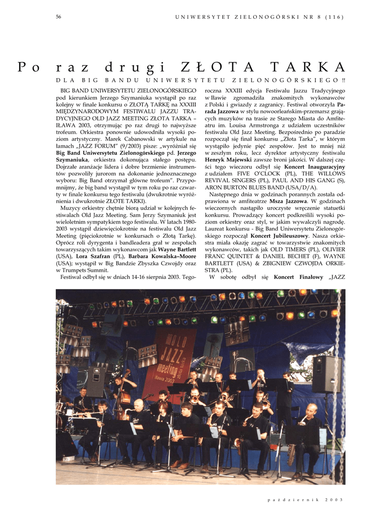 56 P o UNIWERSYTET r a z d r u g i D L A B A N D U B I G ZIELONOGÓRSKI Z Ł O T A U N I W E R S Y T E T U BIG BAND UNIWERSYTETU ZIELONOGÓRSKIEGO pod kierunkiem Jerzego Szymaniuka wystąpił po raz kolejny w finale konkursu o ZŁOTĄ TARKĘ na XXXIII MIĘDZYNARODOWYM FESTIWALU JAZZU TRADYCYJNEGO OLD JAZZ MEETING ZŁOTA TARKA – IŁAWA 2003, otrzymując po raz drugi to najwyższe trofeum. Orkiestra ponownie udowodniła wysoki poziom artystyczny. Marek Cabanowski w artykule na łamach „JAZZ FORUM” (9/2003) pisze: „wyróżniał się Big Band Uniwersytetu Zielonogórskiego pd. Jerzego Szymaniuka, orkiestra dokonująca stałego postępu. Dojrzałe aranżacje lidera i dobre brzmienie instrumentów pozwoliły jurorom na dokonanie jednoznacznego wyboru: Big Band otrzymał główne trofeum”. Przypomnijmy, że big band wystąpił w tym roku po raz czwarty w finale konkursu tego festiwalu (dwukrotnie wyróżnienia i dwukrotnie ZŁOTE TARKI). Muzycy orkiestry chętnie biorą udział w kolejnych festiwalach Old Jazz Meeting. Sam Jerzy Szymaniuk jest wieloletnim sympatykiem tego festiwalu. W latach 19802003 wystąpił dziewięciokrotnie na festiwalu Old Jazz Meeting (pięciokrotnie w konkursach o Złotą Tarkę). Oprócz roli dyrygenta i bandleadera grał w zespołach towarzyszących takim wykonawcom jak Wayne Bartlett (USA), Lora Szafran (PL), Barbara Kowalska–Moore (USA); wystąpił w Big Bandzie Zbyszka Czwojdy oraz w Trumpets Summit. Festiwal odbył się w dniach 14-16 sierpnia 2003. Tego- NR 8 (116) T A R K A Z I E L O N O G Ó R S K I E G O !! roczna XXXIII edycja Festiwalu Jazzu Tradycyjnego w Iławie zgromadziła znakomitych wykonawców z Polski i gwiazdy z zagranicy. Festiwal otworzyła Parada Jazzowa w stylu nowoorleańskim-przemarsz grających muzyków na trasie ze Starego Miasta do Amfiteatru im. Louisa Armstronga z udziałem uczestników festiwalu Old Jazz Meeting. Bezpośrednio po paradzie rozpoczął się finał konkursu „Złota Tarka”, w którym wystąpiło jedynie pięć zespołów. Jest to mniej niż w zeszłym roku, lecz dyrektor artystyczny festiwalu Henryk Majewski zawsze broni jakości. W dalszej części tego wieczoru odbył się Koncert Inauguracyjny z udziałem FIVE O’CLOCK (PL), THE WILLOWS REVIVAL SINGERS (PL), PAUL AND HIS GANG (S), ARON BURTON BLUES BAND (USA/D/A). Następnego dnia w godzinach porannych została odprawiona w amfiteatrze Msza Jazzowa. W godzinach wieczornych nastąpiło uroczyste wręczenie statuetki konkursu. Prowadzący koncert podkreślili wysoki poziom orkiestry oraz styl, w jakim wywalczyli nagrodę. Laureat konkursu - Big Band Uniwersytetu Zielonogórskiego rozpoczął Koncert Jubileuszowy. Nasza orkiestra miała okazję zagrać w towarzystwie znakomitych wykonawców, takich jak OLD TIMERS (PL), OLIVIER FRANC QUINTET & DANIEL BECHET (F), WAYNE BARTLETT (USA) & ZBIGNIEW CZWOJDA ORKIESTRA (PL). W sobotę odbył się Koncert Finałowy „JAZZ p a ź d z i e r n i k 2 0 0 3 UNIWERSYTET ZIELONOGÓRSKI NR 8 (116) 57 W SMOKINGACH - TRIBUTE TO COUNT BASIE” z udziałem Ewy Bem, Hanny Banaszak, Lory Szafran, Krzysztofa Kiljańskiego (wokalisty na stałe współpracującego z Big Bandem Uniwersytetu Zielonogórskiego). Wokalistom towarzyszył ALL STARS BIG BAND, złożony z wybitnych instrumentalistów, pod dyrekcją Jana Ptaszyna Wróblewskiego. W tym samym koncercie wystąpili jeszcze DIXIE COMPANY (PL) oraz BRIAN CARRICK’S & HIS HERITAGE HALL STOMPERS (GB). Po codziennych koncertach w późnych godzinach nocnych trwały jam sessions. Obok głównego programu odbywały się koncerty towarzyszące, Bal Jazzowy. Od redakcji Studium Muzyki Jazzowej. W swojej karierze współpracował, koncertował, nagrywał z większością gwiazd polskiej sceny jazzowej oraz z muzykami z zagranicy. W grudniu 1998 r. na bazie Studium Muzyki Jazzowej, prowadzonego przez pianistę, kompozytora i aranżera Jerzego Szymaniuka powstała kolejna orkiestra, która od 2002 roku jest Big Bandem Uniwersytetu Zielonogórskiego. Od samego początku zespół postawił sobie dość wysokie poprzeczki. Wzorem do naśladowania dla big bandu są orkiestry, takie jak np. Count Basie Orchestra, Thad Jones Orchestra. Oparcie się na najlepszych wzorach artykulacji, swingowania i innych elementów muzyki jazzowej jest gwarancją osiągnięcia dobrego poziomu wykonawczego. Granie w big bandzie stawia przed muzykiem spore wymagania. Trudność, czy specyfika polega na tym, że poza dobrym opanowaniem gry na instrumencie muzyk powinien posiadać predyspozycje do improwizacji i swingowania. Dalej pozostaje już tylko praca. Na repertuar big bandu składają się aranżacje znanych standardów jazzowych, aranżacje i kompozycje znanych mistrzów, takich jak Sammy Nestico, Thad Jones, Bob Mintzer, Lennie Niehaus a także kompozycje i aranżacje Jerzego Szymaniuka. Stylistyka programu big bandu jest dość szeroka, bo sięga od klasyki z okresu swing do utworów w stylu soul, funky. Na potwierdzenie zdobycia popularności oraz przebojowego przejścia przez kolejne festiwale odbywające się w Polsce przedstawiamy Państwu fakty z wydarzeń artystycznych Big Bandu Uniwersytetu Zielonogórskiego. W swojej pięcioletniej działalności artystycznej orkiestra przebojowo zaistniała nie tylko w środowisku zielonogórskim, ale głośno o niej w Polsce. Członkowie big bandu to muzycy bardzo zdeklarowani na pracę w zespole. Mimo dużej ilości swoich zajęć wiele czasu poświęcają na pracę w orkiestrze. Część muzyków zaszczepiona miłością do jazzu właśnie w big bandzie, kontynuuje dalszą swoją edukację na wydziałach jazzowych w Polsce i za granicą. To ich pasja umiejętnie rozwijana i kierowana przez lidera Jerzego Szymaniuka pozwala na kształtowanie młodych talentów, na uzyskanie tak wysokiego poziomu zespołu. BIG BAND UNIWERSYTETU ZIELONOGÓRSKIEGO to orkiestra już utytułowana, która ma na swoim koncie sporo nagród na ważnych festiwalach. Zespół zdobył uznan