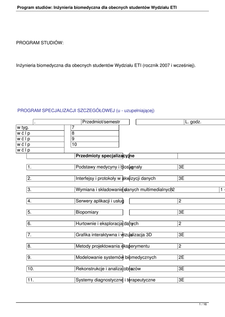 Program studiów: Inżynieria biomedyczna dla obecnych studentów Wydziału ETI PROGRAM STUDIÓW: Inżynieria biomedyczna dla obecnych studentów Wydziału ETI (rocznik 2007 i wcześniej). PROGRAM SPECJALIZACJI SZCZEGÓŁOWEJ (u - uzupełniającej) w tyg. wćlp wćlp wćlp wćlp . 7 8 9 10 Przedmiot/semestr L. godz. Przedmioty specjalizacyjne 1. Podstawy medycyny i biosygnały u 3E 2. Interfejsy i protokoły w akwizycji danych 3E 3. Wymiana i składowanie udanych multimedialnych2 4. Serwery aplikacji i usług 2 5. Biopomiary 3E 6. Hurtownie i eksploracja danych u 2 7. Grafika interaktywna i wizualizacja u 3D 3E 8. Metody projektowania eksperymentu 2 9. Modelowanie systemów biomedycznych 2E 10. Rekonstrukcje i analiza obrazów u 3E 11. Systemy diagnostyczne i terapeutyczne 3E 1- 1 / 16 Program studiów: Inżynieria biomedyczna dla obecnych studentów Wydziału ETI 12. Telemedycyna u 3 13. Wykład monograficzny 1 Razem przedmioty specjalnościowe Projekt grupowy Seminarium dyplomowe 2 Razem Konsultacje dyplomowe 42 26 techniczna32 8 E - egzamin Podstawy medycyny i biosygnałów Kierunek: Elektronika i telekomunikacja Autor: Jerzy Wtorek Lp. Zagadnienie wiedzy A B C 1. D E Poziom Liczba godzin umiejętności Medycyna pojęcia podstawowe X 2. Organizm jako źródło informacji X strukturalnej i funkcjonalnej 3. Organizm jako zbiór układów: X komórka, tkanka, organ 4. Właściwości komórki: budowa, X rozwój, modyfikacje 5. Informacja genetyczna 6. Komórka jako źródło sygnałów X 7. Rodzaje i właściwości tkanek X 8. Opis parametryczny właściwości tkanek X 9. Budowa i rola serca 10. Opis parametryczny właściwości X serca X X 2 / 16 Program studiów: Inżynieria biomedyczna dla obecnych studentów Wydziału ETI 11. EKG - źródło informacji o sercu i jego stanie X 12. Stymulacja serca: zewnętrzne i implantowane stymulatory X 13. Sztuczne serce X 14. Układ krążenia X 15. Przepływ, ciśnienia, parametry naczyń X 16. Układ oddechowy X 17. Układ nerwowy X 18. Budowa komórek nerwowych X i mózgu 19. Ocena aktywności mózgu, EEG X i techniki obrazowe 20. Mapa kory mózgowej: kora Xwzrokowa, słuchowa, itp 21. Umysł jako funkcja mózgu, X obiektywizacja badań 22. Zmysł wzroku: mechanizm X widzenia 23. Protezy wzroku: układy optyczne X i detektory 24. Zmysł słuchu: mechanizm słyszenia X 25. Protezy słuchu X 26. Inne zmysły i protezy X 27. Układ ruchowy X 28. Miografia X 29. Sterowanie z wykorzystaniem X biosygnałów 30. Układ płciowy, hormonalny X i kontrola płodności Interfejsy i protokoły w akwizycji danych Kierunek: Elektronika i telekomunikacja Autor: Piotr Jasiński 3 / 16 Program studiów: Inżynieria biomedyczna dla obecnych studentów Wydziału ETI Lp. Zagadnienie wiedzy A B C 1. umiejętności D E Poziom Liczba godzin Pojęcie interfejsu. Rodzaje X interfejsów. Konfiguracje. Rodzaje tr ansmisji d 2. Model warstwowy wymianyXdanych. 3. Protokół komunikacji a interfejs. X X 4. Podstawy programowania urządzeń we/wy w różnych systemach operacyj 5. Interfejs szeregowy RS232.XBudowa, działanie. X 6. Przykłady i programowanie w systemach Win32 7. Przykłady i programowanie w systemie Linux 8. Interfejsy pochodne od RS232 - RS423,485, przykłady zastosowań 9. Interfejsy szeregowe USB FireWire 10. Interfejs Centronics - omówienie, przykład programowania. 11. I2C - budowa i działanie 12. 1-Wire, MicroWire i inne pikomagistrale 13. Interfejsy bezprzewodowe - Irda i Bluetooth X 14. Protokoły wymiany danych: modbus, danbus 14. Protokół CAN 15. Metody zabezpieczania X transmisji danych (CRC, kontrola błędów) X 16. Oprogramowanie do tworzenia aplikacji - LabView, LabWindows CVI X X Wymiana i składowanie danych multimedialnych Kierunek: Elektronika i telekomunikacja Autor: Jacek Rumiński Lp. Zagadnienie Poziom Liczba godzin 4 / 16 Program studiów: Inżynieria biomedyczna dla obecnych studentów Wydziału ETI wiedzy A B C 1. D E umiejętności Multimedia i ich wymiana oraz X składowanie - wprowadzenie 2. Standardy wymiany danych multimedialnych JPEG2000, X MPEG 1/2/4, H.X 3. Standardy W3C wymiany danych multimedialnych (m.in. XML) 4. Standardy wymiany danych medycznych: DICOM, HL7, EDIFACT, ebXML, 5. Systemy PACS oraz systemy X informacyjne w medycynie (m.in. HIS, DIS , R 6. Rola QoS w systemach wymiany danych medycznych X 7. Tworzenie serwerów usług składowania danych 8. Tworzenie serwerów usług pobierania i wyszukiwania danych 9. Organizacja i technologie archiwizacji danych. 10. Archiwizatory i macierze dyskowe. X 11. Technologie sieciowe w budowaniu X archiwów danych (m.in. NAS) 12. Hybrydowe systemy archiwizacji 13. Planowanie i wdrażanie procedur Disaster Recovery 14. Metody zabezpieczania składowanych danych 15. Systemy zasalania dla ciągłości pracy X Serwery aplikacji i usług Kierunek: Elektronika i telekomunikacja Autor: Jacek Rumiński Lp. Zagadnienie wiedzy A B C 1. 2. D E Poziom Liczba godzin umiejętności Serwer-podstawowe definicje, typy i role serwerów,wymagania. 1 Architektury serwerów. Podstawowe bloki funkcjonalne serwerów włas noś 5 / 16 Program studiów: Inżynieria biomedyczna dla obecnych studentów Wydziału ETI 3. Metody zabezpieczania serwerów 4. Pomieszczenia serwerów. Podstawowe moduły funkcjonalne: klimatyzac ja 5. Usługi aplikacyjne we współczesnych 1 systemach operacyjnych 6. Serwery usług FTP/SSH/SFTP 7. Serwery usług informacyjnych HTTP 8. Serwery poczty elektronicznej SMTP, POP 9. Zabezpieczenia usług (SSL, SHTTP, SMTP-AUTH) 10. Zabezpieczenie usług: brama ogniowa i detekcja włamań 11. Zabezpieczenie poczty elektronicznej (m.in. wirusy, spamy) 12. Architektura serwerów aplikacji 1 13. Serwery aplikacji J2EE 14. Charakterystyka EJB 15. Komponenty serwerów aplikacji i przegląd rozwiązań Biopomiary Kierunek: Elektronika i telekomunikacja Autor: Mariusz Kaczmarek Lp. Zagadnienie wiedzy A B C 1. D E Poziom Liczba godzin umiejętności Klasyfikacja biosygnałów a X biopomiary 2. 
