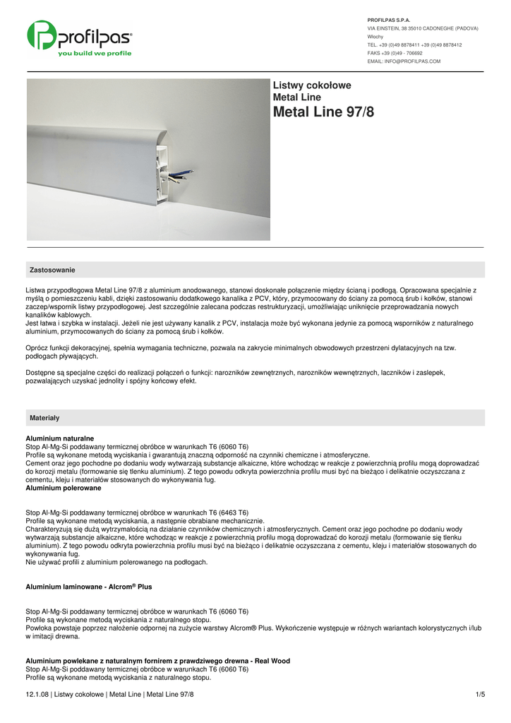 PROFILPAS S.P.A. VIA EINSTEIN, 38 35010 CADONEGHE (PADOVA) Włochy TEL. +39 (0)49 8878411 +39 (0)49 8878412 FAKS +39 (0)49 - 706692 EMAIL: [email protected] Listwy cokołowe Metal Line Metal Line 97/8 Zastosowanie Listwa przypodłogowa Metal Line 97/8 z aluminium anodowanego, stanowi doskonałe połączenie między ścianą i podłogą. Opracowana specjalnie z myślą o pomieszczeniu kabli, dzięki zastosowaniu dodatkowego kanalika z PCV, który, przymocowany do ściany za pomocą śrub i kołków, stanowi zaczep/wspornik listwy przypodłogowej. Jest szczególnie zalecana podczas restrukturyzacji, umożliwiając uniknięcie przeprowadzania nowych kanalików kablowych. Jest łatwa i szybka w instalacji. Jeżeli nie jest używany kanalik z PCV, instalacja może być wykonana jedynie za pomocą wsporników z naturalnego aluminium, przymocowanych do ściany za pomocą śrub i kołków. Oprócz funkcji dekoracyjnej, spełnia wymagania techniczne, pozwala na zakrycie minimalnych obwodowych przestrzeni dylatacyjnych na tzw. podłogach pływających. Dostępne są specjalne części do realizacji połączeń o funkcji: narozników zewnętrznych, narozników wewnętrznych, laczników i zaslepek, pozwalających uzyskać jednolity i spójny końcowy efekt. Materiały Aluminium naturalne Stop Al-Mg-Si poddawany termicznej obróbce w warunkach T6 (6060 T6) Profile są wykonane metodą wyciskania i gwarantują znaczną odporność na czynniki chemiczne i atmosferyczne. Cement oraz jego pochodne po dodaniu wody wytwarzają substancje alkaiczne, które wchodząc w reakcje z powierzchnią profilu mogą doprowadzać do korozji metalu (formowanie się tlenku aluminium). Z tego powodu odkryta powierzchnia profilu musi być na bieżąco i delikatnie oczyszczana z cementu, kleju i materiałów stosowanych do wykonywania fug. Aluminium polerowane Stop Al-Mg-Si poddawany termicznej obróbce w warunkach T6 (6463 T6) Profile są wykonane metodą wyciskania, a następnie obrabiane mechanicznie. Charakteryzują się dużą wytrzymałością na działanie czynników chemicznych i atmosferycznych. Cement oraz jego pochodne po dodaniu wody wytwarzają substancje alkaiczne, które wchodząc w reakcje z powierzchnią profilu mogą doprowadzać do korozji metalu (formowanie się tlenku aluminium). Z tego powodu odkryta powierzchnia profilu musi być na bieżąco i delikatnie oczyszczana z cementu, kleju i materiałów stosowanych do wykonywania fug. Nie używać profili z aluminium polerowanego na podłogach. Aluminium laminowane - Alcrom® Plus Stop Al-Mg-Si poddawany termicznej obróbce w warunkach T6 (6060 T6) Profile są wykonane metodą wyciskania z naturalnego stopu. Powłoka powstaje poprzez nałożenie odpornej na zużycie warstwy Alcrom® Plus. Wykończenie występuje w różnych wariantach kolorystycznych i/lub w imitacji drewna. Aluminium powlekane z naturalnym fornirem z prawdziwego drewna - Real Wood Stop Al-Mg-Si poddawany termicznej obróbce w warunkach T6 (6060 T6) Profile są wykonane metodą wyciskania z naturalnego stopu. 12.1.08 | Listwy cokołowe | Metal Line | Metal Line 97/8 1/5 Powłoka powstaje poprzez nałożenie forniru z różnych gatunków prawdziwego drewna. Profile powlekane Real Wood, w następstwie naturalnego procesu utleniania, stają się ciemniejsze, jeżeli zostaną nałożone lub tylko wystawione na działanie światła. W związku z tym, zaleca się przechowywanie profili w oryginalnym opakowaniu aż do nałożenia. Aluminium powlekane - Skóra Stop Al-Mg-Si poddawany termicznej obróbce w warunkach T6 (6060 T6) Profile są wykonane metodą wyciskania z naturalnego stopu. Powłoka powstaje poprzez nałożenie skóry w różnych odcieniach. Aluminium lakierowane Stop Al-Mg-Si poddawany termicznej obróbce w warunkach T6 (6060 T6) Profile są wykonane metodą wyciskania, a następnie lakierowane. Charakteryzują się dużą wytrzymałością na działanie czynników chemicznych i atmosferycznych, natomiast nie są odporne na przeciążenia mechaniczne, mogące uszkodzić zewnętrzną powłokę. W związku z tym nie zalecamy ich stosowania na podłogach. Odkryta powierzchnia profilu musi być na bieżąco i delikatnie oczyszczana z cementu, kleju i materiałów stosowanych do wykonywania fug. Aluminium anodowane Stop Al-Mg-Si poddawany termicznej obróbce w warunkach T6 (6060 T6) Profile są wykonane metodą wyciskania, a następnie poddawane procesowi anodyzacji. Charakteryzują się dużą wytrzymałością na działanie czynników chemicznych i atmosferycznych. Cement oraz jego pochodne po dodaniu wody wytwarzają substancje alkaiczne, które wchodząc w reakcje z powierzchnią profilu mogą doprowadzać do korozji metalu (formowanie się tlenku aluminium). Z tego powodu odkryta powierzchnia profilu musi być na bieżąco i delikatnie oczyszczana z cementu, kleju i materiałów stosowanych do wykonywania fug. Na skutek zużycia i zadeptywania (w przypadku profili montowanych na podłogach), powierzchnie anodowane ulegają zniszczeniu tracąc w ten sposób oryginalne wykończenie. PVC twarde Związek winylowy PCV, twardy, bezołowiowy, odporny na uderzenia, samogasnący. Stabilizowany, ekologiczny, na bazie soli Ca-Zn. Ogólne uwagi na temat metali Aluminium nie jest odporna na wszystkie związki chemiczne, w związku z czym nie należy dopuścić do tego, aby miała kontakt ze szczególnie agresywnymi substancjami, takimi jak kwas solny (HCl) i kwas fosforowy (H3PO4). Produkty stosowane do czyszczenia kamieni, ceramiki i gresu, takie jak na przykład kwas solny, amoniak, wybielacz lub podchloryn sodu, mogą w silnym stopniu wywoływać korozję. Ponadto zawsze należy w miarę możliwości jak najszybciej i jak najdelikatniej usuwać z powierzchni profili pozostałości cementu, kleju i materiałów stosowanych do wykonywania fug. Montaż Układanie na aluminiowe wsporniki Wyjąć listwę przypodłogową z opakowania. Jeżeli na wyrobie znajduje się zabezpieczenie (folia zabezpiec