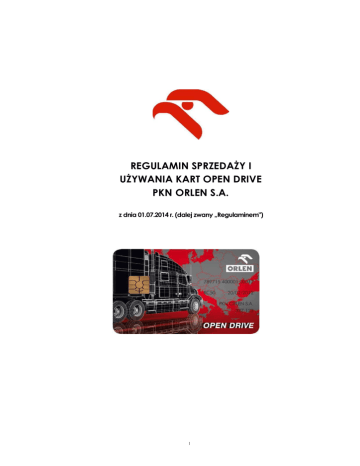 REGULAMIN SPRZEDAŻY I UŻYWANIA KART OPEN DRIVE PKN ORLEN S.A. z dnia 01.07.2014 r. (dalej zwany „Regulaminem") 1 I. Zakres obowiązywania Regulaminu Sprzedaży i Używania Kart OPEN DRIVE PKN ORLEN S.A. z dnia 01.07.2014 r. Niniejszy Regulamin obowiązuje w zakresie realizacji Transakcji Bezgotówkowych (zgodnie z definicją poniżej) przy użyciu Kart OPEN DRIVE (zgodnie z definicją poniżej) na Zagranicznych Stacjach Paliw oraz Krajowych Stacjach Paliw (zgodnie z definicją poniżej). Ideą programu Kart OPEN DRIVE jest umożliwienie Flocie (zgodnie z definicją poniżej) bezgotówkowego zaopatrywania się, przy użyciu Kart OPEN DRIVE w paliwa i inne produkty na stacjach paliw opatrzonych następującymi znakami towarowymi (dalej „Stacje Paliw"): a. w Polsce: ORLEN, BLISKA (dalej „Krajowe Stacje Paliw") b. w Niemczech: Star (dalej zwane „Stacje Paliw w Niemczech") c. w Czechach: BENZINA, BENZINA Plus (w przyszłości: ORLEN i STAR) (dalej „Stacje Paliw w Czechach") - z wyłączeniem stacji wymienionych w Załączniku nr 3. d. na Litwie: ORLEN Lietuva (w przyszłości: ORLEN) (dalej „Stacje Paliw na Litwie"). Stacje paliw, o których mowa w lit. b) - d) zwane są dalej łącznie „Zagranicznymi Stacjami Paliw". Karta OPEN DRIVE uprawnia także Flotę do dokonywania zakupu usług na Krajowych Stacjach Paliw a w przyszłości także na Zagranicznych Stacjach Paliw. Każda Transakcja Bezgotówkowa dokonania na Zagranicznych Stacjach Paliw oraz na Krajowych Stacjach Paliw będzie rejestrowana w PKN ORLEN S.A. a następnie rozliczana po zakończeniu przyjętego Okresu Rozliczeniowego (zgodnie z definicją poniżej). II. Definicje Przez użyte w niniejszym Regulaminie słowa i wyrażenia należy rozumieć: 1. AB „Ventus Nafta", VN - oznacza spółkę prawa litewskiego, z siedzibą w Wilnie, adres: ul. J.Jasinskio g. 16B, 01112 Wilno, wpisaną do Rejestru Przedsiębiorców pod numerem 1 66920025; 2. AdBlue - wodny roztwór mocznika redukujący szkodliwe cząstki spalin, stosowany w wysokoprężnych silnikach diesla najnowszej generacji. AdBlue jest nietoksyczny, bezwonny, bezbarwny, bezpieczny dla otoczenia i przyjazny dla środowiska; 3. Aneks - oznacza Aneks o wydanie i używanie Kart OPEN DRIVE zawarty między Flotą a PKN ORLEN S.A. (działającym we własnym imieniu oraz imieniu OD, Benzina oraz VN), którego integralną cześć stanowi niniejszy Regulamin; 4. Benzina - oznacza UNIPETROL RPA, s.r.o., spółkę prawa czeskiego, z siedzibą w miejscowości Litvinov, adres: Litvínov – Záluží 1, kod pocztowy 43670, wpisana do Rejestru Handlowego prowadzonego przez Sąd Rejonowy w Usti nad Labem w Sekcji C, pod nr. sygn.. 24430, z numerem identyfikacyjnym: 27597075, reprezentowana przez swój oddział: UNIPETROL RPA, s.r.o. – Benzina, odštěpný závod, adres: ul. Na Pankraci 1683/127, 140-00 Praga, wpisana do Rejestru Handlowego prowadzonego przez Sąd Miejski w Pradze w Sekcji A pod numerem sygn. 77321; 5. BIO 85 - jest to paliwo będące mieszaniną benzyny z bioetanolem. BIO 85 może być używane tylko w specjalnie przystosowanych do tego paliwa pojazdach z silnikiem typu FFV (Flexible Fuel Vehicle). osoby, które decydują się na tankowanie BIO 85, powinni sprawdzić możliwość jego zastosowania u producenta pojazdu. PKN ORLEN S.A. nie ponosi odpowiedzialności za skutki zastosowania BIO 85 w pojazdach nie przystosowanych do używania tego rodzaju paliwa; 6. BIO 100 - paliwo produkowane na bazie olejów roślinnych, przeznaczone do pojazdów z silnikiem DIESLA, spełniające polskie i europejskie normy dla biopaliw ciekłych. Może być stosowane, jako dodatek albo zamiast tradycyjnego oleju napędowego w samochodach ciężarowych i osobowych oraz pojazdach specjalnych. Osoby, które decydują się na tankowanie BIO 100, powinny sprawdzić możliwość jego zastosowania u producenta pojazdu. PKN ORLEN S.A. nie ponosi odpowiedzialności za skutki zastosowania BIO 100 w pojazdach nie przystosowanych do używania tego rodzaju paliwa; 7. Dział Sprzedaży Kart Flotowych - komórka organizacyjna PKN ORLEN S.A., której zadaniem jest Obsługa Kart OPEN DRIVE; 8. Data Wymagalności - oznacza dzień, w którym dana Wierzytelność staje się wymagalna (ostatni dzień wskazanego na fakturze sprzedaży terminu płatności); 9. Dni Robocze - wszystkie dni za wyjątkiem sobót, niedziel oraz innych dni ustawowo wolnych od pracy w kraju siedziby Spółki GK; 10. Flota - klient, z którym PKN ORLEN S.A. zawarł Aneks o wydanie i używanie Kart OPEN DRIVE 11. Infolinia - całodobowa obsługa Floty Programu OPEN DRIVE dostępna pod numerem telefonu +48 501 235 682; 12. Karta OPEN DRIVE typu „S" - karta paliwowa na numer rejestracyjny pojazdu Floty; 13. Karty OPEN DRIVE - karty paliwowe PKN ORLEN S.A., oznaczone symbolem OPEN DRIVE na awersie, wydane Flocie przez PKN ORLEN S.A. na podstawie zawartego Aneksu: a) Karta Nowa - to karta na nowy numer rejestracyjny pojazdu lub nowego użytkownika, b) Karta Wznowiona - to karta wymieniona przez PKN ORLEN S.A. po upływie terminu ważności dotychczas używanej karty, c) Karta Zamienna - to duplikat karty wydany w wyniku zmiany danych na karcie, zagubienia, zniszczenia lub zablokowania PIN-em; 14. Kategorie Zakupowe - oznacza wszystkie Produkty i Usługi dostępne w sieci Stacji Paliw Spółek GK podzielone na 6 grup (Załącznik nr 2); 15. Krajowe Stacje Paliw - zgodnie z definicją zawarta w pkt. I powyżej Regulaminu; 16. Limit Kredytowy - maksymalna wysokość kredytu kupieckiego przyznanego przez PKN ORLEN S.A., do wysokości, której Flota może dokonywać Transakcji Bezgotówkowych przy użyciu Kart OPEN DRIVE na Zagranicznych Stacjach Paliw oraz Krajowych Stacjach Paliw; 17. Limit Karty OPEN DRIVE - oznacza maksymalny, dzienny limit zakupu produktów i usług (według odpowiedniej Kategorii Zakupowej) przypisany do Karty OPEN DRIVE wyrażony wartościowo; 18. Login przypisanych (z ang.) danemu - nazwa Użytkownikowi stos